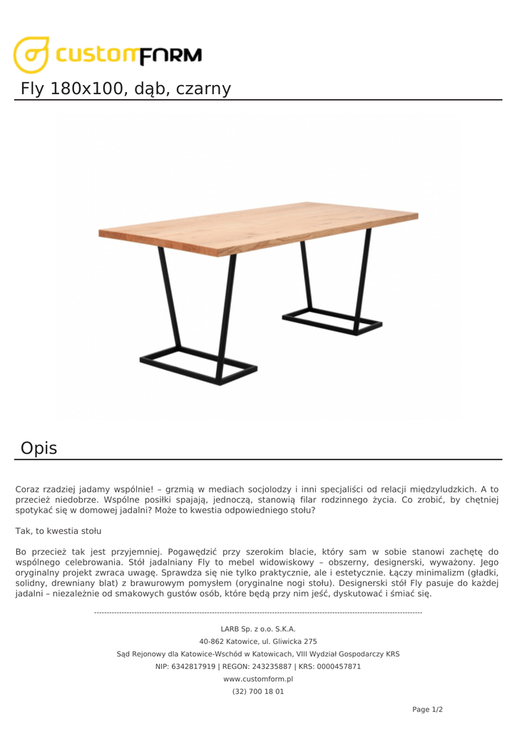 Fly 180x100, dąb, czarny Opis Coraz rzadziej jadamy wspólnie! – grzmią w mediach socjolodzy i inni specjaliści od relacji międzyludzkich. A to przecież niedobrze. Wspólne posiłki spajają, jednoczą, stanowią filar rodzinnego życia. Co zrobić, by chętniej spotykać się w domowej jadalni? Może to kwestia odpowiedniego stołu? Tak, to kwestia stołu Bo przecież tak jest przyjemniej. Pogawędzić przy szerokim blacie, który sam w sobie stanowi zachętę do wspólnego celebrowania. Stół jadalniany Fly to mebel widowiskowy – obszerny, designerski, wyważony. Jego oryginalny projekt zwraca uwagę. Sprawdza się nie tylko praktycznie, ale i estetycznie. Łączy minimalizm (gładki, solidny, drewniany blat) z brawurowym pomysłem (oryginalne nogi stołu). Designerski stół Fly pasuje do każdej jadalni – niezależnie od smakowych gustów osób, które będą przy nim jeść, dyskutować i śmiać się. ----------------------------------------------------------------------------------------------------------------------------------LARB Sp. z o.o. S.K.A. 40-862 Katowice, ul. Gliwicka 275 Sąd Rejonowy dla Katowice-Wschód w Katowicach, VIII Wydział Gospodarczy KRS NIP: 6342817919 | REGON: 243235887 | KRS: 0000457871 www.customform.pl (32) 700 18 01 Page 1/2 Dostępne kolory podstawy można zobaczyć na stronie w "RAL - paleta kolorów" . Przy zamówieniu proszę podać kod koloru!!! Specyfikacja Wysokość 74 cm Szerokość 100 cm Długość 180 cm Podstawa metal malowany proszkowo Blat klejonka dębowa lakierowana Dodatkowe zdjęcia ----------------------------------------------------------------------------------------------------------------------------------LARB Sp. z o.o. S.K.A. 40-862 Katowice, ul. Gliwicka 275 Sąd Rejonowy dla Katowice-Wschód w Katowicach, VIII Wydział Gospodarczy KRS NIP: 6342817919 | REGON: 243235887 | KRS: 0000457871 www.customform.pl (32) 700 18 01 Page 2/2 Powered by TCPDF (www.tcpdf.org)