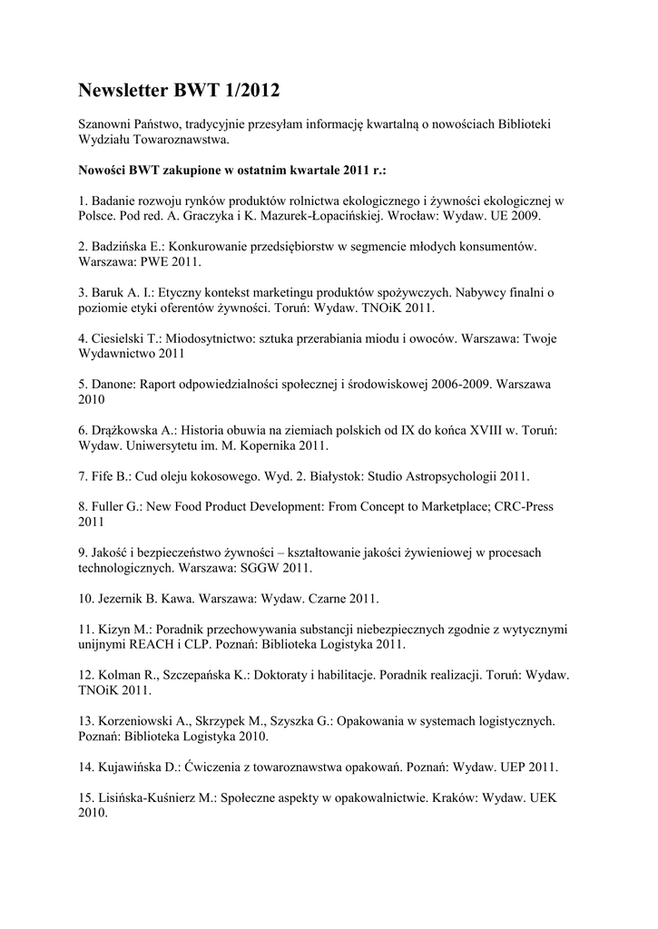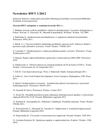 Newsletter BWT 1/2012 Szanowni Państwo, tradycyjnie przesyłam informację kwartalną o nowościach Biblioteki Wydziału Towaroznawstwa. Nowości BWT zakupione w ostatnim kwartale 2011 r.: 1. Badanie rozwoju rynków produktów rolnictwa ekologicznego i żywności ekologicznej w Polsce. Pod red. A. Graczyka i K. Mazurek-Łopacińskiej. Wrocław: Wydaw. UE 2009. 2. Badzińska E.: Konkurowanie przedsiębiorstw w segmencie młodych konsumentów. Warszawa: PWE 2011. 3. Baruk A. I.: Etyczny kontekst marketingu produktów spożywczych. Nabywcy finalni o poziomie etyki oferentów żywności. Toruń: Wydaw. TNOiK 2011. 4. Ciesielski T.: Miodosytnictwo: sztuka przerabiania miodu i owoców. Warszawa: Twoje Wydawnictwo 2011 5. Danone: Raport odpowiedzialności społecznej i środowiskowej 2006-2009. Warszawa 2010 6. Drążkowska A.: Historia obuwia na ziemiach polskich od IX do końca XVIII w. Toruń: Wydaw. Uniwersytetu im. M. Kopernika 2011. 7. Fife B.: Cud oleju kokosowego. Wyd. 2. Białystok: Studio Astropsychologii 2011. 8. Fuller G.: New Food Product Development: From Concept to Marketplace; CRC-Press 2011 9. Jakość i bezpieczeństwo żywności – kształtowanie jakości żywieniowej w procesach technologicznych. Warszawa: SGGW 2011. 10. Jezernik B. Kawa. Warszawa: Wydaw. Czarne 2011. 11. Kizyn M.: Poradnik przechowywania substancji niebezpiecznych zgodnie z wytycznymi unijnymi REACH i CLP. Poznań: Biblioteka Logistyka 2011. 12. Kolman R., Szczepańska K.: Doktoraty i habilitacje. Poradnik realizacji. Toruń: Wydaw. TNOiK 2011. 13. Korzeniowski A., Skrzypek M., Szyszka G.: Opakowania w systemach logistycznych. Poznań: Biblioteka Logistyka 2010. 14. Kujawińska D.: Ćwiczenia z towaroznawstwa opakowań. Poznań: Wydaw. UEP 2011. 15. Lisińska-Kuśnierz M.: Społeczne aspekty w opakowalnictwie. Kraków: Wydaw. UEK 2010. 16. McCann J., Bryson D.: Smart clothes and wearable technology. Oxford etc.: Woodhead Pulishing Limited 2009. 17. Mięso. Podstawy nauki i technologii. Red. Nauk. A. Pisula, E Pośpiech. Warszawa: SGGW 2011. 18. Molenda J.: Rośliny, które zmieniły świat. Poznań: Replika 2011 19. Nestoruk I.B.: Prawo konsumenckie w Polsce i Unii Europejskiej. Testy, kazusy, tablice. Warszawa: Wydaw. C.H. Beck 2011. 20. Nowości w uprawie winorośli i produkcji win. Ogólnopolska Konferencja Winiarska. Red. I. Wojewoda. Sulechów: Oficyna Wydawnicza PWSZ 2010. 21. Odzysk i recykling materiałów polimerowych. Red. Nauk. J. Kijeński, A.K. Łędzki, R. Jeziórska. Warszawa: PWN 2011. 22. Palność polimerów i materiałów polimerowych. Warszawa: WNT 2007. 23. Poradnik dotyczący NORMY ISO 22000:2006 Systemy Zarządzanie Bezpieczeństwem Żywności – wymagania dla wszystkich organizacji w łańcuchu dostaw. Warszawa: LAARDO 2010 24. Poradnik Gospodarowania Odpadami – aktualizacja październik 2011 25. Pradeep A.K.: Mózg na zakupach. Neuromarketing. Gliwice: Wydaw. HELION 2011 26. Słowiński B.: Zarządzanie i inżynieria jakości. Koszalin: Wydawnictwo Politechniki Koszalińskiej 2011. 27. Szostak-Kot J.: Mikrobiologia produktów. Kraków: Wydaw. UEK 2010. 28. Skolik A. Smak w analizie sensorycznej. Poznań: UEP 2011 29. Taubman J.: Węgiel i alternatywne źródła energii. Warszawa: PWN. 2011 30. Wiśniewska M., Malinowska E.: Zarządzanie jakością żywności. Systemy, koncepcje, instrumenty. Warszawa: DIFIN 2011. 31. Wybrane aspekty zarządzania jakością. Pod red. M. Salerno-Kochana. Kraków: Wydaw. UEK 2007 32. Wybrane aspekty zarządzania jakością. Pod red. M. Salerno-Kochana. Kraków: Wydaw. UEK 2011. Pełna lista tytułów zakupionych do BWT w 2011 r. na stronie: http://kangur.uek.krakow.pl/biblioteka/bwt/Ksiazki_zakupione_w_2011.pdf W aktualnym wydaniu Biuletynu Informacyjnego Biblioteki Głównej, studentom WT polecam artykuł: Pełnotekstowa baza danych Science Direct dla Towaroznawców http://kangur.uek.krakow.pl/biblioteka/biuletyn/artykuly.php?Strona=Art&Wybor=38&Art=a _science_direct Zapraszam grupy seminaryjne (inżynierskie i magisterskie) na zajęcia z Informacji Naukowej. W 2011 r. z zajęć skorzystało 16 grup seminaryjnych, zarówno studentów dziennych jak i zaocznych. Polecam studentom i pracownikom subskrypcje naszego konta na Facebook’u Tutaj studenci mają możliwość śledzić ciekawe artykuły o profilu towaroznawczym, linki do internetowych źródeł informacji, mieć wpływ na zakup nowości książkowych BWT oraz zadawać zapytania dotyczące pomocy przy zbieraniu literatury do pracy dyplomowej. Jeśli macie Państwo jakieś sugestie dotyczące zakupu książek i czasopism bardzo proszę o kontakt: [email protected] Oto lista książek zakupionych w styczniu 2012: 1. Adamczak S., Makieła W.: Podstawy metrologii i inżynierii jakości dla mechaników. Ćwiczenia praktyczne. Warszawa: WNT 2010 2. Bendkowski J., Radziejewska G.: Logistyka zaopatrzenia w przedsiębiorstwie. Gliwice: PŚ 2011 3. Bruce B.: Historia smaku. Warszawa: Carta Blanca 2011 4. Doskonalenie sformalizowanych systemów zarządzania. Redakcja naukowa Tadeusz Borys, Piotr Rogala. Warszawa: Difin 2011 5. Fabiszewski R., Kranc R.: Sensoryka. Układy somatosensoryczne. Podręcznik dla studentów studiów magisterskich na kierunku kosmetologia i fizjoterapia. Wrocław: Medpharm 2011 6. Fey H., Petsitis X.: Słownik kosmetyczny. Wrocław: Medpharm 2011 7. Gajdzik B., Wyciślik A.: Jakość, środowisko i bezpieczeństwo pracy w zarządzaniu przedsiębiorstwem. Gliwice: PŚ 2010 8. Gospodarka odpadami niebezpiecznymi. Materiały do zajęć laboratoryjnych. Gliwice: PŚ 2010 9. Grodecka M.: Wegetarianizm. Zmierzch świadomości łowcy. Warszawa: Wydaw. TEDSON 2009 10. Jaracz B.: ABC sprzedawcy. Krosno: Wydaw. KaBe 2011 11. Kasperek A., Kondratowicz M.: Wyposażenie zakładów gastronomicznych i gospodarstw domowych. Warszawa: Wydaw. REA 2011 12. Kozłowska-Wojciechowska M., Bosacka K.: Czy wiesz co jesz? Poradnik konsumenta. Poznań: Publicat 2011 13. Kubiński W.: Materiałoznawstwo.