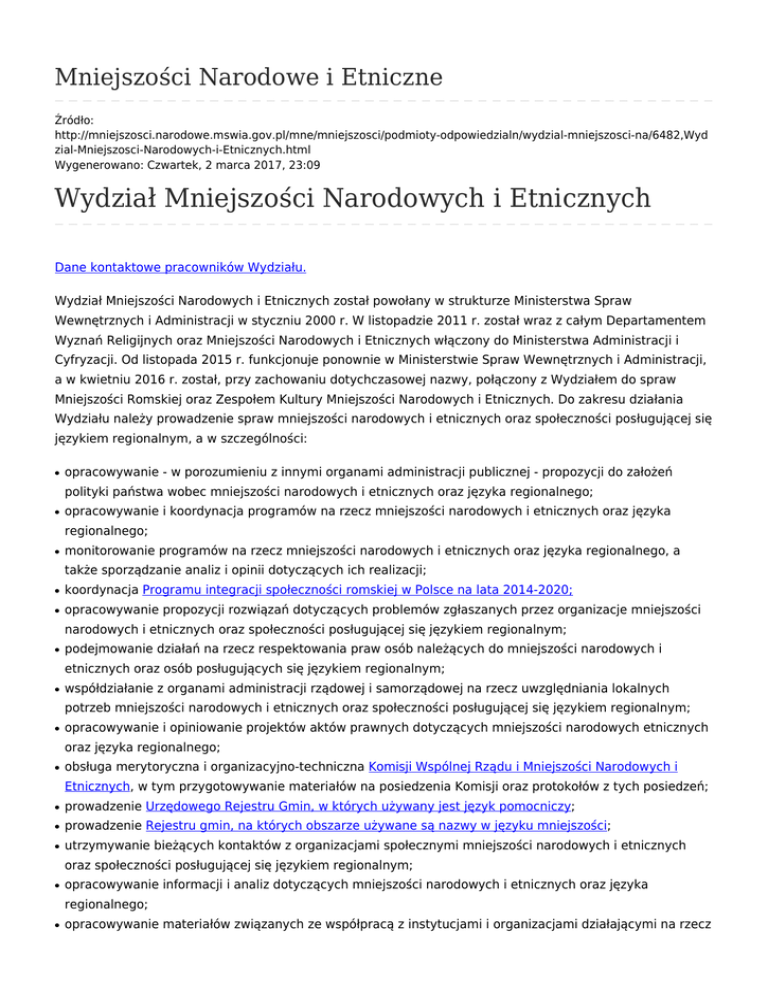 Mniejszości Narodowe i Etniczne Źródło: http://mniejszosci.narodowe.mswia.gov.pl/mne/mniejszosci/podmioty-odpowiedzialn/wydzial-mniejszosci-na/6482,Wyd zial-Mniejszosci-Narodowych-i-Etnicznych.html Wygenerowano: Czwartek, 2 marca 2017, 23:09 Wydział Mniejszości Narodowych i Etnicznych Dane kontaktowe pracowników Wydziału. Wydział Mniejszości Narodowych i Etnicznych został powołany w strukturze Ministerstwa Spraw Wewnętrznych i Administracji w styczniu 2000 r. W listopadzie 2011 r. został wraz z całym Departamentem Wyznań Religijnych oraz Mniejszości Narodowych i Etnicznych włączony do Ministerstwa Administracji i Cyfryzacji. Od listopada 2015 r. funkcjonuje ponownie w Ministerstwie Spraw Wewnętrznych i Administracji, a w kwietniu 2016 r. został, przy zachowaniu dotychczasowej nazwy, połączony z Wydziałem do spraw Mniejszości Romskiej oraz Zespołem Kultury Mniejszości Narodowych i Etnicznych. Do zakresu działania Wydziału należy prowadzenie spraw mniejszości narodowych i etnicznych oraz społeczności posługującej się językiem regionalnym, a w szczególności: ● opracowywanie - w porozumieniu z innymi organami administracji publicznej - propozycji do założeń polityki państwa wobec mniejszości narodowych i etnicznych oraz języka regionalnego; ● opracowywanie i koordynacja programów na rzecz mniejszości narodowych i etnicznych oraz języka regionalnego; ● monitorowanie programów na rzecz mniejszości narodowych i etnicznych oraz języka regionalnego, a także sporządzanie analiz i opinii dotyczących ich realizacji; ● koordynacja Programu integracji społeczności romskiej w Polsce na lata 2014-2020; ● opracowywanie propozycji rozwiązań dotyczących problemów zgłaszanych przez organizacje mniejszości narodowych i etnicznych oraz społeczności posługującej się językiem regionalnym; ● podejmowanie działań na rzecz respektowania praw osób należących do mniejszości narodowych i etnicznych oraz osób posługujących się językiem regionalnym; ● współdziałanie z organami administracji rządowej i samorządowej na rzecz uwzględniania lokalnych potrzeb mniejszości narodowych i etnicznych oraz społeczności posługującej się językiem regionalnym; ● opracowywanie i opiniowanie projektów aktów prawnych dotyczących mniejszości narodowych etnicznych oraz języka regionalnego; ● obsługa merytoryczna i organizacyjno-techniczna Komisji Wspólnej Rządu i Mniejszości Narodowych i Etnicznych, w tym przygotowywanie materiałów na posiedzenia Komisji oraz protokołów z tych posiedzeń; ● prowadzenie Urzędowego Rejestru Gmin, w których używany jest język pomocniczy; ● prowadzenie Rejestru gmin, na których obszarze używane są nazwy w języku mniejszości; ● utrzymywanie bieżących kontaktów z organizacjami społecznymi mniejszości narodowych i etnicznych oraz społeczności posługującej się językiem regionalnym; ● opracowywanie informacji i analiz dotyczących mniejszości narodowych i etnicznych oraz języka regionalnego; ● opracowywanie materiałów związanych ze współpracą z instytucjami i organizacjami działającymi na rzecz mniejszości narodowych i etnicznych oraz języka regionalnego w ramach Komisji Europejskiej, Rady Europy oraz Organizacji Bezpieczeństwa i Współpracy w Europie; ● opracowywanie materiałów do projektu ustawy budżetowej w zakresie spraw mniejszości narodowych i etnicznych oraz języka regionalnego oraz koordynowanie przygotowywania materiałów do projektu ustawy budżetowej w zakresie właściwości Departamentu; ● koordynowanie monitorowania wykonania budżetu państwa w części 43 - Wyznania religijne oraz mniejszości narodowe i etniczne oraz monitorowanie realizacji rezerw celowych w ramach budżetu państwa pozostających w kompetencji ministra właściwego do sprawach wyznań religijnych oraz mniejszości narodowych i etnicznych; ● koordynowanie współpracy z komórką organizacyjną Ministerstwa Spraw Wewnętrznych i Administracji właściwą w sprawach finansów w zakresie obsługi finansowo-księgowej części 43 budżetu państwa Wyznania religijne oraz mniejszości narodowe i etniczne oraz rezerw celowych w ramach budżetu państwa pozostających w kompetencji ministra właściwego do sprawach wyznań religijnych oraz mniejszości narodowych i etnicznych; ● obsługa merytoryczna oraz udział w posiedzeniach i pracach polsko-niemieckiego Okrągłego Stołu; ● przygotowywanie oraz udostępnianie zasobów informacyjnych w Centralnym Repozytorium Informacji Publicznej w zakresie informacji dotyczących mniejszości narodowych i etnicznych; ● prowadzenie spraw związanych z podziałem i przekazywaniem dotacji na zadania mające na celu zachowanie i rozwój tożsamości kulturowej mniejszości narodowych i etnicznych oraz zachowanie i rozwój języka regionalnego, a w szczególności: a) opracowywanie projektów informacji dotyczących podziału i przekazywania dotacji na zadania, b) dokonywanie oceny wniosków na realizację zadań, c) udziat w pracach komisji dokonującej wyboru wniosków o udzielenie dotacji na realizację zadań, d) opracowywanie, na podstawie protokołów z posiedzeń komisji dokonującej wyboru wniosków o udzielenie dotacji na realizację zadań; ● przygotowywanie projektów umów na realizację zadań; ● prowadzenie baz danych dotyczących dotacji na zadania mające na celu zachowanie i rozwój tożsamości kulturowej mniejszości narodowych i etnicznych oraz zachowanie i rozwój języka regionalnego; ● ocenianie pod względem formalnym i merytorycznym realizacji zadań, na które zostały przyznane dotacje; ● prowadzenie spraw związanych z archiwizowaniem dokumentacji Wydziału; ● udzielanie odpowiedzi i wyjaśnień dotyczących przepisów aktów prawnych pozostających w zakresie właściwości Wydziału; ● przygotowywanie oraz udostępnianie zasobów informacyjnych w Centralnym Repozytorium Informa