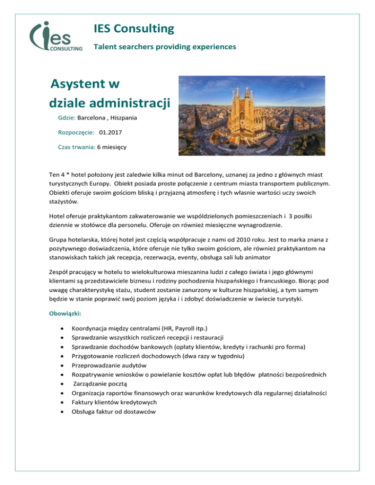 IES Consulting Talent searchers providing experiences Asystent w dziale administracji Gdzie: Barcelona , Hiszpania Rozpoczęcie: 01.2017 Czas trwania: 6 miesięcy Ten 4 * hotel położony jest zaledwie kilka minut od Barcelony, uznanej za jedno z głównych miast turystycznych Europy. Obiekt posiada proste połączenie z centrum miasta transportem publicznym. Obiekti oferuje swoim gościom bliską i przyjazną atmosferę i tych własnie wartości uczy swoich stażystów. Hotel oferuje praktykantom zakwaterowanie we wspóldzielonych pomieszczeniach i 3 posiłki dziennie w stołówce dla personelu. Oferuje on również miesięczne wynagrodzenie. Grupa hotelarska, której hotel jest częścią współpracuje z nami od 2010 roku. Jest to marka znana z pozytywnego doświadczenia, które oferuje nie tylko swoim gościom, ale również praktykantom na stanowiskach takich jak recepcja, rezerwacja, eventy, obsługa sali lub animator Zespół pracujący w hotelu to wielokulturowa mieszanina ludzi z całego świata i jego głównymi klientami są przedstawiciele biznesu i rodziny pochodzenia hiszpańskiego i francuskiego. Biorąc pod uwagę charakterystykę stażu, student zostanie zanurzony w kulturze hiszpańskiej, a tym samym będzie w stanie poprawić swój poziom języka i i zdobyć doświadczenie w świecie turystyki. Obowiązki: Koordynacja między centralami (HR, Payroll itp.) Sprawdzanie wszystkich rozliczeń recepcji i restauracji Sprawdzanie dochodów bankowych (opłaty klientów, kredyty i rachunki pro forma) Przygotowanie rozliczeń dochodowych (dwa razy w tygodniu) Przeprowadzanie audytów Rozpatrywanie wniosków o powielanie kosztów opłat lub błędów płatności bezpośrednich Zarządzanie pocztą Organizacja raportów finansowych oraz warunków kredytowych dla regularnej działalności Faktury klientów kredytowych Obsługa faktur od dostawców Poszukiwany profil: Umiejętności komunikacyjne Doskonała organizacja, dbałość o szczegóły Zaawansowana znajomość programu Excel Doświadczenie w finansach będzie dużym plusem Studia: Finanse, Administracja, Ekonomia Poziom językowy: Hiszpański poziom B2 Oferujemy: Wynagrodzenie 235€/miesięcznie + zakwaterowanie + wyżywienie Aplikuj teraz! Prześlij nam swoje CV w wersji angielskiej na [email protected] lub zarejestruj się na naszej stronie internetowej: http://www.ies-consulting.pl/formularz_dla_studenta.php