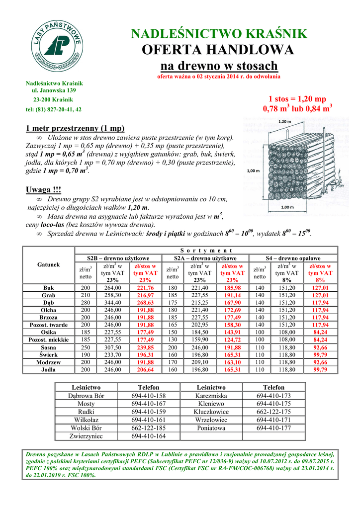 NADLEŚNICTWO KRAŚNIK OFERTA HANDLOWA na drewno w stosach oferta ważna o 02 stycznia 2014 r. do odwołania Nadleśnictwo Kraśnik ul. Janowska 139 1 stos = 1,20 mp 0,78 m3 lub 0,84 m3 23-200 Kraśnik tel: (81) 827-20-41, 42 1 metr przestrzenny (1 mp) • Ułożone w stos drewno zawiera puste przestrzenie (w tym korę). Zazwyczaj 1 mp = 0,65 mp (drewno) + 0,35 mp (puste przestrzenie), stąd 1 mp = 0,65 m3 (drewna) z wyjątkiem gatunków: grab, buk, świerk, jodła, dla których 1 mp = 0,70 mp (drewno) + 0,30 (puste przestrzenie), gdzie 1 mp = 0,70 m3. Uwaga !!! • Drewno grupy S2 wyrabiane jest w odstopniowaniu co 10 cm, najczęściej o długościach wałków 1,20 m. • Masa drewna na asygnacie lub fakturze wyrażona jest w m3, ceny loco-las (bez kosztów wywozu drewna). • Sprzedaż drewna w Leśnictwach: środy i piątki w godzinach 800 – 1000, wydatek 800 – 1500. Gatunek Buk Grab Dąb Olcha Brzoza Pozost. twarde Osika Pozost. miekkie Sosna Świerk Modrzew Jodła S2B – drewno użytkowe zł/m3 w zł/stos w zł/m3 tym VAT tym VAT netto 23% 23% 200 264,00 221,76 210 258,30 216,97 280 344,40 268,63 200 246,00 191,88 200 246,00 191,88 200 246,00 191,88 185 227,55 177,49 185 227,55 177,49 250 307,50 239,85 190 233,70 196,31 200 246,00 191,88 200 246,00 206,64 Leśnictwo Dąbrowa Bór Mosty Rudki Wilkołaz Wolski Bór Zwierzyniec Telefon 694-410-158 694-410-167 694-410-159 694-410-161 662-122-185 694-410-164 S o r t y m e n t S2A – drewno użytkowe zł/m3 w zł/stos w zł/m3 tym VAT tym VAT netto 23% 23% 180 221,40 185,98 185 227,55 191,14 175 215,25 167,90 180 221,40 172,69 185 227,55 177,49 165 202,95 158,30 150 184,50 143,91 130 159,90 124,72 200 246,00 191,88 160 196,80 165,31 170 209,10 163,10 160 196,80 165,31 Leśnictwo Karczmiska Kleniewo Kluczkowice Wrzelowiec Poniatowa S4 – drewno opałowe zł/m3 w zł/stos w zł/m3 tym VAT tym VAT netto 8% 8% 140 151,20 127,01 140 151,20 127,01 140 151,20 117,94 140 151,20 117,94 140 151,20 117,94 140 151,20 117,94 100 108,00 84,24 100 108,00 84,24 110 118,80 92,66 110 118,80 99,79 110 118,80 92,66 110 118,80 99,79 Telefon 694-410-173 694-410-175 662-122-175 694-410-171 694-410-177 Drewno pozyskane w Lasach Państwowych RDLP w Lublinie o prawidłowo i racjonalnie prowadzonej gospodarce leśnej, zgodnie z polskimi kryteriami certyfikacji PEFC (Subcertyfikat PEFC nr 12/036-9) ważny od 10.07.2012 r. do 09.07.2015 r. PEFC 100% oraz międzynarodowymi standardami FSC (Certyfikat FSC nr RA-FM/COC-006768) ważny od 23.01.2014 r. do 22.01.2019 r. FSC 100%.