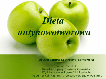 Dieta antynowotworowa Dr Aleksandra Kostrzewa-Tarnowska Zakład Dietetyki Katedra Higieny Żywienia Człowieka Wydział Nauk o Żywności i Żywieniu Akademia Rolnicza im. A. Cieszkowskiego w Poznaniu Przyczyny powstawania nowotworów: Palenie tytoniu (30%) Alkohol Sposób żywienia (35%) Ekspozycja zawodowa Zanieczyszczenia środowiska Leki medyczne Czynniki infekcyjne Naturalne czynniki geofizyczne Skłonności genetyczne Chemioprewencja nowotworów Chemioprewencja [łac. praeventio = zapobieganie] Profilaktyczne stosowanie u ludzi niektórych leków, witamin oraz nietoksycznych, naturalnych substancji żywieniowych (składników diety) lub/oraz specyfików farmakologicznych, celem zatrzymania lub wywołania regresji powstawania zmian i komórek przedrakowych, zarówno w początkowych, jak i dalszych etapach procesu nowotworowego, tzn. inicjacji i progresji raka. • Chemioprewencja pierwotna • Chemioprewencja wtórna Ogólny schemat wieloetapowości procesu kancerogenezy indukowanej kancerogenami obecnymi w żywności Etap I Aktywacja Etap II Inicjacja Aktywacja metaboliczna Enzymy fazy I Detoksykacja Enzymy fazy II Aktywny kancerogen Naprawa DNA Addukty DNA Etap III Promocja Etap IV Progresja Pro-kancerogen Mutacje Transformacja nowotworowa Onkogeny Geny supresji raka Nowotwory Biotransformacja ksenobiotyków – źródło mutagenów i kancerogenów Reakcja I fazy – tworzenie związków pośrednich w procesach utleniania, redukcji i hydrolizy. Enzymy I fazy odtruwania (detoksykacji): Oksydoreduktazy i hydrolazy: monooksygenazy związane z aktywnością cytochromu P450; Reakcje II fazy – tworzenie produktów końcowych sprzężonych z kwasem glukuronowym, siarkowym, glutationem, glicyną, które ulegają acetylacji bądź metylacji. Enzymy II fazy odtruwania: Transferazy (np. UDP-glukuronylotrnsferaza); Enzymy cytozolowe (S-transferaza glutationowa, sulfotranferaza) Wpływ żywienia na rozwój nowotworów 1. Występowanie związków rakotwórczych (natywnych bądź w formie dodatków) w spożywanych pokarmach 2. Związki nie kancerogenne występujące w żywności podczas trawienia, metabolizmu komórkowego, przetwórstwa zostają przetworzone na substancje rakotwórcze 3. Składniki diety mogą wpływać na rozwój nowotworów przez zmianę pokarmowego środowiska wewnętrznego przewodu Typy zaburzeń w chorobie nowotworowej Niedożywienie (utrata łaknienia i trudności w przyjmowaniu pokarmu, biegunki i wymioty); Niedrożność przewodu pokarmowego Zespół upośledzonego wchłaniania Zaburzenia gospodarki wodno-elektrolitowej Zmiana odczuwania smaku i powonienia Zaburzenia w odczuwaniu smaku słodkiego, gorzkiego i kwaśnego; Zaburzenia metaboliczne: upośledzenie syntezy białek ustrojowych, zaburzenia tolerancji glukozy, zaburzenia przemian składników mineralnych Chemioprewencja, a wolne rodniki Mechanizmy obronne organizmu: 1. Przeciwutleniacze w żywności: witaminy antyoksydacyjne (C i E, β-karoten), ubichinon Q10; składniki mineralne ( selen, cynk, mangan, miedź, magnez); związki biologicznie czynne – wtórne metabolity roślinne (likopen, luteina, kryptoksantyna, rutyna, tanina); 2. Enzymy neutralizujące w organizmie wytwarzane przez mDNA: peroksydaza glutationowa GPX; reduktaza glutationu GRD; dysmutaza nadtlenkowa SOD; katalaza; Składniki mineralne i witaminy Składniki mineralne/ witaminy Układ odpornościowy Dawka 15 – 20 mg Cynk Ograniczenie aktywności limfocytów i monocytów Żelazo Redukcja fagocytozy; cytotoksyczności monocytów, Nadmiar sprzyja tworzeniu wolnych rodników Witamina C Środek antyhistaminowy 60 - 100 mg Witamina E Obniża funkcje cytotoksyczne monocytów; 12 – 18 j.m Witamina A Redukcja liczby komórek cytoplazmatycznych Kwas foliowy Regulacja ekspresji genów, blokuje dysplazję 15 mg 2700 – 3700 j.m 180 – 300 µg Związki biologicznie czynne Klasyfikacja – oparta na sile i etapie działania: „blocking agents” – zapobiegają przemianie nieaktywnego kancerogenu lub aktywacja systemu enzymatycznego (niszczenie komórek kancerogennych) „supperssing agents” – inhibitory proteaz, terpeny cykliczne, izotiocyyjaniany Związki czynne o działaniu przeciwnowotworowym (Zespół dr Herberta Piersona, Instytut Przeciwrakowy, Waszyngton) • Związki indolowe – indukują enzymy II fazy odtruwania, hamują tworzenie adduktów DNA, antykancerogen i antyestrogen o wysokim powinowactwie do receptora Ah; występują w roślinach kapustnych: kabaczki, brokuły, kalafiory, jarmuż i in. • Fitosterole – hamują enzymy metabolizmu testosteronu, wspomagają wydalanie z organizmu cholesterolu; występują w pożywieniu w odwrotnej proporcji do ilości tłuszczów nasyconych; dodatni związek z PUFA; • Terpeny owoców cytrusowych – obniżają poziom cholesterolu w organizmie i stymulują enzymy, blokujące powstawanie komórek rakowych; Związki czynne o działaniu przeciwnowotworowym (Zespół dr Herberta Piersona, Instytut Przeciwrakowy, Waszyngton) • Związki siarkowe czosnku [aliksyna] – unieszkodliwiają substancje powodujące raka, zmniejszają też poziom cholesterolu we krwi i obniżają ciśnienie krwi; • Izoflawony roślin motylkowych – działanie przeciwutleniajace, przeciwzapalne, antymutagenne, antynowotworowe, inaktywują niektóre związki kancerogenne; • Nienasycone kwasy tłuszczowe występujące w nasionach lnu blokują powstawanie związków powodujących tworzenie się komórek rakowych. Związki czynne o działaniu przeciwnowotworowym (Zespół dr Herberta Piersona, Instytut Przeciwrakowy, Waszyngton) 1. Chinony rozmarynu – wzmacniają działanie substancji hamujących powstawanie komórek rakowych; • Triterpeny korzeni lukrecji – niszczą szybko dzielące się komórki oraz przyczyniają się do cofania zmian w już powstałych komórkach raka; Ciekawostka !!! W badaniach nad przeciwnowotworowym działaniem korzenia lukrecji wykryto obecność w tym surowcu substancji hamującej rozwó