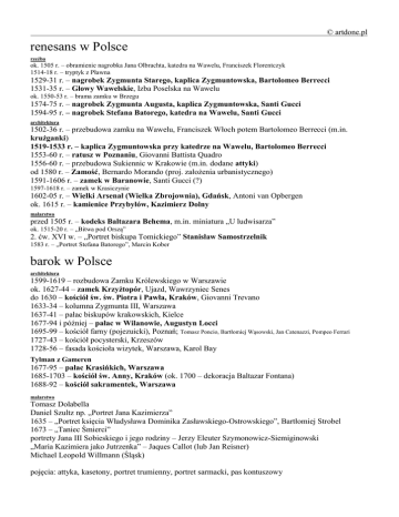 © artdone.pl renesans w Polsce rzeźba ok. 1505 r. – obramienie nagrobka Jana Olbrachta, katedra na Wawelu, Franciszek Florentczyk 1514-18 r. – tryptyk z Pławna 1529-31 r. – nagrobek Zygmunta Starego, kaplica Zygmuntowska, Bartolomeo Berrecci 1531-35 r. – Głowy Wawelskie, Izba Poselska na Wawelu ok. 1550-53 r. – brama zamku w Brzegu 1574-75 r. – nagrobek Zygmunta Augusta, kaplica Zygmuntowska, Santi Gucci 1594-95 r. – nagrobek Stefana Batorego, katedra na Wawelu, Santi Gucci architektura 1502-36 r. – przebudowa zamku na Wawelu, Franciszek Włoch potem Bartolomeo Berrecci (m.in. krużganki) 1519-1533 r. – kaplica Zygmuntowska przy katedrze na Wawelu, Bartolomeo Berrecci 1553-60 r. – ratusz w Poznaniu, Giovanni Battista Quadro 1556-60 r. – przebudowa Sukiennic w Krakowie (m.in. dodane attyki) od 1580 r. – Zamość, Bernardo Morando (proj. założenia urbanistycznego) 1591-1606 r. – zamek w Baranowie, Santi Gucci (?) 1597-1618 r. – zamek w Krasiczynie 1602-05 r. – Wielki Arsenał (Wielka Zbrojownia), Gdańsk, Antoni van Opbergen ok. 1615 r. – kamienice Przybyłów, Kazimierz Dolny malarstwo przed 1505 r. – kodeks Baltazara Behema, m.in. miniatura „U ludwisarza” ok. 1515-20 r. – „Bitwa pod Orszą” 2. ćw. XVI w. – „Portret biskupa Tomickiego” Stanisław Samostrzelnik 1583 r. – „Portret Stefana Batorego”, Marcin Kober barok w Polsce architektura 1599-1619 – rozbudowa Zamku Królewskiego w Warszawie ok. 1627-44 – zamek Krzyżtopór, Ujazd, Wawrzyniec Senes do 1630 – kościół św. św. Piotra i Pawła, Kraków, Giovanni Trevano 1633-34 – kolumna Zygmunta III, Warszawa 1637-41 – pałac biskupów krakowskich, Kielce 1677-94 i później – pałac w Wilanowie, Augustyn Locci 1695-99 – kościół farny (pojezuicki), Poznań; Tomasz Poncio, Bartłomiej Wąsowski, Jan Catenazzi, Pompeo Ferrari 1727-43 – kościół pocysterski, Krzeszów 1728-56 – fasada kościoła wizytek, Warszawa, Karol Bay Tylman z Gameren 1677-95 – pałac Krasińkich, Warszawa 1685-1703 – kościół św. Anny, Kraków (ok. 1700 – dekoracja Baltazar Fontana) 1688-92 – kościół sakramentek, Warszawa malarstwo Tomasz Dolabella Daniel Szultz np. „Portret Jana Kazimierza” 1635 – „Portret księcia Władysława Dominika Zasławskiego-Ostrowskiego”, Bartłomiej Strobel 1673 – „Taniec Śmierci” portrety Jana III Sobieskiego i jego rodziny – Jerzy Eleuter Szymonowicz-Siemiginowski „Maria Kazimiera jako Jutrzenka” – Jaques Callot (lub Jan Reisner) Michael Leopold Willmann (Śląsk) pojęcia: attyka, kasetony, portret trumienny, portret sarmacki, pas kontuszowy