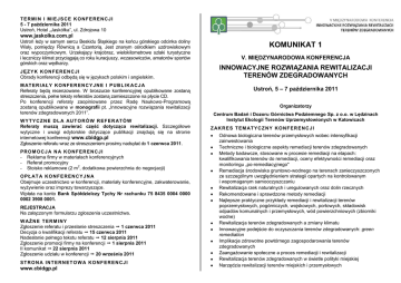 TERMIN I MIEJSCE KONFERENCJI 5 - 7 października 2011 Ustroń, Hotel „Jaskółka”, ul. Zdrojowa 10 www.jaskolka.com.pl Ustroń leży w samym sercu Beskidu Śląskiego na końcu górskiego odcinka doliny Wisły, pomiędzy Równicą a Czantorią. Jest znanym ośrodkiem uzdrowiskowym oraz wypoczynkowym. Urzekający krajobraz, wielokilometrowe szlaki turystyczne i leczniczy klimat przyciągają co roku kuracjuszy, wczasowiczów, amatorów sportów górskich oraz wędkarzy. JĘZYK KONFERENCJI Obrady konferencji odbędą się w językach polskim i angielskim. M AT E R I AŁ Y K O N F E R E N C Y J N E I P U B L I K AC J A Referaty będą recenzowane. W broszurze konferencyjnej opublikowane zostaną streszczenia, pełne teksty referatów zostaną zamieszczone na płycie CD. Po konferencji referaty zaopiniowane przez Radę Naukowo-Programową zostaną opublikowane w monografii pt. „Innowacyjne rozwiązania rewitalizacji terenów zdegradowanych 2011”. W Y T Y C Z N E D L A AU T O R Ó W R E F E R AT Ó W Referaty muszą zawierać część dotycząca rewitalizacji. Szczegółowe wytyczne i uwagi edytorskie dotyczące publikacji znajdują się na stronie internetowej konferencji www.cbidgp.pl Zgłoszenie referatu wraz ze streszczeniem prosimy nadsyłać do 1 czerwca 2011. PROMOCJA NA KONFERENCJI - Reklama firmy w materiałach konferencyjnych - Referat promocyjny 2 - Stoisko reklamowe (2 m , dodatkowa powierzchnia do negocjacji) O P Ł AT A K O N F E R E N C Y J N A Obejmuje uczestnictwo w konferencji, materiały konferencyjne, zakwaterowanie, wyżywienie oraz imprezy towarzyszące. Wpłata na konto Bank Spółdzielczy Tychy Nr rachunku 75 8435 0004 0000 0002 3908 0001. REJESTRACJA Na załączonym formularzu zgłoszenia uczestnictwa. W AŻ N E T E R M I N Y Zgłoszenie referatu i przesłanie streszczenia 1 czerwca 2011 Decyzja o kwalifikacji referatu 15 czerwca 2011 Nadesłanie pełnego tekstu referatu 12 sierpnia 2011 Zgłoszenie promocji firmy na konferencji 1 sierpnia 2011 II komunikat 22 sierpnia 2011 Zgłoszenie udziału w konferencji 20 września 2011 STRONA INTERNETOWA KONFERENCJI www.cbidgp.pl KOMUNIKAT 1 V. MIĘDZYNARODOWA KONFERENCJA INNOWACYJNE ROZWIĄZANIA REWITALIZACJI TERENÓW ZDEGRADOWANYCH Ustroń, 5 – 7 października 2011 Organizatorzy Centrum Badań i Dozoru Górnictwa Podziemnego Sp. z o.o. w Lędzinach Instytut Ekologii Terenów Uprzemysłowionych w Katowicach Z AK R E S T E M AT Y C Z N Y K O N F E R E N C J I Odnowa biologiczna terenów przemysłowych wobec intensyfikacji zainwestowania Techniczne i biologiczne aspekty remediacji terenów zdegradowanych Metody badawcze, stosowane w procesie remediacji na etapach: kwalifikowania terenów do remediacji, oceny efektywności remediacji oraz monitoringu „po-remediacyjnego" Remediacja środowiska gruntowo-wodnego na terenach zanieczyszczonych ze szczególnym uwzględnieniem strategii opartych na kontrolowanym i wspomaganym samooczyszczaniu Rewitalizacja rzek naturalnych i uregulowanych oraz dolin rzecznych Rekomendowane i sprawdzone metody remediacji Najlepsze praktyczne przykłady remediacji i rewitalizacji terenów poprzemysłowych, pogórniczych, wojskowych, portowych, składowisk odpadów komunalnych i przemysłowych, wód powierzchniowych (zbiorniki wodne) Rewitalizacja terenów zdegradowanych a zmiany klimatu Innowacyjne podejście do oczyszczania terenów zdegradowanych: green remediation Implikacje zdrowotne powtórnego zagospodarowania terenów zdegradowanych Zaangażowanie społeczne a proces remediacji i rewitalizacji Rewitalizacja terenów zdegradowanych w świetle polityki miejskiej Narzędzia rewitalizacji terenów miejskich i przemysłowych Szczególnie zachęcamy do prezentacji wyników badań podstawowych i stosowanych uwzględniających następujące aspekty rewitalizacji terenów zdegradowanych i poprzemysłowych: przyrodniczy i środowiskowy, technologiczno-inżynierski, projektowo-planistyczny, ekonomiczny i finansowy, społeczny. S E SJ A S P E C J AL N A Konferencję rozpocznie sesja Projektu FOKS - Kluczowe źródła zagrożeń środowiskowych (realizowanego w ramach Programu Współpracy Transnarodowej dla Europy Środkowej) prezentująca zaawansowane narzędzia techniczno-operacyjne: pasywne opróbowanie do oceny zanieczyszczenia środowiska wodnego, metoda zintegrowanych pompowań badawczych – Integral Pumping Tests, fingerprinting - szczegółowa interpretacja wyników badań, backtracking - modelowanie transportu zanieczyszczeń w wodach podziemnych, gnostyczne podejście do analizy danych o małej liczebności, analiza ryzyka środowiskowego i zdrowotnego. Realizatorzy Projektu FOKS przedstawią także metody remediacji: destrukcję pestycydów przy użyciu katalizatora miedziowego, usuwanie pestycydów metodą fitoremediacji w środowisku wodnym, zastosowanie przepuszczalnej bariery reaktywnej do oczyszczania wód w warstwie wodonośnej. Szczegółowy program Konferencji prześlemy do 9 września 2011. U CZ ES TN IC Y K ON FE RE NC J I Zaproszenie kierujemy do uczelni wyższych i instytutów badawczych, państwowych, samorządowych i prywatnych organizacji biorących udział w procesie rewitalizacji terenów zdegradowanych, a szczególnie terenów poprzemysłowych. Do udziału w konferencji zapraszamy przedstawicieli władz regionalnych i lokalnych, właścicieli terenów, inwestorów, firm zajmujących się oczyszczaniem oraz rekultywacją gleb i wód, a także instytucji finansujących i ubezpieczeniowych. Szczegółowe informacje dostępne są na stronach internetowych: www .cbidgp.pl www .ietu.katow ice.pl R AD A N AU K O W O - P R O G R AM O W A Do Rady Naukowo-Programowej zostali zaproszeni: prof. zw. dr hab. inż. Stanisław BARAN – Instytut Gleboznawstwa i Kształtowania Środowiska, Uniwersytet Przyrodniczy, Lublin Bernard BŁASZCZYK – Ministerstwo Środowiska, Warszawa dr Jan DULEWSKI – Wyższy Urząd Górniczy, Katowice prof. Jairo FALLA – Universite Paul Verlaine, Metz,