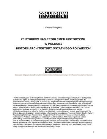 Makary Górzyński ZE STUDIÓW NAD PROBLEMEM HISTORYZMU W POLSKIEJ HISTORII ARCHITEKTURY OSTATNIEGO PÓŁWIECZA1 Opracowanie dostępne na licencji Creative Commons Uznanie autorstwa-Użycie niekomercyjne-Na tych samych warunkach 3.0 Unported 1 Tekst niniejszy jest w obecnej formie efektem tutorialu, prowadzonego w latach 2011-2012 przez autora wraz z prof. Barbarą Arciszewską w ramach Collegium Invisibile. Pierwszą okazją do sformułowania szkicu niniejszych rozważań był fragment rozdziału wstępnego pracy magisterskiej w Instytucie Historii Sztuki Uniwersytetu Warszawskiego, napisanej pod kierunkiem prof. Waldemara Baraniewskiego – „Negocjowanie nowoczesności. Architektura ratusza kaliskiego z przełomu XIX/XX wieku. „W przededniu samorządu miejskiego w Królestwie””, obronionej we wrześniu 2012 roku i złożonej do wydania w roku 2014 w Kaliskim Towarzystwie Przyjaciół Nauk pod tytułem „Dziewiętnastowieczny ratusz w Kaliszu. Architektura i niezrealizowany projekt nowoczesności” (w druku). Zawarte tu poglądy miałem okazję referować na posiedzeniu Pracowni Historii Sztuki i Kultury Artystycznej Kaliskiego Towarzystwa Przyjaciół Nauk 9 maja 2013 roku, pod tytułem „Styl i wykluczenie. Problem historyzmu w badaniach nad architekturą XIX wieku w polskiej historii architektury ostatnich dziesięcioleci”. Chciałbym w tym miejscu serdecznie podziękować prof. B. Arciszewskiej za profesjonalną opiekę nad tym opracowaniem i cenne rady. Podziękowania kieruję również do prof. Agnieszki Zabłockiej-Kos – za ważne wskazówki i zachętę do dalszej pracy nad tematem - wszystkich uczestników kaliskiego spotkania i dyskusji oraz wszystkich osób, które miały okazję wypowiedzieć się na temat nieniejszego eseju. 1 Wprowadzenie Na marginesie pism takich filozofów współczesności jak Jean Francois Lyotard, Jürgen Habermas czy Marshall Berman odnajdujemy negatywne sądy o architekturze dziewiętnastego wieku, służące do zaznaczenia własnego stanowiska wobec aktualnych wydarzeń, takich jak postmodernizm. W słynnej pracy Bermana „Wszystko co stałe, rozpływa się w powietrzu”. Rzecz o doświadczeniu nowoczesności londyński Pałac Kryształowy jawił się jako liryczny symbol nowoczesności, nierozpoznany przez brytyjską burżuazję preferującą style historyczne, co okazuje się być w tej interpretacji zwiastunem dotkliwego kryzysu. Jego symptomem miał być historyzm2 w architekturze, niweczący nadzieje na rozwój awangardowych prądów kulturowych. Jako reakcyjna reprezentacja burżuazji, jest on przez Bermana opisywany w relacji sprzeczności z lewicowym podejściem politycznym 3. W wykładzie Nowoczesna i postmodernistyczna architektura z 1981 r. Habermas utożsamił postmodernizm, rozumiany jako antymodernizm, z neokonserwatyzmem. Filozof zdiagnozował jego obecność w architekturze jako sytuację regresyjną wobec programu autonomicznej, awangardowej sztuki nowoczesnej4. Pojawienie się form interpretowanych jako znajdujące precedensy w architekturze dawnej – co zresztą często pozostaje w popularnym odbiorze głównym wyróżnikiem postmodernistycznej formy – i ich wartościowanie przez teoretyków takich jak Charles Jencks 5 spotkało się z oporem filozofa. Habermas 2 W tekście kursywą oprócz tytułów cytowanych prac zapisywane są omawiane pojęcia i określenia – uznawane przez autora za dyskusyjne – a pochodzące z referowanych tekstów oraz nazwy obiektów architektonicznych. 3 M. B e r m a n , „Wszystko co stałe, rozpływa się w powietrzu”. Rzecz o doświadczeniu nowoczesności, tłum. M. Szuster, Kraków 2006 (wyd. oryg. 1982), s. 309. Zdaniem autora, nowoczesność Pałacu Kryształowego docenimy w pełni dopiero, „gdy porównamy go z neogotyckimi, neorenesansowymi, neobarokowymi grzmotami które wznoszono naokoło”. Wedle takiej kliszy interpretacyjnej (gdzie słowo „grzmoty” dla określenia architektury jawi się jako ciekawostka translatorska), z winy angielskiej burżuazji przez całą drugą połowę XIX wieku w Anglii nie powstały „żadne nowoczesne budynki” (ibidem). 4 J. H a b e r m a s, Modern and Postmodern Architecture, [w:] Architecture Theory since 1968, oprac. M.C. H a y s, Cambridge-London 1998, s. 412-428. 5 Problem negatywnego wartościowania architektury wieku XIX, będący sam w sobie rozległym zagadnieniem badawczym, jest interesującym przykładem słabości metodologicznej postmodernistycznego języka. Czołowe postaci ruchu – np. w osobie Charlesa Jencksa - nie pokusili się o przepracowanie narosłych w modernistycznej historiografii kategorii, pozostając na własnym gruncie teoretycznym w świecie binarnych opozycji historyzm – modernizm, wobec których wygenerowano koncepcję "trzeciej drogi" – postmodernistycznego przekroczenia modernizmu zradykalizowanego o elementy tradycji, przeszłości, pastiszu, innymi słowy chwytów retorycznych potrzebnych do nawiązania przerwanej przez klasyczny modernizm komunikacji. Jak zauważył w 1983 roku Alan Colquhoun, modernistyczne odrzucenie historii współcześnie zastępuje jej nowa, wykorzystywana w procesie projektowym świadomość, por. idem, Three Kinds of Historicism, [w:] Theorizing a New Agenda For Architecture. An Anthology of Architectural Theory 1965-1995, oprac. 2 zaproponował analogię między sytuacją z lat 70.-80. XX wieku a drugą połową poprzedniego stulecia, rzekomo zdominowaną przez autolegitymizujący się estetyzm historyzmu, utożsamiany z postawą wycofania, ucieczki od twórczej drogi nowoczesności6. Lyotard z kolei w Postmodernizmie dla dzieci przekonuje, iż postmodernistyczną krytykę awangardy – rozumianą jako atak na wartości i dokonania modernizmu – należy widzieć w kategoriach postawy reakcyjnej, skutkującej poziomem zero współczesnej kultury. Regresja łączy się tu z eklektyzmem, widzianym jako mieszanie się niczym nieograniczonej oferty konsumpcyjnej, ch