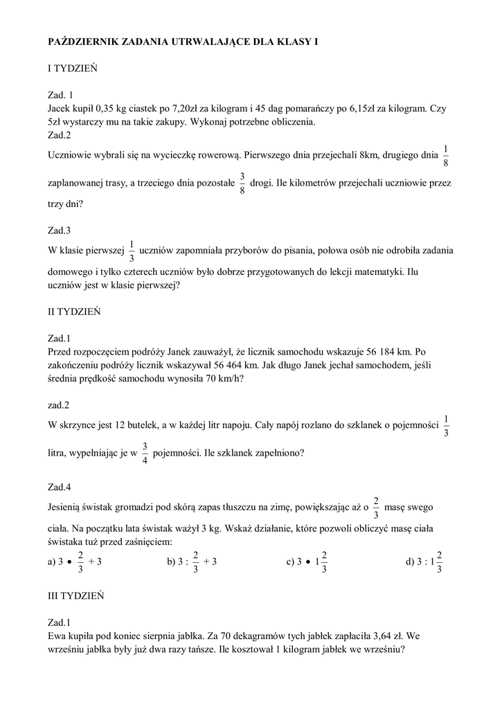 PAŹDZIERNIK ZADANIA UTRWALAJĄCE DLA KLASY I I TYDZIEŃ Zad. 1 Jacek kupił 0,35 kg ciastek po 7,20zł za kilogram i 45 dag pomarańczy po 6,15zł za kilogram. Czy 5zł wystarczy mu na takie zakupy. Wykonaj potrzebne obliczenia. Zad.2 1 Uczniowie wybrali się na wycieczkę rowerową. Pierwszego dnia przejechali 8km, drugiego dnia 8 3 zaplanowanej trasy, a trzeciego dnia pozostałe drogi. Ile kilometrów przejechali uczniowie przez 8 trzy dni? Zad.3 1 uczniów zapomniała przyborów do pisania, połowa osób nie odrobiła zadania 3 domowego i tylko czterech uczniów było dobrze przygotowanych do lekcji matematyki. Ilu uczniów jest w klasie pierwszej? W klasie pierwszej II TYDZIEŃ Zad.1 Przed rozpoczęciem podróży Janek zauważył, że licznik samochodu wskazuje 56 184 km. Po zakończeniu podróży licznik wskazywał 56 464 km. Jak długo Janek jechał samochodem, jeśli średnia prędkość samochodu wynosiła 70 km/h? zad.2 W skrzynce jest 12 butelek, a w każdej litr napoju. Cały napój rozlano do szklanek o pojemności litra, wypełniając je w 3 pojemności. Ile szklanek zapełniono? 4 Zad.4 2 masę swego 3 ciała. Na początku lata świstak ważył 3 kg. Wskaż działanie, które pozwoli obliczyć masę ciała świstaka tuż przed zaśnięciem: 2 2 2 2 a) 3 +3 b) 3 : +3 c) 3 1 d) 3 : 1 3 3 3 3 Jesienią świstak gromadzi pod skórą zapas tłuszczu na zimę, powiększając aż o III TYDZIEŃ Zad.1 Ewa kupiła pod koniec sierpnia jabłka. Za 70 dekagramów tych jabłek zapłaciła 3,64 zł. We wrześniu jabłka były już dwa razy tańsze. Ile kosztował 1 kilogram jabłek we wrześniu? 1 3 Zad.2 Zaczęło padać za piętnaście dziewiąta wieczorem i padało do wpół do ósmej rano następnego dnia. Ile czasu padał deszcz? Podaj w godzinach. Zad.3 Rower kosztował 570 zł. W promocji obniżono cenę o 15%. Wskaż sposób obliczenia ceny promocyjnej tego roweru. 85 570 100 570 a) 0,85 570 b) 570 – 0,15 570 c) d) 100 85 Zad.4 Woda morska zawiera średnio 3,5% soli. I) Wskaż zdania prawdziwe: a) W 100 g wody morskiej znajduje się 3,5 g soli. b) W 103,5 g wody morskiej znajduje się 3,5 g soli. c) W 100 g wody morskiej znajduje się 0,35 dag soli. d) W 100 dag wody morskie znajduje się 35 g soli. II) Ile soli zawierają 2 kilogramy wody morskiej: a) 7 g b) 70g c) 7dag d) 70dag e) 0,07kg f) 0,7 kg IV TYDZIEŃ Zad.1 Po dziesięcioprocentowej podwyżce pracownik zarabia 1430 zł. Ile zarabiał przed podwyżką? Zad.2 W czasie promocji ceny na wszystkie towary w sklepie obniżono o 20%. Klocki Lego kosztują teraz 44zł 80gr. Ile kosztowały przed ogłoszeniem promocji? Zad.3 W sklepie kilogram jabłek kosztuje 3 zł. Za te same jabłka na targu należy zapłacić 2,50 zł. O ile procent jabłka w sklepie są droższe od jabłek na targu? A o ile procent jabłka na targu są tańsze od jabłek w sklepie?