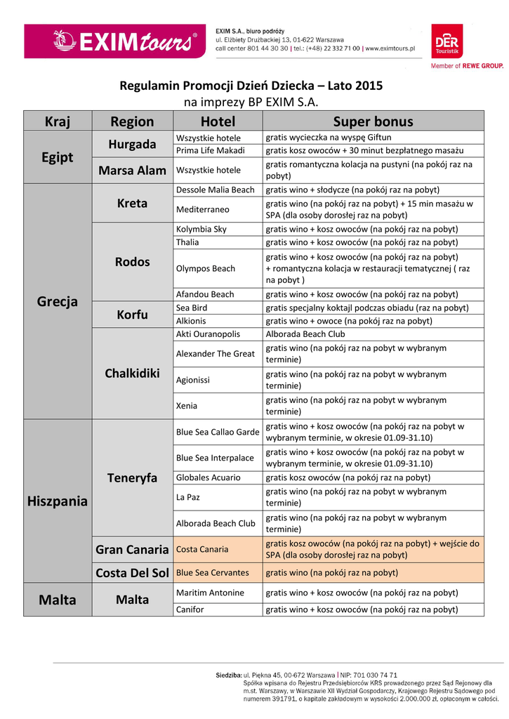 Regulamin Promocji Dzień Dziecka – Lato 2015 na imprezy BP EXIM S.A. Kraj Egipt Region Hotel Hurgada Wszystkie hotele Prima Life Makadi Marsa Alam Wszystkie hotele Dessole Malia Beach Kreta Mediterraneo Kolymbia Sky Thalia Rodos Grecja Korfu Olympos Beach Afandou Beach Sea Bird Alkionis Akti Ouranopolis Alexander The Great Chalkidiki Malta gratis wino + kosz owoców (na pokój raz na pobyt) + romantyczna kolacja w restauracji tematycznej ( raz na pobyt ) gratis wino + kosz owoców (na pokój raz na pobyt) gratis specjalny koktajl podczas obiadu (raz na pobyt) gratis wino + owoce (na pokój raz na pobyt) Alborada Beach Club gratis wino (na pokój raz na pobyt w wybranym terminie) gratis wino (na pokój raz na pobyt w wybranym terminie) Xenia gratis wino (na pokój raz na pobyt w wybranym terminie) Blue Sea Callao Garde gratis wino + kosz owoców (na pokój raz na pobyt w wybranym terminie, w okresie 01.09-31.10) Globales Acuario La Paz Hiszpania gratis wycieczka na wyspę Giftun gratis kosz owoców + 30 minut bezpłatnego masażu gratis romantyczna kolacja na pustyni (na pokój raz na pobyt) gratis wino + słodycze (na pokój raz na pobyt) gratis wino (na pokój raz na pobyt) + 15 min masażu w SPA (dla osoby dorosłej raz na pobyt) gratis wino + kosz owoców (na pokój raz na pobyt) gratis wino + kosz owoców (na pokój raz na pobyt) Agionissi Blue Sea Interpalace Teneryfa Super bonus gratis wino + kosz owoców (na pokój raz na pobyt w wybranym terminie, w okresie 01.09-31.10) gratis kosz owoców (na pokój raz na pobyt) gratis wino (na pokój raz na pobyt w wybranym terminie) Alborada Beach Club gratis wino (na pokój raz na pobyt w wybranym terminie) Gran Canaria Costa Canaria gratis kosz owoców (na pokój raz na pobyt) + wejście do SPA (dla osoby dorosłej raz na pobyt) Costa Del Sol Blue Sea Cervantes gratis wino (na pokój raz na pobyt) Maritim Antonine gratis wino + kosz owoców (na pokój raz na pobyt) Canifor gratis wino + kosz owoców (na pokój raz na pobyt) Malta Kraj Tunezja Turcja Region Wybrzeże Wschodnie Riwiera Turecka Hotel Super bonus Concorde Green Park Concorde Marco Polo Riadh Palms Iberostar Averroes Anabella Dıamond Anabella Park Side Star Beach Tıtan Garden Tıtan Select Kahya Hotel Kirman Arycanda Hotel Eftalia Vıllage Hotel Alaiye Resort gratis wino + kosz owoców (na pokój raz na pobyt) gratis wino + kosz owoców (na pokój raz na pobyt) gratis wino + kosz owoców (na pokój raz na pobyt) gratis wino + kosz owoców (na pokój raz na pobyt) gratis 20 min massage (dla osoby dorosłej raz na pobyt) gratis 20 min massage(dla osoby dorosłej raz na pobyt) gratis wino + kosz owoców (na pokój raz na pobyt) gratis 15 min masażu (dla osoby dorosłej raz na pobyt) gratis 15 min masażu (dla osoby dorosłej raz na pobyt) gratis wino + kosz owoców (na pokój raz na pobyt) gratis wino + kosz owoców (na pokój raz na pobyt) gratis wino + kosz owoców (na pokój raz na pobyt) gratis wino + kosz owoców (na pokój raz na pobyt) Club Turtas gratis wino + przysmaki (na pokój raz na pobyt) + 15 min masażu (dla osoby dorosłej raz na pobyt) / dotyczy wybranych terminów Club Calimera Pine Beach gratis wino + + kosz owoców (na pokój raz na pobyt) The Colours Side dodatkowy rabat do 20% za pobyt- prezentowana cena zawiera rabat Euphoria Tekirova gratis wino + kosz owoców (na pokój raz na pobyt) + 15 min masażu (dla osoby dorosłej raz na pobyt) + romantyczna kolacja w restauracji a'la carte ( raz na pobyt ) gratis wino + kosz owoców (na pokój raz na pobyt) + 15 min masażu (dla osoby dorosłej raz na pobyt) Euphoria Palm Beach + romantyczna kolacja w restauracji a'la carte ( raz na pobyt ) Cypr Cypr Saphir Hotel Saphir Resort Papillon Ayscha Papillon Belvil Papillon Zeugma Venus Beach Paphos Navaria Limassol Lordos Beach Larnaca Aktea Village Ayia Napa gratis kosz owoców lub wino (na pokój raz na pobyt) gratis kosz owoców lub wino (na pokój raz na pobyt) gratis wino + kosz owoców (na pokój raz na pobyt) gratis wino + kosz owoców (na pokój raz na pobyt) gratis wino + kosz owoców (na pokój raz na pobyt) gratis wino + owoce (na pokój raz na pobyt) gratis wino + owoce (na pokój raz na pobyt) gratis wino + owoce (na pokój raz na pobyt) gratis wino + owoce (na pokój raz na pobyt)