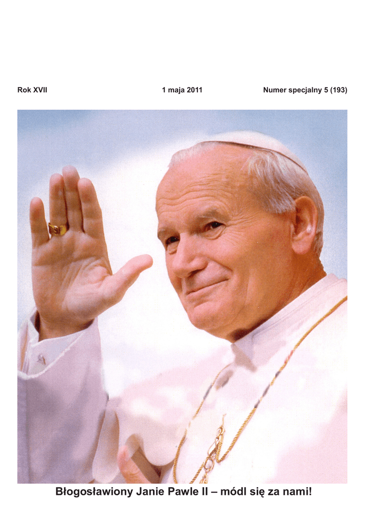 Nasza Wspólnota, Numer specjalny 5 (193), 1 maja 2011 Rok XVII 1 maja 2011 1 Numer specjalny 5 (193) Błogosławiony Janie Pawle II – módl się za nami! 2 Słowo od Redakcji Nasza Wspólnota, Numer specjalny 5 (193), 1 maja 2011 Na wiadomość o śmierci Jana Pawła II Minister generalny naszego Zakonu Braci Mniejszych – Franciszkanów, o. José Rodríguez Carballo OFM, Hiszpan, w liście do Współbraci napisał: „Z woli Opatrzności Bożej, właśnie w Oktawie Wielkanocy, zakończył się długi pontyfikat Karola Wojtyły. W czasie, kiedy Liturgia z tak ogromną siłą głosi i cały Kościół z radością śpiewa przesłanie wolności «nowego pierwszgo Dnia», Zmartwychwstały Jezus Chrystus przyjął do swojego Królestwa niegasnącego światła Jana Pawła II: niezmordowanego posłańca Dobrej Nowiny, niestrudzonego sługę człowieka, proroka pokoju, gorącego obrońcę wolności i godności każdej osoby ludzkiej. Pan przyjął Go w swoje ramiona, aby powiedzieć mu dziękuję, ponieważ, zgodnie ze swoim powołaniem, umacniał do ostatniej chwili braci i siostry w wierze słowem i swoim ewangelicznym życiem, a na koniec tajemniczą siłą cierpienia, przyjętego i przemienionego w świadectwo, czyniąc z Placu Św. Piotra «serce świata»”. „Milczenie... Jana Pawła II w tych ostatnich jego ziemskich dniach, stało się najbardziej wymownym słowem, dając nad wyraz sens i wartość głoszonemu słowu, a nie zawsze słuchanemu, w ponad dwudziestoletnim proroczym nauczaniu. W dziękczynieniu Zmartwychwstałemu natychmiast połączyli się wszyscy wierni Kościoła, mężczyźni i kobiety dobrej woli, oraz całe pokolenia młodzieży, którym zawsze wskazywał wspaniałe horyzonty. Do tego chóru wdzięczności chcemy dołączyć i my, jako Bracia Mniejsi, pomni związków, jakie od początku istnieją pomiędzy Zakonem a Papieżem, przede wszystkim za ojcowską opiekę i zatroskanie, jakimi Jan Paweł II otaczał naszą Braterską Wspólnotę od 1978 roku aż do dzisiaj, okazując nam zawsze konkretne wyrazy umiłowania, bliskości i szacunku”. Minister generalny swój list kończy zaś zdaniami napisanymi przez Papieża i Ojca duchowego naszego narodu o św. Franciszku z Asyżu, założycielu zakonu Braci Mniejszych: „Wzruszeni pożegnaniem tak wyjątkowego Papieża, dla ożywienia naszego dziękczynnego wezwania do Pana, Ojca miłosierdzia, zechciejmy więc teraz przypomnieć sobie niektóre Jego słowa wyjęte z «Orędzia» na Boże Narodzenie 1986 roku: «O, jak piękne stopy tego posłańca radosnej nowiny, któremu na imię jest Franciszek, Biedaczyna z Asyżu, z Greccio i Góry Alwerni, Franciszek miłośnik wszelkiego stworzenia; Franciszek ujęty miłością Bożego Dzieciątka, narodzonego w nocy w Betlejem, Franciszek, w którym zakrólowało serce Chrystusa po to, abyśmy poprzez całkowite ubóstwo ucznia zrozumieli jak najlepiej ubóstwo Nauczyciela i pozostali prości w pojmowaniu miłości i pokoju». «Bądź pochwalony Panie» przez naszego Papieża Jana Pawła II, ponieważ «od Ciebie, Najwyższy, pochodzi wszelkie zrozumienie»!” (tł. o. Eligiusz Dymowski OFM). W tym ostatnich słowach, będącymi parafrazą „Pieśni słonecznej” św. Franciszka, Ojciec José, generał Zakonu, uznał i publicznie wyznał świętość Jana Pawła II. W dniu dzisiejszym Kościół powszechny, odpowiadając na głosy wiernych (vox populi), po wnikliwym zbadaniu podstaw tej wiary, potwierdza jej autentyczność swoim autorytetem i ogłasza Jana Pawła II, papieża, błogosławionym. Tym samym daje nam Go jako wzór do naśladowania i jako orędownika przed Bogiem. Bł. Jan Paweł II szedł do świętości nie tylko jako papież, ale już jako dziecko, młodzieniec, kapłan i biskup. Ślady tego zostawił również na naszych Azorach, a szczególnie w naszej świątyni. W jej dolnych częściach, dawnej kaplicy, którą porównał do Groty Betlejemskiej, sprawował Mszę św. i głosił słowo Boże; to samo czynił w kaplicy dolnej obecnego kościoła i w jego głównej nawie, które uroczyście poświęcił „w stanie surowym”. Przemierzał również plac przykościel- ny. Był także w ówczesnych parterowych pomieszczeniach klasztoru. Wszystko to zobowiązuje nas do kroczenia jego śladami, ale także do upamiętnienia tej Jego obecności. Od zaraz możemy uczynić Go patronem kaplicy, a kiedy zaistnieją odpowiednie warunki i możliwości materialne oraz wola przełożonych i parafian, można będzie utrwalić Jego obecność w postaci witraża w niewykorzystanym do tej pory dużym oknie naszej świątyni dedykowanej Matce Niepokalanej, której był On całkowicie oddany (Totus Tuus). Tymczasem, spróbujmy wsłuchać się w Jego prorocze słowa i przypomnieć sobie Jego obecność na Azorach, a także w innych klasztorach naszej prowincji zakonnej na terenie Archidiecezji Krakowskiej oraz rozpoznać Jego posługę, jako Głowy Kościoła, wobec całego naszego Zakonu w świecie. o. Salezy B. Brzuszek OFM I „Niestrudzony sługa człowieka, prorok pokoju, gorący obrońca wolności i godności każdej osoby ludzkiej” 1. „Myśląc Ojczyzna...” Ojczyzna... „Ojczyzna – kiedy myślę – wówczas wyrażam siebie i zakorzeniam, mówi mi o tym serce, jakby ukryta granica, która ze mnie przebiega ku innym, aby wszystkich ogarniać w przeszłość dawniejszą niż każdy z nas: z niej się wyłaniam... gdy myślę Ojczyzna – by zamknąć ją w sobie jak skarb. Pytam wciąż, jak go pomnożyć, jak poszerzyć tę przestrzeń, którą wypełnia” (K. Wojtyła, Poezje i dramaty, Kraków 1979). Ojczyzna jest naszą matką ziemską „Ojczyzna jest naszą matką ziemską. Polska jest matką szczególną. Niełatwe są jej dzieje, zwłaszcza na przestrzeni ostatnich stuleci. Jest matką, która wiele przecierpiała i wciąż na nowo cierpi. Dlatego też ma prawo do miłości szczególnej. Potrzeba nieustannej odnowy umysłów i serc, aby przepeł