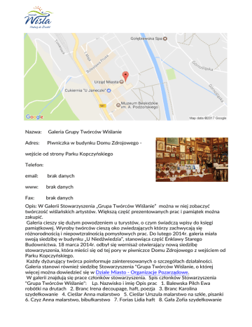 Nazwa: Galeria Grupy Twórców Wiślanie Adres: Piwniczka w budynku Domu Zdrojowego - wejście od strony Parku Kopczyńskiego Telefon: email: brak danych www: brak danych Fax: brak danych Opis: W Galerii Stowarzyszenia „Grupa Twórców Wiślanie” można w niej zobaczyć twórczość wiślańskich artystów. Większą część prezentowanych prac i pamiątek można zakupić. Galeria cieszy się dużym powodzeniem u turystów, o czym świadczą wpisy do księgi pamiątkowej. Wyroby twórców cieszą oko zwiedzających którzy zachwycają się różnorodnością i niepowtzralnością pomysłowych prac. Do lutego 2014r. galeria miała swoją siedzibę w budynku „U Niedźwiedzia”, stanowiąca część Enklawy Starego Budownictwa. 18 marca 2014r. odbył się wernisaż otwierający nową siedzibę stowarzyszenia, która mieści się od tej pory w piwniczce Domu Zdrojowego z wejściem od Parku Kopczyńskiego. Każdy dyżurujący twórca poinformuje zainteresowanych o szczegółach działalności. Galeria stanowi również siedzibę Stowarzyszenia "Grupa Twórców Wiślanie, o której więcej można dowiedzieć się w Dziale Miasto - Organizacje Pozarządowe. W galerii znajdują się prace członków stowarzyszenia. Spis członków Stowarzyszenia "Grupa Twórców Wiślanie": Lp. Nazwisko i imię Opis prac 1. Balewska Pilch Ewa robótki na drutach 2. Branc Irena decoupage, haft, poezja 3. Branc Karolina szydełkowanie 4. Cieślar Anna malarstwo 5. Cieślar Urszula malarstwo na szkle, pisanki 6. Czyz Anna malarstwo, bibułkarstwo 7. Forias Lidia haft 8. Gała Zofia szydełkowanie 9. Gatnar-Guzy Maria malarstwo na szkle, poezja 10. Gluza Jarosław rzeźba w drewnie 11. Grosek Ewa szydełkowanie 12. Kamieniorz Helena szydełowanie 13. Kocjan Jan rzeźba w drewnie, malarstwo 14. Konderla Iwona szydełkowanie, malarstwo na szkle 15. Kwiatkowska Monika bibułkarstwo 16. Lazar Ewa malarstwo na szkle 17. Madej Fryderyka malarstwo 18. Malirz Matula Wanda malarstwo 19. Nowak Hanna malarstwo 20. Pabian Teresa szydełkowanie, decoupage, haft 21. Pająk Gabriela malarstwo 22. Paterek Irena malartswo na szkle 23. Pilch Helena szycie, patchwork 24. Pinkas Anna szydełowanie 25. Pitas Izabela malarstwo, biżuteria 26. Przybylska Wanda malarstwo 27. Setkiewicz Małgorzata malarstwo 28. Streich Sabina ceramika 29. Strzempek Eryk rzeźba w drewnie 30. Szajtauer Elżbieta malarstwo 31. Sobol Emilia haftowanie, malarstwo 32. Szalbot Paweł poezja 33. Szarzec Paweł stolarstwo 34. Szostok Andrzej poezja 35. Wantulok Elżbieta malowanie jajek - batik 36. Wisełka Helena haftowanie 37. Zych Anna malarstwo, wypalanki w drewnie Honorowi członkowie stowarzyszenia: Oczkowska Aleksandra Słowiok Urszula Szturc Maria