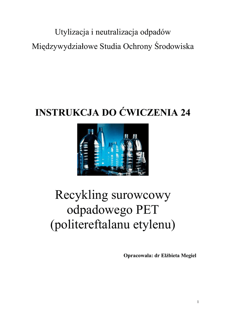 Utylizacja i neutralizacja odpadów Międzywydziałowe Studia Ochrony Środowiska INSTRUKCJA DO ĆWICZENIA 24 Recykling surowcowy odpadowego PET (politereftalanu etylenu) Opracowała: dr Elżbieta Megiel 1 I. Cel ćwiczenia Zapoznanie studentów z podstawowymi metodami recyklingu tworzyw sztucznych, a w szczególności odpadowego politereftalanu etylenu (PET). II. Stosowane odczynniki i sprzęt laboratoryjny 1. Odpadowy PET w postaci butelki po napoju i skrawka tkaniny 2. Glikol etylenowy 3. Octan cynku 4. Wodorotlenek sodu 5. Kwas solny stęż. 6. Alkohol etylowy 96% 7. Octan wapnia 8. Tlenek antymonu (V) Zestaw do ogrzewania pod chłodnicą zwrotną III. Przebieg ćwiczenia: Studenci przeprowadzają w trakcie ćwiczenia dwie syntezy monomerów, które w przemyśle stosowane są do otrzymywania politereftalanu etylenu (PET) 1. Glikoliza PET 2. Hydroliza PET w środowisku zasadowym 3. Synteza PET z otrzymanych wcześniej monomerów Następnie wydzielają i oczyszczają produkty syntezy. Wykonują pomiar temperatury topnienia dla produktu glikolizy oraz widmo w podczerwieni dla produktu hydrolizy (dla próbek uzyskanych przez poprzednią grupę studentów). 1. Rozkład odpadowego PET w reakcji glikolizy z glikolem etylenowym. Rozdrobnić odpadowy PET (butelka po napoju) na drobne kilkucentymetrowe skrawki i odważyć tak przygotowanego surowca 10g (masę zanotować w protokole) 2 Do kolby reakcyjnej w zestawie do ogrzewania pod chłodnicą zwrotną (Rys.1) wprowadzić odważony surowiec, 50 ml glikolu i 0.5 g octanu cynku, kilka sit molekularnych Odkręcić wodę chłodzącą i uruchomić ogrzewanie Utrzymywać układ reakcyjny w temperaturze 200 – 210 0C przez 60 min, zapisując w protokole zmiany temperatury Wyłączamy ogrzewanie i czekamy na schłodzenie do temperatury pokojowej Mieszaninę reakcyjną z kolby wylewamy do zlewki, w której znajduje się około 100g lodu Wytrącony osad odsączamy na lejku Büchnera pod próżnią i przemywamy 40 ml wody z lodem Zmieniamy kolbę ssawkową pozostawiając ten sam lejek z odsączonym wcześniej osadem Osad rozpuszczamy na lejku za pomocą gorącej wody (PTE i dłuższe oligomery nie rozpuszczają się w gorącej wodzie), zapisujemy obserwacje dotyczące pozostałego na sączku osadu Przesącz wylewamy do zlewki, w której znajduje się około 100g lodu Odsączymy na lejku Büchnera wytrącony osad Bibułę z wytrąconym osadem przenosimy na szalkę Petrie’go i wstawiamy do suszenia do suszarki na 2 godz. Po 2 godz. osad wyjmujemy z suszarki i chwilę po wyjęciu ważymy, masę zapisujemy w protokole i ponownie umieszczamy w suszarce. Po wysuszeniu mierzymy temperaturę topnienia i porównujemy z wartością literaturową dla bishydroksytereftalanu etylu. 3 Rys.1 Zestaw do przeprowadzania glikolizy odpadowego PET [1]. 2. Hydroliza zasadowa odpadowego PET. Do wykonania reakcji wykorzystujemy zestaw laboratoryjny z części 1. Rys.1, ale kolbę jednoszyjną z zamontowaną chłodnicą zwrotną umieszczamy w czaszy grzejnej bez płaszcza na mieszadle magnetycznym. Odważamy 15g rozdrobnionego odpadowego PET Do kolby wprowadzamy 90 ml wody destylowanej, 18g NaOH i dokładnie mieszamy aż do rozpuszczenia, dodajemy 45 ml etanolu Wprowadzamy surowiec do kolby i włączamy grzanie, doprowadzamy mieszaninę do wrzenia Ogrzewanie prowadzimy przez 60 minut Wyłączymy ogrzewanie i czekamy na schłodzenie do temperatury pokojowej Odsączamy na lejku Büchnera i wylewamy przesącz, przemywamy kolbę, nakładamy ponownie lejek z odsączonym wcześniej osadem, a następnie przemywamy go 150 ml wody destylowanej w celu rozpuszczenia powstałej soli sodowej kwasu tereftalowego Do przesączu, wylanego wcześniej do zlewki, dodajemy bardzo powoli (kroplami) stężony kwas solny, aż do odczynu kwaśnego (kontrolujemy za pomocą papierka uniwersalnego), cały czas mieszając roztwór bagietką Wytrącony osad odsączamy na lejku Büchnera 4 Bibułę z osadem umieszczamy na szalce Petriego i suszymy przez 2 godz. w suszarce Po 2 godz. osad wyjmujemy z suszarki i chwilę po wyjęciu ważymy, masę zapisujemy w protokole. Przygotowujemy pastylkę w KBr z produktu hydrolizy PET uzyskanego przez poprzednią grupę studencką oraz z kwasu tereftalowego(3:300) Wykonujemy widma w podczerwieni i porównujemy widmo produktu z widmem kwasu terftalowego 3. Synteza PET z surowców otrzymywanych z recyklingu Syntezę przeprowadzamy w zestawie do destylacji prostej Rys.2. Rys.2. Zestaw do przeprowadzania syntezy PET [1]. W moździerzu porcelanowym rozcieramy przez około 10 minut mieszaninę składającą się z 6,35g bis-2-hydroksytereftalanu etylu (uzyskanego jako produkt 1 części ćwiczenia przez wcześniejszą grupę studencką), 5,4g kwasu tereftalowego oraz 0,25g octanu wapnia i 0,25g tlenku antymonu (V) 5 Mieszaninę umieszczamy w kolbie reakcyjnej i ogrzewamy bardzo wolno do temperatury 250 0C Masa w kolbie staje się najpierw płynna, a następnie gęstnieje, gdy jej barwa ulegnie zmianie na zielonożółtą włączamy pompkę próżniową i oddestylowujemy tworzący się glikol (około 15 min) Po zakończeniu destylacji i wyłączeniu pompki (po zapowietrzeniu układu) wyłączamy ogrzewacz i odstawiamy i czekamy na schłodzenie aparatury Po ochłodzeniu powstały w kolbie produkt ważymy. . Opracowanie wyników 1. Opis przebiegu przeprowadzonych reakcji. 2. Równania reakcji. 3. Schemat aparatury wykorzystywanej w ćwiczeniu. 4. Obliczona wydajność dla każdej reakcji. 5. Porównanie zmierzonej temperatury topnienia monomeru z wartościami literaturowymi. 6. Porównanie widma IR produktu hydrolizy z widmem kwasu tereftalowego. 7. Obliczony stosunek molowy substratów użytych do reakcji. 8. Porównanie dwóch metod recyklingu. 9. Wnioski. 6