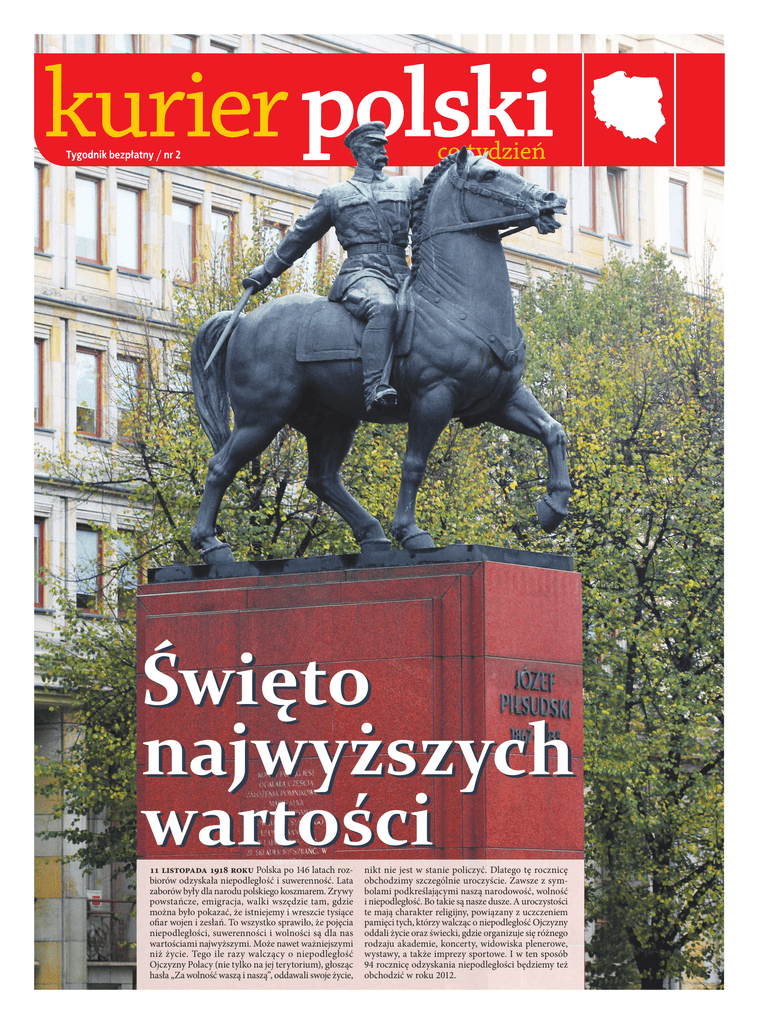 Tygodnik bezpłatny / nr 2 Święto najwyższych wartości 11 listopada 1918 roku Polska po 146 latach rozbiorów odzyskała niepodległość i suwerenność. Lata zaborów były dla narodu polskiego koszmarem. Zrywy powstańcze, emigracja, walki wszędzie tam, gdzie można było pokazać, że istniejemy i wreszcie tysiące ofiar wojen i zesłań. To wszystko sprawiło, że pojęcia niepodległości, suwerenności i wolności są dla nas wartościami najwyższymi. Może nawet ważniejszymi niż życie. Tego ile razy walczący o niepodległość Ojczyzny Polacy (nie tylko na jej terytorium), głosząc hasła „Za wolność waszą i naszą”, oddawali swoje życie, nikt nie jest w stanie policzyć. Dlatego tę rocznicę obchodzimy szczególnie uroczyście. Zawsze z symbolami podkreślającymi naszą narodowość, wolność i niepodległość. Bo takie są nasze dusze. A uroczystości te mają charakter religijny, powiązany z uczczeniem pamięci tych, którzy walcząc o niepodległość Ojczyzny oddali życie oraz świecki, gdzie organizuje się różnego rodzaju akademie, koncerty, widowiska plenerowe, wystawy, a także imprezy sportowe. I w ten sposób 94 rocznicę odzyskania niepodległości będziemy też obchodzić w roku 2012. 02 Wydarzenia z TVS www.kurierpolski24.pl W skrócie z Tylko Pesa chce produkować Tramwaje Śląskie Co prawda oferent jest tylko jeden, ale jeszcze zysków liczyć nie może. Tramwaje Śląskie otworzyły oferty firm, które są zainteresowane wyprodukowaniem i dostarczeniem śląskiej spółce 30 nowych tramwajów. Pracownicy przewoźnika przy otwieraniu ofert zbytnio się nie napracowali, bo wpłynęła tylko jedna od bydgoskiej Pesy. Na wstępnym etapie przetargu na nowe tramwaje było o wiele więcej zapytań związanych z zamówieniem. Kiedy jednak przyszło do konkretów, złożona została tylko jedna oferta. Swoich ofert nie złożyli CAF, Skoda, Stadler i Solaris. W Tramwajach Śląskich nie wiedzą dlaczego. Na razie trwa sprawdzanie oferty Pesy. Dokumentacja przetargowa musi zostać sprawdzona pod kątem zgodności z warunkami zamówienia i zaakceptowana przez Urząd Zamówień Publicznych. Jeśli wszystko będzie w porządku umowa może zostać podpisana jeszcze w tym roku. Zamówienie obejmuje 30 nowoczesnych tramwajów. Pierwsze z nich miałyby trafić na śląskie i zagłębiowskie tory w 2014 roku. Areszt dla kobiety, która spowodowała wypadek w Kozach 20-letnia kobieta, która śmiertelnie potrąciła samochodem dwójkę dzieci na przejściu dla pieszych w miejscowości Kozy pod Bielskiem-Białą, została tymczasowo aresztowana. Sąd podjął taką decyzję po zażaleniu prokuratury. Badania wykazały, że w momencie wypadku kobieta była pod wpływem amfetaminy. Sędzia, uzasadniając decyzję o 3-miesięcznym areszcie dla Karoliny Z. mówił, że kobieta jechała zbyt szybko, a do wypadku doszło na pasach i pod wpływem narkotyków. Mogłoby więc to grozić utrudnianiem śledztwa ze strony 20-latki. Kobiecie grozi do 12 lat więzienia. Ma zarzuty umyślnego naruszenia zasad bezpieczeństwa i doprowadzenia do wypadku. Decyzja sądu nie jest prawomocna. Będzie jednak wprowadzona w życie jak najszybciej i kobieta ma trafić do aresztu śledczego w Katowicach lub Krakowie. Do wypadku doszło 10 października. 11-letni chłopiec zmarł na miejscu wypadku. Jego rok młodszy kolega w ciężkim stanie trafił do szpitala – lekarze jednak nie zdołali go uratować. Wyższa Szkoła Techniczna stawia na film Katowicka „filmówka” ma poważną konkurencję na Górnym Śląsku. W Zabrzu uruchomiono wydział mediów, aktorstwa i reżyserii Wyższej Szkoły Technicznej. Dla następców Andrzeja Wajdy, czy Agnieszki Holland przygotowano nowoczesne pracownie wyposażone w światowej klasy sprzęt. Zajęcia prowadzone będą przez najbardziej doświadczonych ludzi telewizji i filmu. Kibice GieKSy zniszczyli taras Spodka! Podczas hokejowego meczu pomiędzy GKS-em Katowice a Zagłębiem Sosnowiec liczna grupa sympatyków katowickiego klubu stanęła na tarasie Spodka i zaczęła palić szaliki. Zniszczone zostały świeżo wyremontowane balustrady. Straty miasto ocenia na 50 tysięcy złotych. Wiadomo już, że za swoich kibiców zapłaci klub sportowy. Wielkie sprzątanie po ostatnim hokejowym meczu w Spodku. Przywrócić do porządku trzeba nie tylko stan lodowiska, ale przede wszystkim zewnętrzną elewację ikony Katowic. Osmolone i okopcone balustrady to efekt nielegalnej zabawy kibiców GKS-u Katowice. Szaliki drużyn Zagłębia Sosnowiec i Legii Warszawa zaczęły płonąć jeszcze w trakcie meczu. – Gdy policjanci ujawnili to całe zajście, to niestety już nikogo nie było, jednak podjęte przez nas działania doprowadziły już do tego, że mamy pewne informacje o osobach, które najprawdopodobniej brały w tym udział – informuje kom. Jacek Pytel, KMP w Katowicach. Nie kryją się z tym również sami kibice, którzy zarówno zdjęcia, jak i filmik zamieścili w internecie. Urzędnicy nie kryją oburzenia. Na remont Spodka do tej pory miasto wyłożyło już 160 mln zł. Zniszczone przez palące się szaliki balustrady oficjalnie nie były jeszcze po remoncie odebrane. – Kibice klubu z naszego miasta, którzy deklarują miłość do naszego klubu i swojego miasta, w którym żyją dokonują aktu wandalizmu na ikonie Katowic. Trudno mi znaleźć słowa, które by dobitnie skomentowały to wydarzenie – stwierdza Jakub Jarząbek, UM w Katowicach. Trudno też komentować jest całą sytuacje władzom klubu. – Wszystkie szkody, który zostały wczoraj wyrządzone klub bierze na swoją odpowiedzialność. My wszystkie te naprawy usuniemy i poniesiemy wszystkie koszty, jakie będą z tym związane – deklaruje Dariusz Domogała, wiceprezes klubu HC GKS Katowice. Wiadomo już że tego bałaganu posprzątać tak łatwo się nie da. Płyty trzeba wymienić na nowe. Będzie to kosztować około pięćdziesięciu tysięcy złotych. Cz