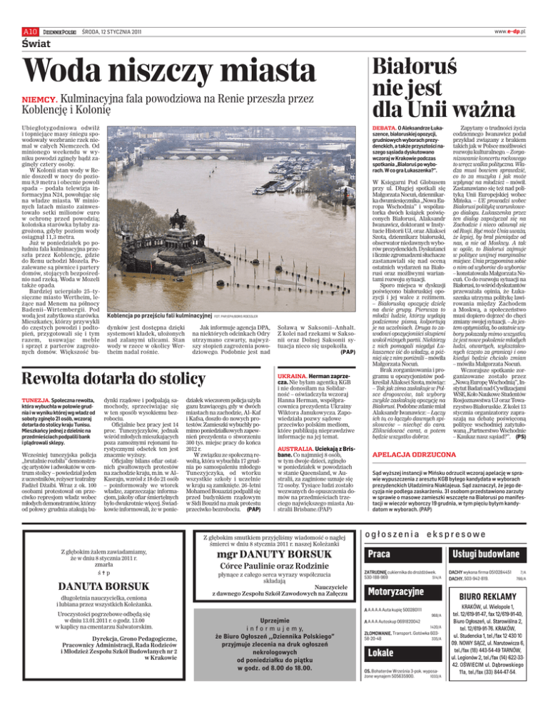 www.e–dp.pl ŚRODA, 12 STYCZNIA 2011 A10 Świat Woda niszczy miasta Kulminacyjna fala powodziowa na Renie przeszła przez Koblencję i Kolonię NIEMCY. Ubiegłotygodniowa odwilż i topniejące masy śniegu spowodowały wezbranie rzek niemal w całych Niemczech. Od minionego weekendu w wyniku powodzi zginęły bądź zaginęły cztery osoby. W Kolonii stan wody w Renie doszedł w nocy do poziomu 8,9 metra i obecnie powoli spada – podała telewizja informacyjna N24, powołując się na władze miasta. W minionych latach miasto zainwestowało setki milionów euro w ochronę przed powodzią; kolońska starówka byłaby zagrożona, gdyby poziom wody osiągnął 11,3 metra. Już w poniedziałek po południu fala kulminacyjna przeszła przez Koblencję, gdzie do Renu uchodzi Mozela. Pozalewane są piwnice i partery domów, stojących bezpośrednio nad rzeką. Woda w Mozeli także opada. Bardziej ucierpiało 25–tysięczne miasto Wertheim, leżące nad Menem na północy Badenii–Wirtembergii. Pod wodą jest zabytkowa starówka. Mieszkańcy, którzy przywykli do częstych powodzi i podtopień, przygotowali się i tym razem, usuwając meble i sprzęt z parterów zagrożonych domów. Większość bu- DEBATA. O Aleksandrze Łukaszence, białoruskiej opozycji, grudniowych wyborach prezydenckich, a także przyszłości naszego sąsiada dyskutowano wczoraj w Krakowie podczas spotkania „Białoruś po wyborach. W co gra Łukaszenka?”. Koblencja po przejściu fali kulminacyjnej dynków jest dostępna dzięki systemowi kładek, ułożonych nad zalanymi ulicami. Stan wody w rzece w okolicy Wertheim nadal rośnie. FOT. PAP/EPA/BORIS ROESSLER Jak informuje agencja DPA, na niektórych odcinkach Odry utrzymano czwarty, najwyższy stopień zagrożenia powodziowego. Podobnie jest nad Rewolta dotarła do stolicy TUNEZJA. Społeczna rewolta, która wybuchła w połowie grudnia i w wyniku której wg władz od soboty zginęło 21 osób, wczoraj dotarła do stolicy kraju Tunisu. Mieszkańcy jednej z dzielnic na przedmieściach podpalili bank i plądrowali sklepy. Wcześniej tunezyjska policja „brutalnie rozbiła” demonstrację artystów i adwokatów w centrum stolicy – powiedział jeden z uczestników, reżyser teatralny Fadżel Dżaibi. Wraz z ok. 100 osobami protestował on przeciwko represjom władz wobec młodych demonstrantów, którzy od połowy grudnia atakują bu- Białoruś nie jest dla Unii ważna dynki rządowe i podpalają samochody, sprzeciwiając się w ten sposób wysokiemu bezrobociu. Oficjalnie bez pracy jest 14 proc. Tunezyjczyków, jednak wśród młodych mieszkających poza zamożnymi rejonami turystycznymi odsetek ten jest znacznie wyższy. Oficjalny bilans ofiar ostatnich gwałtownych protestów na zachodzie kraju, m.in. w Al– Kasrajn, wzrósł z 18 do 21 osób – poinformowały we wtorek władze, zaprzeczając informacjom, jakoby ofiar śmiertelnych było dwukrotnie więcej. Świadkowie informowali, że w ponie- Soławą w Saksonii–Anhalt. Z kolei nad rzekami w Saksonii oraz Dolnej Saksonii sytuacja nieco się uspokoiła. (PAP) UKRAINA. Herman zaprzecza. Nie byłam agentką KGB działek wieczorem policja użyła gazu łzawiącego, gdy w dwóch miastach na zachodzie, Al–Kaf i Kafsa, doszło do nowych protestów. Zamieszki wybuchły pomimo poniedziałkowych zapewnień prezydenta o stworzeniu 300 tys. miejsc pracy do końca 2012 r. W związku ze społeczną rewoltą, która wybuchła 17 grudnia po samospaleniu młodego Tunezyjczyka, od wtorku wszystkie szkoły i uczelnie w kraju są zamknięte. 26–letni Mohamed Bouazizi podpalił się przed budynkiem rządowym w Sidi Bouzid na znak protestu przeciwko bezrobociu. (PAP) i nie donosiłam na Solidarność – oświadczyła wczoraj Hanna Herman, współpracownica prezydenta Ukrainy Wiktora Janukowycza. Zapowiedziała pozwy sądowe przeciwko polskim mediom, które publikują nieprawdziwe informacje na jej temat. AUSTRALIA. Uciekają z Brisbane. Co najmniej 8 osób, w tym dwoje dzieci, zginęło w poniedziałek w powodziach w stanie Queensland, w Australii, za zaginione uznaje się 72 osoby. Tysiące ludzi zostało wezwanych do opuszczenia domów na przedmieściach trzeciego największego miasta Australii Brisbane.(PAP) Z głębokim smutkiem przyjęliśmy wiadomość o nagłej śmierci w dniu 8 stycznia 2011 r. naszej Koleżanki Z głębokim żalem zawiadamiamy, że w dniu 8 stycznia 2011 r. zmarła śp DANUTA BORSUK długoletnia nauczycielka, ceniona i lubiana przez wszystkich Koleżanka. Uroczystości pogrzebowe odbędą się w dniu 13.01.2011 r. o godz. 13.00 w kaplicy na cmentarzu Salwatorskim. Dyrekcja, Grono Pedagogiczne, Pracownicy Administracji, Rada Rodziców i Młodzież Zespołu Szkół Budowlanych nr 2 w Krakowie mgr DANUTY BORSUK Córce Paulinie oraz Rodzinie płynące z całego serca wyrazy współczucia składają Nauczyciele z dawnego Zespołu Szkół Zawodowych na Załęczu W Księgarni Pod Globusem przy ul. Długiej spotkali się Małgorzata Nocuń, dziennikarka dwumiesięcznika „Nowa Europa Wschodnia” i współautorka dwóch książek poświęconych Białorusi, Alaksandr Iwanawicz, doktorant w Instytucie Historii UJ, oraz Aliaksei Szota, dziennikarz białoruski, obserwator niedawnych wyborów prezydenckich. Dyskutanci i licznie zgromadzeni słuchacze zastanawiali się nad oceną ostatnich wydarzeń na Białorusi oraz możliwymi wariantami rozwoju sytuacji. Sporo miejsca w dyskusji poświęcono białoruskiej opozycji i jej walce z reżimem. – Białoruską opozycję dzielę na dwie grupy. Pierwsza to młodzi ludzie, którzy wydają podziemne pisma, kolportują je na uczelniach. Druga to zawodowi opozycjoniści skupieni wokół różnych partii. Niektórzy z nich pomagali niegdyś Łukaszence iść do władzy, a później się z nim poróżnili – mówiła Małgorzata Nocuń. Brak zorganizowania i programu u opozycjonistów podkreślał Aliaksei Szota, mówiąc: – Tak jak zima zaskakuje w Polsce drogowcó