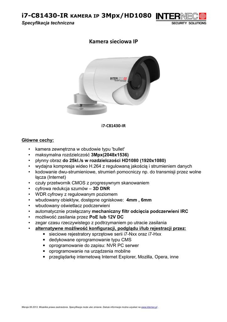 i7-C81430-IR KAMERA IP Specyfikacja techniczna 3Mpx/HD1080 Kamera sieciowa IP i7-C81430-IR Główne cechy: • • • • • • • • • • • • • • kamera zewnętrzna w obudowie typu 'bullet' maksymalna rozdzielczość 3Mpx(2048x1536) płynny obraz do 25kl./s w rozdzielczości HD1080 (1920x1080) wydajna kompresja wideo H.264 z regulowaną jakością i strumieniem danych kodowanie dwu-strumieniowe, strumień pomocniczy np. do transmisji przez wolne łącza (Internet) czuły przetwornik CMOS z progresywnym skanowaniem cyfrowa redukcja szumów – 3D DNR WDR cyfrowy z regulowanym poziomem wbudowany obiektyw, dostępne ogniskowe: 4mm , 6mm wbudowany oświetlacz podczerwieni automatycznie przełączany mechaniczny filtr odcięcia podczerwieni IRC możliwość zasilania przez PoE lub 12V DC zegar czasu rzeczywistego z podtrzymaniem po utracie zasilania alternatywne możliwość konfiguracji, podglądu i/lub rejestracji przez: ▪ sieciowe rejestratory sprzętowe serii i7-Nxx oraz i7-Hxx ▪ dedykowane oprogramowanie typu CMS ▪ oprogramowanie do zapisu: NVR PC serwer ▪ oprogramowanie na urządzenia mobilne ▪ przeglądarkę internetową Internet Explorer, Mozilla, Opera, inne Wersja 06.2013. Wszelkie prawa zastrzeżone. Specyfikacja może ulec zmianie. Dalsze informacje można uzyskać na www.internec.pl . i7-C81430-IR KAMERA IP Specyfikacja techniczna 3Mpx/HD1080 Parametry techniczne: Model Parametry Kamera Przetwornik Min. oświetlenie Elektroniczna migawka Obiektyw Mocowanie obiektywu Cyfrowa redukcja szumów Szeroki zakres dynamiki Dzień / Noc BLC Standard kompresji Kompresja wideo Strumień bitowy Kompresja audio Dwustrumieniowość Obraz Maks.rozdzielczość obrazu Liczba klatek na sekundę (fps) przy zadanej rozdzielczości Ustawienia obrazu Sieć Zapis sieciowy Alarmy Protokoły Funkcje Zgodne systemy Interfejs Interfejs komunikacyjny Przycisk reset Ogólne Warunki pracy Oświetlacz Zasilanie Pobór mocy Wymiary Waga i7-C81430-IR Kamera 3Mpx w obudowie zewnętrzej typu 'bullet' 1/3” CMOS z progresywnym skanowaniem 0.05Lux @ (F1.2,AGC ON), 0.14Lux @ (F2.0,AGC ON), 0Lux przy IR ON 1/3s -1/100,000s 4mm/F2.0 , 6mm/F2.0 M12 3D DNR D-WDR – cyfrowy WDR Filtr odcięcia podczerwieni IR cut: 3 poziomy przełączania automatycznego; harmonogram godzinowy przełączania Tak z wyborem strefy H.264/MPEG4/MJPEG 32 Kbps~16Mbps Nie dotyczy Tak 2048 x 1536 p× 50Hz: 12.5fps (2048 x 1536), 25fps (1920 × 1080), 25fps (1280 x 720) 60Hz: 15fps (2048 x 1536), 30fps (1920 × 1080), 30fps (1280 x 720) Nasycenie, jasność, kontrast, barwa, ostrość: ustawiane przez CMS lub przeglądarkę NAS Detekcja ruchu, sabotaż wideo, nieuprawnione logowanie, błąd zapisu, błąd sieci IP TCP/IP, HTTP, DHCP, DNS, DDNS, RTP, RTSP, PPPoE, SMTP, NTP, UPnP, ICMP, IGMP ,SNMP, FTP, 802.1x, QoS ,HTTPS, UPnP, IPV6 Ochrona hasłem, znak wodny, przeciwmigotanie, lustro, maski prywatności na obrazie, smart IR ONVIF, PSIA, CGI RJ45 10M / 100M Ethernet Tak Kamera zewnętrzna IP66 ; -25℃~60℃, wilgotność maks. 95% (nieskondensowana) Wbudowany oświetlacz podczerwieni 15-25m. 12V DCV±10% / PoE (802.3af) maks. 5,5W 60x76x138mm (z uchwytem) 300g Zasilacz nie jest zawarty w zestawie, należy nabyć oddzielnie Wersja 06.2013. Wszelkie prawa zastrzeżone. Specyfikacja może ulec zmianie. Dalsze informacje można uzyskać na www.internec.pl . i7-C81430-IR KAMERA IP Specyfikacja techniczna 3Mpx/HD1080 Informacje do zamówień: i7-C81430-IR 4mm i7-C81430-IR 6mm Wymiary: jednostka [mm] Wersja 06.2013. Wszelkie prawa zastrzeżone. Specyfikacja może ulec zmianie. Dalsze informacje można uzyskać na www.internec.pl .