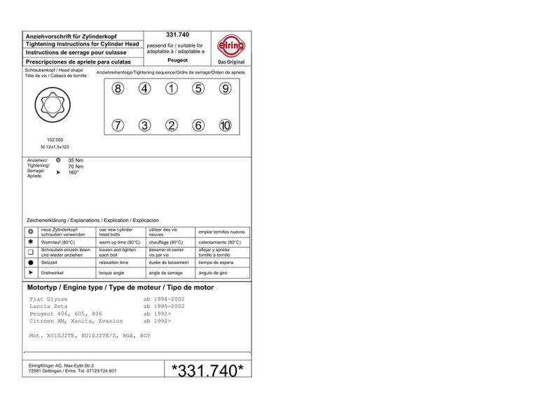 Anziehvorschrift für Zylinderkopf Tightening Instructions for Cylinder Head Instructions de serrage pour culasse 331.740 passend für / suitable for adaptable à / adaptable a Peugeot Prescripciones de apriete para culatas Schraubenkopf / Head shape Tête de vis / Cabeza de tornillo Anziehreihenfolge/Tightening sequence/Ordre de serrage/Orden de apriete 152.550 M 12x1,5x123 Anziehen/ Tightening/ Serrage/ Apriete ❂ ➤ 35 Nm 70 Nm 160° Zeichenerklärung / Explanations / Explication / Explicacion ❂ neue Zylinderkopfschrauben verwenden use new cylinder head bolts utiliser des vis neuves emplar tornillos nuevos ✱ Warmlauf (80°C) warm up time (80°C) chauffage (80°C) calentamiento (80°C) ❏ Schrauben einzeln lösen und wieder anziehen loosen and tighten each bolt deserrer et serrer vis par vis aflojar y apretar tornillo a tornillo ● Setzzeit relaxation time durée de tassement tiempo de espera ➤ Drehwinkel torque angle angle de serrage ángulo de giro Motortyp / Engine type / Type de moteur / Tipo de motor Fiat Ulysse Lancia Zeta Peugeot 406, 605, 806 Citroen XM, Xanita, Evasion ab ab ab ab 1994-2002 1995-2002 1992> 1992> Mot. XU10J2TE, XU10J2TE/Z, RGX, RGY ElringKlinger AG, Max-Eyth-Str.2 72581 Dettingen / Erms. Tel. 07123/724 601 *331.740*