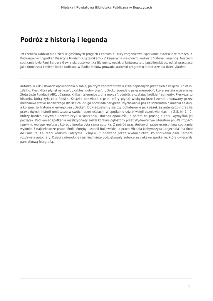 Miejska i Powiatowa Biblioteka Publiczna w Ropczycach Podróż z historią i legendą 19 czerwca Oddział dla Dzieci w gościnnych progach Centrum Kultury zorganizował spotkanie autorskie w ramach IX Podkarpackich Spotkań Pisarzy z Młodymi Czytelnikami - Z książką na walizkach: Podróż z historią i legendą. Gościem spotkania była Pani Barbara Gawryluk, absolwentka filologii szwedzkiej Uniwersytetu Jagiellońskiego, od lat pracująca jako tłumaczka i dziennikarka radiowa. W Radiu Kraków prowadzi autorski program o literaturze dla dzieci Alfabet. Autorka w kilku słowach opowiedziała o sobie, po czym zaprezentowała kilka napisanych przez siebie książek. To m.in. „Baltic. Pies, który płynął na krze”, „Kaktus, dobry pies”, „Dżok, legenda o psiej wierności”, która została wpisana na Złotą Listę Fundacji ABC, „Czarna, Klifka i tajemnice z dna morza”, osobiście czytając krótkie fragmenty. Pierwsza to historia, którą żyła cała Polska. Książka opowiada o psie, który płynął Wisłą na krze i został uratowany przez mechanika statku badawczego RV Baltica, druga opowiada perypetie wychowania psa ze schroniska o imieniu Kaktus, a kolejna, to historia wiernego psa „Dżoka”. Dowiedzieliśmy się czy bohaterowie jej książek są autentyczni oraz ile prawdziwych historii umieszcza w swoich opowieściach. W spotkaniu udział wzięli uczniowie klas II z Z.S. Nr 1 i 2, którzy bardzo aktywnie uczestniczyli w spotkaniu, słuchali opowieści, a potem na prośbę autorki wymyślali jej początek. Pod koniec spotkania rozstrzygnięty został konkurs ogłoszony przez Wydawnictwo Literatura ph. Na tropach tajemnic mojego regionu , którego jurorką była sama autorka. Z pośród prac złożonych przez uczestników spotkania wyłoniła 3 najciekawsze prace Emilii Poręby i Izabeli Bukowskiej, a praca Michała Jachymczyka „pojechała” na finał do Łańcuta. Laureaci konkursu otrzymali książki ufundowane przez Wydawnictwo. Po spotkaniu pani Barbara rozdawała autografy. Dzieci zadowolone i uśmiechnięte podziękowały autorce za ciekawe spotkanie, które uwieczniły pamiątkową fotografią. 1