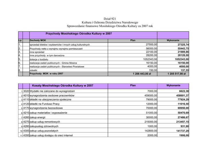 Dział 921 Kultura i Ochrona Dziedzictwa Narodowego Sprawozdanie finansowe Mosińskiego Ośrodka Kultury za 2007 rok Przychody Mosińskiego Ośrodka Kultury w 2007 Lp. Dochody MOK 1. sprzedaż biletów i wydawnictw i innych usług kulturalnych 27500,00 27325,74 2. 3. 4. Przychody netto z wynajmu wynajmu pomieszczeń inna sprzedaż inne przychody w tym darowizna 56000,00 22100,00 28200,00 55443,75 21989,86 28128,00 5. 6. 7. 8. dotacja z budżetu 1052343,00 16150,00 4000,00 150,00 1 206 443,00 zł 1052343,00 16150,00 4000,00 137,55 1 205 517,90 zł realizacja zadań publicznych - Gmina Mosina realizacja zadań publicznych - Starostwo Powiatowe odsetki Przychody MOK w roku 2007 Koszty Mosińskiego Ośrodka Kultury w 2007 Plan Wykonanie Plan Wykonanie 1 3020 Wydatki nie zaliczane do wynagrodzeń 7000,00 6622,38 2 4010 wynagrodzenia osobowe pracowników 459000,00 458601,37 3 4110 składki na ubezpieczenia społeczne 79000,00 77924,29 4 4120 składki na Fundusz Pracy 12000,00 11016,50 5 4170 wynagrodzenia bezosobowe 70000,00 69950,00 6 4210 zakup materiałów i wyposażenie 51000,00 50470,69 7 4260 zakup energii 30000,00 27486,67 8 4270 zakup usług remontowych 215000,00 213457,15 9 4280 zakupusług zdrowotnych 1000,00 931,90 10 4300 zakup usług pozostałych 142800,00 141737,29 11 4350 zakup usług dostępu do sieci internet 2000,00 1906,00 12 13 14 15 16 17 18 19 I 4360 opłaty z tytułu usług telekom sieci komórkowej 4370 opłaty z tytułu usług telekom sieci stacjonarnej 4410 podróże służbowe krajowe 4430 rózne opłaty i składki - ubezpieczenia rzeczowe 4440 odpisy na ZFŚS 4720 amortyzacja jednorazowa zakup sprzętu muzycznego, komputera 4720 amortyzacja jednorazowa zakup programów Symfonia 4720 amortyzacja liniowa I Koszty operacyjne realizacja zadań publicznych - Gmina Mosina realizacja zadań publicznych - Starostwo Powiatowe aktualizacja wartości środków trwałych II Pozostałe koszty operacyjne Koszty MOK (suma: I + II) 21 22 23 II Koszty operacyjne ogółem 3020 Nagrody i wydatki nie zaliczane do wynagrodzeń 1 2 3 5 6 7 2278,97 7394,63 12101,87 7433,51 8850,60 21005,00 4254,75 9071,14 1144000,00 44000,00 12500,00 4400,00 1132494,71 43774,33 12061,13 4382,06 60900,00 1 204 900,00 zł Plan 60217,52 1 192 712,23 zł wykonanie 7 000,00 zł 6 622,38 zł szkolenia przcowników, kursy koszty pracownicze inne koszty 4010 Wynagrodzenia osobowe 4 2500,00 7500,00 12200,00 8000,00 9000,00 21500,00 4500,00 10000,00 Wynagrodzenia osobowe 6 622,38 zł 459 000,00 zł 459 000,00 zł 458 601,37 zł 458 601,37 zł inne składniki wynagrodzenia 4110 Składki na ZUS (opłacana przez pracodawcę) 79 000,00 zł 77 924,29 zł 4110 Składki na Fundusz Pracy 12 000,00 zł 11 016,50 zł 4170 Wynagrodzenia bezosobowe 70 000,00 zł 69 950,00 zł Umowy autorskie (nie związane z pracownikami) 33 400,00 zł 33 370,00 zł Umowy o dzieło (nie związane z pracownikami) 36 600,00 zł 36 580,00 zł 51 000,00 zł 50 470,69 zł 4210 Zakup materiałów i wyposażenie w tym: 8 zakup oleju opałowego 9 zakup artykułów biurowych 6 849,54 zł zakup środków czystości 2 987,39 zł zakup artykułów przemysłowych 4 098,12 zł 12 zakup czasopism i wyposażenia niskocennego 5 462,40 zł 13 zakup materiałów na imprezy kulturalne 4 370,21 zł 14 zakup artykułów na dzialalność miejską koła zainteresowań 1 934,66 zł 15 9 434,30 zł 16 organizacja imprez kulturalnych, wystaw, koncertów, festynów, przeglądów teatralnych, konkursów z tym zakupy dla; Izba Muzealna 17 Galeria Miejska 1 507,44 zł 10 11 13 668,99 zł 157,64 zł 18 4260 Zakup energii Budynek MOK ogółem: 19 zużycie energii elektrycznej 20 zużycie wody 21 24 25 28 30 31 993,65 zł 7 668,28 zł 8 000,00 zł 6 176,76 zł 1 589,40 zł 4 181,60 zł zużycie wody 405,76 zł 215 000,00 zł 213 457,15 zł 33 000,00 zł 32 029,46 zł 33 000,00 zł 32 029,46 zł podłączenie instalacji gazowej remonty wodno-kanalizacyjne Budynek Izby Muzealnej ogółem: 182 000,00 zł 181 427,69 zł remont dachu w Izbie Muzealnej 182 000,00 zł 181 427,69 zł 4280 Zakup usług zdrowotnych BHP 1 000,00 zł 931,90 zł 142 800,00 zł 141 737,29 zł 4300 Zakup usług pozostałych 29 12 647,98 zł zużycie energii cieplnej - gazu Budynek MOK ogółem: 27 21 309,91 zł zużycie energii elektrycznej 4270 Zakup usług remontowych 26 27 486,67 zł zużycie energii cieplnej - gazu Budynek Izby Muzealnej ogółem: 23 30 000,00 zł 22 000,00 zł usługi pocztowe monitoring usługi transportowe 19 731,03 zł 2 924,40 zł 10 394,49 zł 32 33 utrzymanie czystości - ZUK 2 791,60 zł usługi kulturalne na rzecz mieszkańców wsi w Gminie 2 835,20 zł 34 usługi - Dozynki Gminne 11 778,85 zł 35 usługi - Dni Mosiny 39 716,03 zł 36 usługi Izba Muzealna 3 084,99 zł 37 usługi Galeria Miejska 4 710,55 zł 38 Ogólnopolski Festiwal Gitery 5 339,12 zł 39 40 organizacja imprez kulturalnych, wystaw, koncertów, festynów, przeglądów teatralnych, konkursów z tym zakupy dla; 25 688,83 zł XI Konferencja Rady Kultury 12 742,20 zł 4350 zakup usług dostępu do sieci internet 4360 opłaty z tytułu usług telekom sieci komórkowej 4370 opłaty z tytułu usług telekom sieci stacjonarnej 4410 podróże służbowe krajowe 41 42 43 44 45 47 48 50 2500,00 7500,00 12200,00 2278,97 7394,63 12 101,87 zł 8 456,19 zł delegacje służbowe - MOK i Izba Muzealna 3 011,20 zł delegacje służbowe - Galeria 4430 różne opłaty i składki - ubezpieczenia rzeczowe ZAIKS ubezpieczenie budynku i inne podatki 4720 amortyzacja amortyzacja jednorazowa - zakup sprzętu muzycznego i komputera amortyzacja jednorazowa - zakup programów Symfonia amortyzacja liniowa Koszty operacyjne ogółem 634,48 zł 8 000,00 zł 7 433,51 zł 6000,00 2000,00 9000,00 5524,00 1909,51 8850,60 36 000,00 zł 34 330,89 zł 21500,00 4500,00 21005,00 4254,75 10000,00 9071,14 1 144 000,00 zł 1 132 494,71 zł 16 150,00 zł 15 141,56 zł 8 500,00 zł 8 500,00 zł Orkiestra ZHP środki własne 6 700,00 zł 6 641,56 zł Ogółe