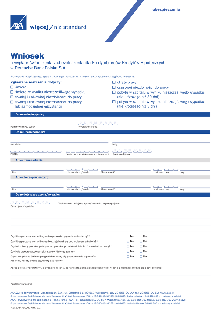 ubezpieczenia Wniosek o wypłatę świadczenia z ubezpieczenia dla Kredytobiorców Kredytów Hipotecznych w Deutsche Bank Polska S.A. Prosimy zaznaczyć z jakiego tytułu składane jest roszczenie. Wniosek należy wypełnić szczegółowo i czytelnie. Zgłaszane roszczenie dotyczy: śmierci śmierci w wyniku nieszczęśliwego wypadku trwałej i całkowitej niezdolności do pracy trwałej i całkowitej niezdolności do pracy lub samodzielnej egzystencji utraty pracy czasowej niezdolności do pracy pobytu w szpitalu w wyniku nieszczęśliwego wypadku (nie krótszego niż 30 dni) pobytu w szpitalu w wyniku nieszczęśliwego wypadku (nie krótszego niż 3 dni) Dane wniosku/polisy D D M M R R R R Wystawiona dnia Numer wniosku/polisy Dane Ubezpieczonego Nazwisko Imię D D M M R R R R PESEL Seria i numer dokumentu tożsamości Data urodzenia Adres zamieszkania Ulica Numer domu/lokalu Miejscowość Kod pocztowy Kraj Numer domu/lokalu Miejscowość Kod pocztowy Kraj Adres korespondencyjny Ulica Dane dotyczące zgonu/wypadku D D M M R Data zgonu/wypadku R R R Okoliczności i miejsce zgonu/wypadku (wyczerpująco): Czy Ubezpieczony w chwili wypadku prowadził pojazd mechaniczny?* Tak Nie Czy Ubezpieczony w chwili wypadku znajdował się pod wpływem alkoholu?* Tak Nie Czy był spisany protokół policyjny lub protokół przedstawiciela BHP w zakładzie pracy?* Tak Nie Czy była przeprowadzona sekcja zwłok (dotyczy zgonu)* Tak Nie Czy w związku ze śmiercią/wypadkiem toczy się postępowanie sądowe?* Tak Nie Jeśli tak, należy podać sygnaturę akt sprawy: Adres policji, prokuratury w przypadku, kiedy w sprawie zdarzenia ubezpieczeniowego toczy się bądź zakończyło się postępowanie: * zaznaczyć właściwe AXA Życie Towarzystwo Ubezpieczeń S.A., ul. Chłodna 51, 00-867 Warszawa, tel. 22 555 00 00, fax 22 555 00 52, www.axa.pl Organ rejestrowy: Sąd Rejonowy dla m.st. Warszawy, XII Wydział Gospodarczy KRS, Nr KRS 41216, NIP 521-10-36-859, Kapitał zakładowy: 444 440 000 zł – wpłacony w całości AXA Towarzystwo Ubezpieczeń i Reasekuracji S.A., ul. Chłodna 51, 00-867 Warszawa, tel. 22 555 00 00, fax 22 555 05 00, www.axa.pl Organ rejestrowy: Sąd Rejonowy dla m.st. Warszawy, XII Wydział Gospodarczy KRS, Nr KRS 38616; NIP 521-10-36-865; Kapitał zakładowy: 83 341 500 zł – wpłacony w całości WZ/2014/10/61 wer. 1.2 Nazwa i adres placówki medycznej/szpitala, w której(ym) leczył się Ubezpieczony w związku ze zdarzeniem ubezpieczeniowym: Nazwa i adres przychodni podstawowej opieki zdrowotnej, w której leczył się Ubezpieczony: Dane dotyczące trwałej i całkowitej niezdolności do pracy / trwałej i całkowitej niezdolności do pracy lub samodzielnej egzystencji Nazwa i adres placówki medycznej/szpitala, w której(ym) leczył się Ubezpieczony w związku ze zdarzeniem ubezpieczeniowym: Data wydania pierwszorazowego orzeczenia lekarza orzecznika ZUS lub innego organu rentowego o czasowej lub trwałej niezdolności do pracy lub samodzielnej egzystencji: D D M M R R R R Dane dotyczące utraty pracy Przyczyna utraty pracy (prosimy zaznaczyć): wygaśnięcie stosunku pracy wypowiedzenie umowy z winy Ubezpieczonego wypowiedzenie umowy przez Ubezpieczonego porozumienie stron wypowiedzenie umowy przez pracodawcę inna: Dane dotyczące czasowej niezdolności do pracy / pobytu w szpitalu w wyniku nieszczęśliwego wypadku Data zwolnienia lekarskiego / pobytu w szpitalu od D D M M R R R R do D D M M R R R R Nazwa i adres placówki medycznej/szpitala, w której(ym) leczył się Ubezpieczony w związku ze zdarzeniem ubezpieczeniowym: Czy leczenie zostało zakończone? Tak Nie Przyczyna czasowej niezdolności do pracy / pobytu w szpitalu: choroba wypadek (wymagane wypełnienie pól powyżej dotyczących miejsca i okoliczności wypadku) Dane zgłaszającego roszczenie Nazwisko +48 Imię Telefon komórkowy +48 Telefon stacjonarny E-mail Adres korespondencyjny - Kod pocztowy Ulica Numer domu/lokalu Miejscowość Ulica Numer domu/lokalu Miejscowość Ulica Numer domu/lokalu Miejscowość Forma wypłaty świadczenia* Przelew bankowy Właściciel rachunku bankowego Numer rachunku bankowego Adres właściciela rachunku bankowego: - Kod pocztowy Przekaz pocztowy Adres: - Kod pocztowy Dokumenty wymagane do zgłoszenia roszczenia Prosimy przekazać do odpowiedniego Towarzystwa oryginały lub kopie następujących dokumentów poświadczonych za zgodność z oryginałem przez odpowiednio pracownika Deutsche Bank Polska S.A., notariusza, pracownika USC, pracownika Towarzystwa bądź – w przypadku dokumentacji medycznej – pracownika placówki medycznej, z której pochodzi dokumentacja. Prosimy zaznaczyć krzyżykiem załączane do wniosku kopie dokumentów. ŚMIERĆ/ŚMIERĆ W WYNIKU NIESZCZĘŚLIWEGO WYPADKU Do zgłoszenia należy dołączyć: opis okoliczności zdarzenia kopię odpisu skróconego aktu zgonu Ubezpieczonego kopię karty statystycznej do karty zgonu lub innego dokumentu potwierdzającego przyczynę śmierci kopię opisu świadczenia pierwszej pomocy lub pomocy doraźnej (pogotowie ratunkowe, szpital itp.) jeżeli zdarzenie jest następstwem nieszczęśliwego wypadku – kopię protokołu opisującego okoliczności zdarzenia (protokołu powypadkowego sporządzonego przez Komisję BHP, notatki urzędowej z policji, protokołu oględzin miejsca zdarzenia w przypadku wypadku komunikacyjnego, wyniku postanowienia z prokuratury, w przypadku gdy zostało wszczęte postępowanie) * zaznaczyć właściwe WZ/2014/10/61 wer. 1.2 kopię dokumentacji medycznej z przychodni, szpitala lub adresy placówek, w których Ubezpieczony był zarejestrowany i leczony w związku z zaistniałym zdarzeniem ubezpieczeniowym, obejmującej okres 3 lat przed przystąpieniem do ubezpieczenia i okres od dnia przystąpienia do ubezpieczenia do momentu zgłoszenia roszczenia, a w przypadku braku jej posiadania, adresy tych placówek kopię dowodu osobistego lub innego dokumentu tożsamości każdego z Uposażony