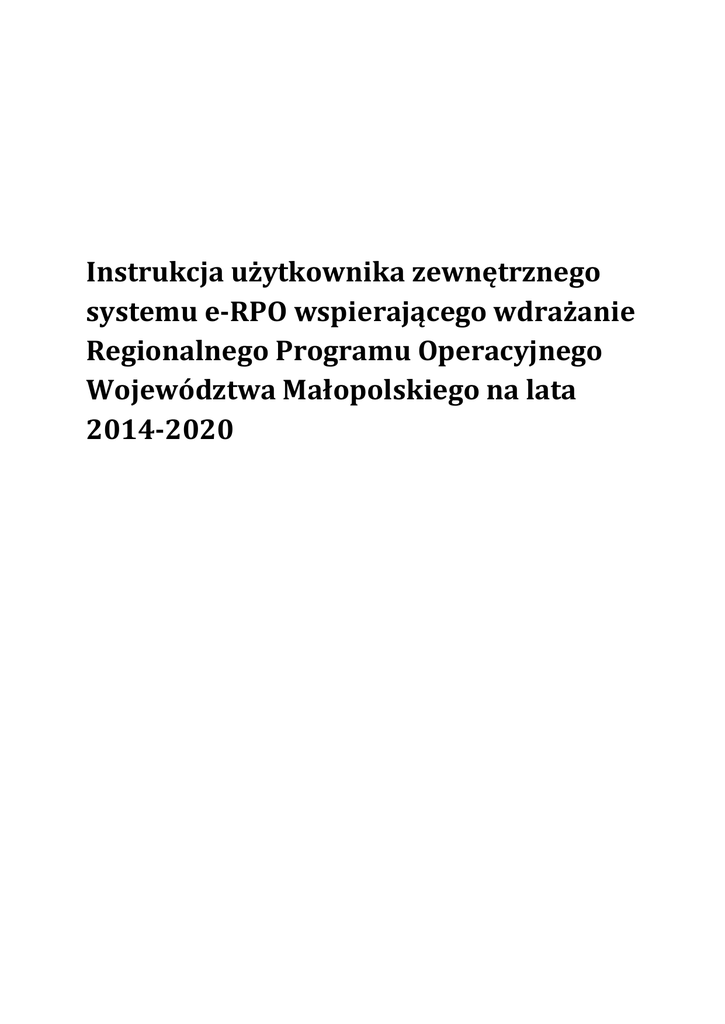 Instrukcja użytkownika zewnętrznego systemu e-RPO wspierającego wdrażanie Regionalnego Programu Operacyjnego Województwa Małopolskiego na lata 2014-2020 Spis treści System e-RPO .......................................................................................................................................... 3 System e-RPO krok po kroku ................................................................................................................... 4 Odzyskiwanie hasła ................................................................................................................................. 5 Strona główna ......................................................................................................................................... 5 Schemat zgłoszenia wniosku za pomocą systemu e-RPO ....................................................................... 5 Złożenie wniosku o dofinansowanie ....................................................................................................... 6 Walidacja ................................................................................................................................................. 8 Teczka projektu ....................................................................................................................................... 8 Wysłanie wniosku do Urzędu .................................................................................................................. 9 Podpis elektroniczny ............................................................................................................................. 10 Jak złożyć podpis?.................................................................................................................................. 11 Wysyłanie i odbieranie dokumentów.................................................................................................... 11 Krok po kroku, gdy Wnioskodawca otrzymał pismo ............................................................................. 12 Krok po kroku, gdy Wnioskodawca wysłał pismo ................................................................................. 13 UPO........................................................................................................................................................ 13 Kontakt .................................................................................................................................................. 13 2 System e-RPO System e-RPO jest lokalnym systemem informatycznym wspierającym wdrażanie Regionalnego Programu Operacyjnego Województwa Małopolskiego na lata 2014-2020. Warunkiem korzystania z Systemu e-RPO posiadanie konta w Systemie. Rejestracja w Systemie e-RPO możliwa jest pod adresem: erpo.malopolska.pl. Poszczególne zasady korzystania z systemu zostały określone w załączniku 1 do Uchwały ZWM Nr 792/15 z dnia 23 czerwca 2015 r. Każdy Użytkownik systemu akceptuje w/w zasady na etapie zakładania konta w systemie. Korzystanie z Systemu e-RPO wymaga uprzedniej rejestracji w celu założenia konta. Zakładane Konto należy do Użytkownika. Użytkownik może korzystać z Systemu e-RPO za pomocą dowolnego komputera połączonego z Internetem, przy spełnieniu wymagań technicznych określonych w Regulaminie korzystania z Systemu e-RPO. System e-RPO umożliwia w szczególności: wprowadzanie, przechowywanie, modyfikowanie danych aplikowanie o wsparcie finansowe (wniosek aplikacyjny) rozliczenie projektu w ramach RPO WM (wniosek o płatność/ postępowania kontrolne) monitorowanie trwałości projektu prowadzenie wszelkiej korespondencji pomiędzy IZ lub IP a Wnioskodawcą/ Beneficjentem Szczegółowe warunki ubiegania się o dofinansowanie za pośrednictwem systemu e-RPO jak i sposób korespondencji określony jest w Regulaminie konkursu, jak również w umowie o dofinansowanie projektu. 3 System e-RPO krok po kroku Dostęp do systemu e-RPO możliwy jest pod adresem https://erpo.malopolska.pl Na stronie umieszczone są funkcje umożliwiające rejestrację konta oraz zalogowanie się do systemu. W tym celu, po wejściu na stronę erpo.malopolska.pl, należy wybrać opcję , wpisać wymagane dane i kliknąć przycisk Wyświetlony zostanie Regulamin systemu e-RPO i możliwość zarejestrowania konta. Po poprawnej rejestracji pojawi się następujący komunikat: Podany adres e-mail staje się automatycznie loginem wykorzystywanym w procesie logowania do systemu. Hasło musi składać się, co najmniej 8 znaków oraz zawierać małe i wielkie litery oraz cyfry. Hasło nie może być powszechnie używanymi słowami, w szczególności nie należy, jako hasło wykorzystywać: 4 dat, imion, nazwisk, inicjałów, numerów rejestracyjnych samochodów, numerów telefonów bądź innych nazw bezpośrednio kojarzących się z Wnioskodawcą/ Beneficjentem. Na podany adres e-mail zostanie przesłana wiadomość zawierająca link aktywacyjny oraz login dla utworzonego konta. W celu dokończenia aktywacji konta należy postępować zgodnie z przedstawioną w ww. wiadomości instrukcją. Odzyskiwanie hasła System e-RPO posiada funkcję nadawania nowego hasła. W przypadku braku możliwości zalogowania się do systemu należy wybrać w głównym oknie systemowym przycisk wpisać adres e-mail, który używany jest podczas logowania. , następnie System automatycznie wygeneruje wiadomość z linkiem umożliwiającym zmianę dotychczasowego hasła, który zostanie przesłany na wskazany adres e-mail. Strona główna Po zalogowaniu się do systemu zostanie wyświetlona strona główna na której znajdują się podstawowe opcje systemowe. Istnieje możliwość wejścia do 3 zakładek, umożliwiających aplikowanie do aktualnych naborów lub wejście do teczki projektów, gdzie znajdują się stworzone przez danego użytkownika wnioski. Schemat zgłoszenia wniosku za pomocą systemu e-RPO Zalogowanie się do systemu po 