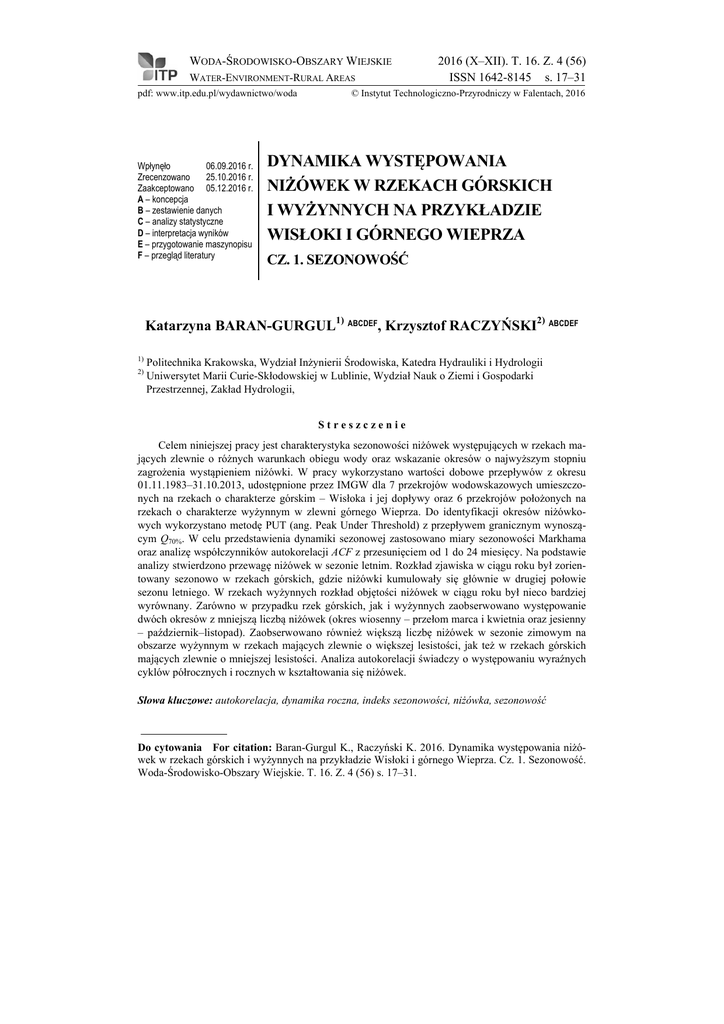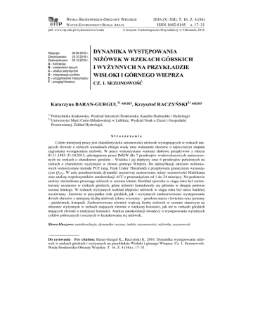 WODA-ŚRODOWISKO-OBSZARY WIEJSKIE WATER-ENVIRONMENT-RURAL AREAS pdf: www.itp.edu.pl/wydawnictwo/woda Wpłynęło 06.09.2016 r. Zrecenzowano 25.10.2016 r. Zaakceptowano 05.12.2016 r. A – koncepcja B – zestawienie danych C – analizy statystyczne D – interpretacja wyników E – przygotowanie maszynopisu F – przegląd literatury 2016 (X–XII). T. 16. Z. 4 (56) ISSN 1642-8145 s. 17–31 © Instytut Technologiczno-Przyrodniczy w Falentach, 2016 DYNAMIKA WYSTĘPOWANIA NIŻÓWEK W RZEKACH GÓRSKICH I WYŻYNNYCH NA PRZYKŁADZIE WISŁOKI I GÓRNEGO WIEPRZA CZ. 1. SEZONOWOŚĆ Katarzyna BARAN-GURGUL1) ABCDEF, Krzysztof RACZYŃSKI2) ABCDEF 1) 2) Politechnika Krakowska, Wydział Inżynierii Środowiska, Katedra Hydrauliki i Hydrologii Uniwersytet Marii Curie-Skłodowskiej w Lublinie, Wydział Nauk o Ziemi i Gospodarki Przestrzennej, Zakład Hydrologii, Streszczenie Celem niniejszej pracy jest charakterystyka sezonowości niżówek występujących w rzekach mających zlewnie o różnych warunkach obiegu wody oraz wskazanie okresów o najwyższym stopniu zagrożenia wystąpieniem niżówki. W pracy wykorzystano wartości dobowe przepływów z okresu 01.11.1983–31.10.2013, udostępnione przez IMGW dla 7 przekrojów wodowskazowych umieszczonych na rzekach o charakterze górskim – Wisłoka i jej dopływy oraz 6 przekrojów położonych na rzekach o charakterze wyżynnym w zlewni górnego Wieprza. Do identyfikacji okresów niżówkowych wykorzystano metodę PUT (ang. Peak Under Threshold) z przepływem granicznym wynoszącym Q70%. W celu przedstawienia dynamiki sezonowej zastosowano miary sezonowości Markhama oraz analizę współczynników autokorelacji ACF z przesunięciem od 1 do 24 miesięcy. Na podstawie analizy stwierdzono przewagę niżówek w sezonie letnim. Rozkład zjawiska w ciągu roku był zorientowany sezonowo w rzekach górskich, gdzie niżówki kumulowały się głównie w drugiej połowie sezonu letniego. W rzekach wyżynnych rozkład objętości niżówek w ciągu roku był nieco bardziej wyrównany. Zarówno w przypadku rzek górskich, jak i wyżynnych zaobserwowano występowanie dwóch okresów z mniejszą liczbą niżówek (okres wiosenny – przełom marca i kwietnia oraz jesienny – październik–listopad). Zaobserwowano również większą liczbę niżówek w sezonie zimowym na obszarze wyżynnym w rzekach mających zlewnie o większej lesistości, jak też w rzekach górskich mających zlewnie o mniejszej lesistości. Analiza autokorelacji świadczy o występowaniu wyraźnych cyklów półrocznych i rocznych w kształtowania się niżówek. Słowa kluczowe: autokorelacja, dynamika roczna, indeks sezonowości, niżówka, sezonowość Do cytowania For citation: Baran-Gurgul K., Raczyński K. 2016. Dynamika występowania niżówek w rzekach górskich i wyżynnych na przykładzie Wisłoki i górnego Wieprza. Cz. 1. Sezonowość. Woda-Środowisko-Obszary Wiejskie. T. 16. Z. 4 (56) s. 17–31. 18 Woda-Środowisko-Obszary Wiejskie. T. 16. Z. 4 (56) WSTĘP Niżówką nazywa się okres, w którym przepływy są nie większe od przyjętego wcześniej poziomu granicznego Qg [YEVJEVICH 1967; ZIELIŃSKA 1963]. Wystąpienie niżówki rzecznej oznacza zmniejszenie dostępności zasobów wodnych na przykład na cele gospodarcze (np. w przypadku powierzchniowych ujęć wody). Ocena zmienności sezonowej występowania zjawiska stanowi istotny element strategii zarządzania zasobami wodnymi danego obszaru. Dobór poziomu granicznego jest subiektywny i związany z charakterem lub celem danego opracowania [OZGA-ZIELIŃSKA, BRZEZIŃSKI 1997]. Podstawowymi charakterystykami niżówki są: czas trwania, rozumiany jako długość okresu o przepływach mniejszych lub równych przepływowi granicznemu Qg, objętość opisująca ilość wody, której w okresie trwania niżówki brakuje do zapewnienia Qg, przepływ minimalny oraz średni. Oprócz wartości poszczególnych charakterystyk niżówek, ważna jest także informacja o ich występowaniu w czasie. Analiza dynamiki sezonowej pozwala określić, w jakim okresie w roku najczęściej występują niżówki, kiedy koncentrują się lub też utrzymują się najdłużej, a w których okresach praktycznie nie występują. Taka informacja umożliwia opracowanie strategii zarządzania dostępnymi wodami – od określania okresów, na które należy gromadzić największe zapasy wody, po wyznaczenie okresów najdogodniejszych do ich uzupełniania. Analizę dynamiki niżówek można prowadzić w ujęciu jednorocznym, uzyskując informację o rozkładzie niżówek w ciągu roku oraz w sezonie zima/lato, jak również w okresie wieloletnim. W drugim przypadku uzyskuje się obraz zmienności zasobów wodnych i zmian w cyklu występowania lat suchych i mokrych, a w konsekwencji możliwe jest wypracowanie modelu prognostycznego na przyszłe cykle. Celem niniejszej pracy jest ocena dynamiki sezonowej występowania niżówek w ciągu roku w rzekach mających zlewnie o różnych cechach fizyczno-geologicznych oraz wskazanie okresów z największymi zagrożeniami wystąpieniem niżówek. W oddzielnej pracy, stanowiącej drugą część badanego zagadnienia [BARAN-GURGUL, RACZYŃSKI 2017], przedstawiono analizy wieloletnie. METODY BADAŃ Ogólną informację dotyczącą rozkładu niżówek w sezonie letnim i zimowym uzyskano na podstawie sezonowego współczynnika SWNL, niedoboru odpływu niżówkowego wykształconego w sezonie letnim, wyrażonego jako [TOMASZEWSKI 2012]: SWNL VnL 100% VnR © ITP Woda Środ. Obsz. Wiej. 2016 (X–XII). T. 16. Z. 4 (56) (1) K. Baran-Gurgul, K. Raczyński: Dynamika występowania niżówek… Cz. 1 19 gdzie: VnL = suma objętości niżówek półrocza letniego (V–X), tys. m3; VnR = suma objętości niżówek w całym roku, tys. m3. Wartości współczynnika od 0 do 50% świadczą o większym udziale niżówek w okresie zimowym (IX–IV) niż letnim, większe niż 50% – o przewadze niżówek w okresie letnim (V–X), SWN
