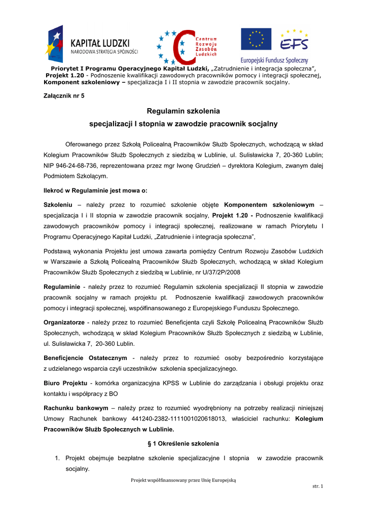 Priorytet I Programu Operacyjnego Kapitał Ludzki, „Zatrudnienie i integracja społeczna”, Projekt 1.20 - Podnoszenie kwalifikacji zawodowych pracowników pomocy i integracji społecznej, Komponent szkoleniowy – specjalizacja I i II stopnia w zawodzie pracownik socjalny. Załącznik nr 5 Regulamin szkolenia specjalizacji I stopnia w zawodzie pracownik socjalny Oferowanego przez Szkołą Policealną Pracowników SłuŜb Społecznych, wchodzącą w skład Kolegium Pracowników SłuŜb Społecznych z siedzibą w Lublinie, ul. Sulisławicka 7, 20-360 Lublin; NIP 946-24-68-736, reprezentowana przez mgr Iwonę Grudzień – dyrektora Kolegium, zwanym dalej Podmiotem Szkolącym. Ilekroć w Regulaminie jest mowa o: Szkoleniu – naleŜy przez to rozumieć szkolenie objęte Komponentem szkoleniowym – specjalizacja I i II stopnia w zawodzie pracownik socjalny, Projekt 1.20 - Podnoszenie kwalifikacji zawodowych pracowników pomocy i integracji społecznej, realizowane w ramach Priorytetu I Programu Operacyjnego Kapitał Ludzki, „Zatrudnienie i integracja społeczna”, Podstawą wykonania Projektu jest umowa zawarta pomiędzy Centrum Rozwoju Zasobów Ludzkich w Warszawie a Szkołą Policealną Pracowników SłuŜb Społecznych, wchodzącą w skład Kolegium Pracowników SłuŜb Społecznych z siedzibą w Lublinie, nr U/37/2P/2008 Regulaminie - naleŜy przez to rozumieć Regulamin szkolenia specjalizacji II stopnia w zawodzie pracownik socjalny w ramach projektu pt. Podnoszenie kwalifikacji zawodowych pracowników pomocy i integracji społecznej, współfinansowanego z Europejskiego Funduszu Społecznego. Organizatorze - naleŜy przez to rozumieć Beneficjenta czyli Szkołę Policealną Pracowników SłuŜb Społecznych, wchodzącą w skład Kolegium Pracowników SłuŜb Społecznych z siedzibą w Lublinie, ul. Sulisławicka 7, 20-360 Lublin. Beneficjencie Ostatecznym - naleŜy przez to rozumieć osoby bezpośrednio korzystające z udzielanego wsparcia czyli uczestników szkolenia specjalizacyjnego. Biuro Projektu - komórka organizacyjna KPSS w Lublinie do zarządzania i obsługi projektu oraz kontaktu i współpracy z BO Rachunku bankowym – naleŜy przez to rozumieć wyodrębniony na potrzeby realizacji niniejszej Umowy Rachunek bankowy 441240-2382-1111001020618013, właściciel rachunku: Kolegium Pracowników SłuŜb Społecznych w Lublinie. § 1 Określenie szkolenia 1. Projekt obejmuje bezpłatne szkolenie specjalizacyjne I stopnia w zawodzie pracownik socjalny. Projekt współfinansowany przez Unię Europejską str. 1 2. Projekt jest realizowany w trzech edycjach w okresie październik 2008 – wrzesień 2009 (I edycja) i styczeń (II edycja) kwiecień (III edycja). 2009 3. W kaŜdej edycji szkolenia weźmie udział 110 osób (2 grupy wykładowe, w tym 5 grup ćwiczeniowych po 22 osób). 4. Szkolenia odbywać się będą w formie zjazdów weekendowych (sobota – niedziela) po 8 - 9 godzin lekcyjnych kaŜdego dnia. Szczegółowy harmonogram szkolenia (terminy zjazdów) określony w załączniku Nr 1 do Regulaminu ustala Organizator i jest dostępny na stronie WWW.kpss.lublin.pl 5. KaŜda edycja szkolenia składa się z 244 godzin zajęć, w tym 130 godzin z modułu ogólnego (wspólny dla wszystkich grup), 110 godzin z modułu specjalistycznego, umoŜliwiających zdobycie zaświadczenia uprawniającego do przystąpienia do egzaminu przed Centralną Komisją Egzaminacyjną w Warszawie oraz 4 godzinnego szkolenia z BHP. 6. Ramowy program szkolenia (jednakowy w kaŜdej edycji) obejmuje: I. MODUŁ I Umiejętności interpersonalne w pracy socjalnej Liczba godzin 40 godzin II III a MODUŁ II Wybrane zagadnienia z prawa MODUŁ III a Doskonalenie metod i technik pracy socjalnej z osobą 40 godzin 40 godzin III b MODUŁ III b Doskonalenie metod i technik pracy socjalnej z rodziną i grupą 40 godzin III c „MODUŁ III c Doskonalenie metod i technik pracy socjalnej ze środowiskiem lokalnym MODUŁ IV Etyka pracy socjalnej MODUŁ V Metody i techniki tworzenia i oceny projektów socjalnych MODUŁ VI Metody oraz techniki oceny w pracy socjalnej 20 godzin Lp. IV V VI Moduł ogólny Szkolenie BHP 15 godzin 20 godzin 10 godzin Razem liczba godzin szkolenia ogólnego: 225 godzin 4 godziny Razem liczba godzin szkolenia: 229 godziny 7. Szczegółowy rozkład czasowy dnia szkoleniowego będzie dostępny na WWW.kpss.lublin.pl § 2 Zgłoszenie na szkolenie 1. W Szkoleniu mogą brać udział pracownicy socjalni, starsi pracownicy socjalni, specjaliści pracy socjalnej i starsi specjaliści pracy socjalnej zatrudnieni na umowę o pracę w jednostkach organizacyjnych pomocy społecznej, a takŜe w podmiotach i instytucjach, o których mowa w art. 120 ustawy z dnia 12 marca 2004 r. o pomocy społecznej (Dz. U. z 2008 r nr 115 poz. 728) posiadający co najmniej trzyletni staŜ pracy, wykonujący zadania określone w ustawie oraz dyplom w zawodzie pracownik socjalny lub studia licencjackie/ wyŜsze magisterskie na kierunkach pedagogika, politologia, psychologia, socjologia lub nauki o rodzinie; 2. Kwalifikacja na szkolenie następuje na podstawie dokumentu karta zgłoszenia na szkolenie, zwanym dalej Zgłoszeniem wraz z wypełnionymi załącznikami. Projekt współfinansowany przez Unię Europejską str. 2 3. Listy zgłoszonych kandydatów na specjalizację są przekazywane przez Kolegium Pracowników SłuŜb Społecznych do Centrum Rozwoju Zasobów Ludzkich, które ustala ostateczną listę osób zakwalifikowanych do projektu przyjmując za podstawowe kryterium regionalizację. 4. Niniejszy Regulamin i załączniki do niego stanowią integralną część zgłoszenia na specjalizację. 5. Zgłoszenie w formie papierowej lub elektronicznej, po starannym, kompletnym wypełnieniu i podpisaniu naleŜy przesłać faxem lub pocztą elektroniczną (odpowiednio do rodzaju zgłoszenia) do Biura Projektu Telefon (081) 748-18-81; fax (081) 748-33-32; adres mailowy [email protected]; [email protected]; do dnia 23 marca 