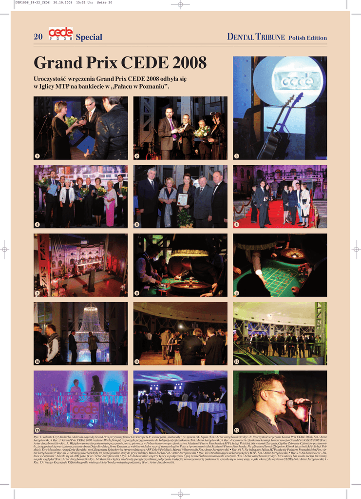 DTP1008_19-22_CEDE 20 20.10.2008 15:21 Uhr Seite 20 DENTAL TRIBUNE Special Polish Edition Grand Prix CEDE 2008 Uroczystość wręczenia Grand Prix CEDE 2008 odbyła się w Iglicy MTP na bankiecie w „Pałacu w Poznaniu”. 1 2 3 4 5 6 7 8 9 10 11 12 13 14 15 Ryc. 1: Jolanta Czyż-Kukurba odebrała nagrodę Grand Prix przyznaną firmie GC Europe N.V. w kategorii „materiały” za system GC Equia (Fot.: Artur Jarzębowski) • Ryc. 2: Uroczystość wręczenia Grand Prix CEDE 2008 (Fot.: Artur Jarzębowski) • Ryc. 3: Grand Prix CEDE 2008 rozdane. Wiele firm już rozpoczęło przygotowania do kolejnej edycji konkursu (Fot.: Artur Jarzębowski) • Ryc. 4: Laureaci i członkowie komisji konkursowej o Grand Prix CEDE 2008 (Fot.: Artur Jarzębowski) • Ryc. 5: Wyjątkowym wydarzeniem było przyznanie po raz pierwszy w Polsce honorowego członkostwa Akademii Pierre Faucharda (APF) Sekcji Polskiej. Na wniosek Zarządu, Ogólne Zebranie Członków postanowiło, że tą godnością wyróżniona zostanie Anna Deja-Berduła z firmy Exactus za wybitny wkład w rozwój stomatologii w Polsce i promowanie idei Akademii Pierre Faucharda. Na zdjęciu od lewej: Zbigniew Klimek (skarbnik APF Sekcji Polskiej), Ewa Mastalerz, Anna Deja-Berduła, prof. Eugeniusz Spiechowicz (przewodniczący APF Sekcji Polskiej), Marek Wiktorowski (Fot.: Artur Jarzębowski) • Ryc. 6 i 7: Na jedną noc Iglica MTP stała się Pałacem Poznańskich (Fot.: Artur Jarzębowski) • Ryc. 8 i 9: Atrakcją wieczoru były też profesjonalne stoły do gry w ruletkę i Black Jacka (Fot.: Artur Jarzębowski) • Ryc. 10: Oszałamiająca dekoracja Iglicy MTP (Fot.: Artur Jarzębowski) • Ryc. 11: Na bankiecie w „Pałacu w Poznaniu” bawiło się ok. 800 gości (Fot.: Artur Jarzębowski) • Ryc. 12: Industrialne wnętrze Iglicy w połączeniu z grą świateł robiło niesamowite wrażenie (Fot.: Artur Jarzębowski) • Ryc. 13: Lodowy bar wcale nie był tak zimny, na jaki wyglądał (Fot.: Artur Jarzębowski) • Ryc. 14: Bankiet w Iglicy miał swój specyficzny klimat, połączenie tradycji z nowoczesnością znakomicie wpisało się w nowy etap, w jaki wkroczyła wystawa CEDE (Fot.: Artur Jarzębowski) • Ryc. 15: Występ Krzysztofa Kiljańskiego dla wielu gości był bardzo miłą niespodzianką (Fot.: Artur Jarzębowski).