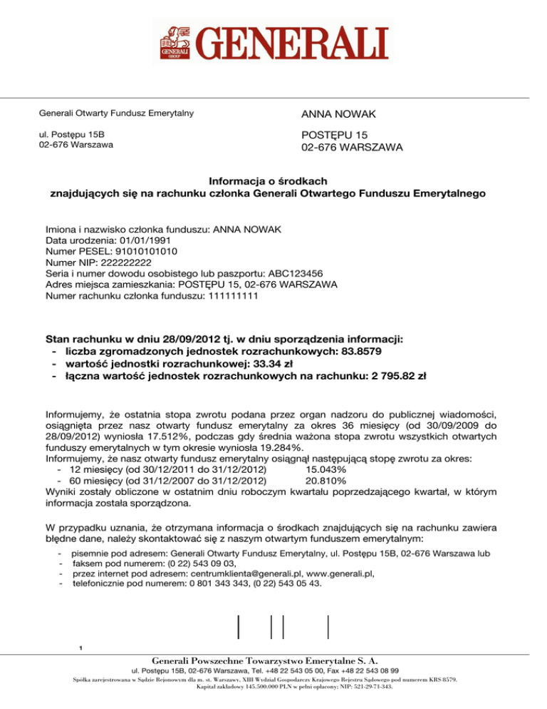 Generali Otwarty Fundusz Emerytalny ANNA NOWAK ul. Postępu 15B 02-676 Warszawa POSTĘPU 15 02-676 WARSZAWA Informacja o środkach znajdujących się na rachunku członka Generali Otwartego Funduszu Emerytalnego Imiona i nazwisko członka funduszu: ANNA NOWAK Data urodzenia: 01/01/1991 Numer PESEL: 91010101010 Numer NIP: 222222222 Seria i numer dowodu osobistego lub paszportu: ABC123456 Adres miejsca zamieszkania: POSTĘPU 15, 02-676 WARSZAWA Numer rachunku członka funduszu: 111111111 Stan rachunku w dniu 28/09/2012 tj. w dniu sporządzenia informacji: - liczba zgromadzonych jednostek rozrachunkowych: 83.8579 - wartość jednostki rozrachunkowej: 33.34 zł - łączna wartość jednostek rozrachunkowych na rachunku: 2 795.82 zł Informujemy, że ostatnia stopa zwrotu podana przez organ nadzoru do publicznej wiadomości, osiągnięta przez nasz otwarty fundusz emerytalny za okres 36 miesięcy (od 30/09/2009 do 28/09/2012) wyniosła 17.512%, podczas gdy średnia ważona stopa zwrotu wszystkich otwartych funduszy emerytalnych w tym okresie wyniosła 19.284%. Informujemy, że nasz otwarty fundusz emerytalny osiągnął następującą stopę zwrotu za okres: - 12 miesięcy (od 30/12/2011 do 31/12/2012) 15.043% - 60 miesięcy (od 31/12/2007 do 31/12/2012) 20.810% Wyniki zostały obliczone w ostatnim dniu roboczym kwartału poprzedzającego kwartał, w którym informacja została sporządzona. W przypadku uznania, że otrzymana informacja o środkach znajdujących się na rachunku zawiera błędne dane, należy skontaktować się z naszym otwartym funduszem emerytalnym: - pisemnie pod adresem: Generali Otwarty Fundusz Emerytalny, ul. Postępu 15B, 02-676 Warszawa lub - faksem pod numerem: (0 22) 543 09 03, - przez internet pod adresem: [email protected], www.generali.pl, - telefonicznie pod numerem: 0 801 343 343, (0 22) 543 05 43. 1 Generali Powszechne Towarzystwo Emerytalne S. A. ul. Postępu 15B, 02-676 Warszawa, Tel. +48 22 543 05 00, Fax +48 22 543 08 99 Spółka zarejestrowana w Sądzie Rejonowym dla m. st. Warszawy, XIII Wydział Gospodarczy Krajowego Rejestru Sądowego pod numerem KRS 8579. Kapitał zakładowy 145.500.000 PLN w pełni opłacony; NIP: 521-29-71-343. Data rozliczenia transakcji realizowanej na rachunku Kwota brutto, którą ZUS przekazał na rachunek OFE lub kwota wpłaty / wypłaty transferowej Kwota netto, kwota zainwestowana po odliczeniu opłaty pobieranej na rzecz OFE Poniższa tabela zawiera wykaz operacji na rachunku, które odbyły się pomiędzy dniem sporządzenia poprzedniej informacji a dniem sporządzenia informacji obecnej: Lp Data operacji poz. 1 1 Opis operacji Kwota operacji Odsetki od ZUS (w zł) z tytułu nieprzekazania w terminie składki do OFE (w zł) Kwota opłaty potrąconej od środków przekazanych przez ZUS (w zł) poz. 2 poz. 3 poz. 5 poz. 4 Kwota inwestowanych środków (w zł) Wartość jednostki rozrachunkowej ustalona dla operacji (w zł) poz. 6 (poz. 3 + poz. 4 poz. 7 - poz. 5) Liczba nabytych lub umorzonych jednostek rozrachunkowych poz. 8 (poz. 6 / poz. 7) Liczba jednostek rozrachunkowych na koniec poprzedniego okresu sprawozdawczego 57.5752 2 28/10/2011 Składka za 01/09/2011 do 30/09/2011 79.78 0.00 2.79 76.99 31.49 2.4449 3 25/11/2011 Składka za 01/10/2011 do 31/10/2011 15.04 0.00 0.53 14.51 30.39 0.4775 4 02/12/2011 Składka za 01/10/2011 do 31/10/2011 63.16 0.00 2.21 60.95 30.86 1.9750 5 30/12/2011 Składka za 01/11/2011 do 30/11/2011 14.98 0.00 0.52 14.46 30.57 0.4730 6 09/01/2012 Składka za 01/11/2011 do 30/11/2011 62.59 0.00 2.19 60.40 30.56 1.9764 7 27/01/2012 Składka za 01/12/2011 do 31/12/2011 23.35 0.00 0.82 22.53 31.51 0.7150 8 03/02/2012 Składka za 01/12/2011 do 31/12/2011 58.09 0.00 2.03 56.06 31.89 1.7579 9 24/02/2012 Składka za 01/01/2012 do 31/01/2012 11.64 0.00 0.41 11.23 32.00 0.3509 10 09/03/2012 Składka za 01/01/2012 do 31/01/2012 67.50 0.00 2.36 65.14 32.05 2.0324 11 30/03/2012 Składka za 01/02/2012 do 29/02/2012 77.96 0.00 2.73 75.23 32.21 2.3356 12 27/04/2012 Składka za 01/03/2012 do 31/03/2012 79.04 0.00 2.77 76.27 31.80 2.3984 13 25/05/2012 Składka za 01/04/2012 do 30/04/2012 11.53 0.00 0.40 11.13 31.00 0.3590 14 01/06/2012 Składka za 01/04/2012 do 30/04/2012 67.26 0.00 2.35 64.91 31.25 2.0771 15 29/06/2012 Składka za 01/05/2012 do 31/05/2012 12.87 0.00 0.45 12.42 31.98 0.3884 16 06/07/2012 Składka za 01/05/2012 do 31/05/2012 66.71 0.00 2.33 64.38 32.23 1.9975 17 27/07/2012 Składka za 01/06/2012 do 30/06/2012 12.29 0.00 0.43 11.86 32.09 0.3696 18 03/08/2012 Składka za 01/06/2012 do 30/06/2012 62.79 0.00 2.20 60.59 32.23 1.8799 19 24/08/2012 Składka za 01/07/2012 do 31/07/2012 13.35 0.00 0.47 12.88 32.75 0.3933 20 31/08/2012 Składka za 01/07/2012 do 31/07/2012 63.64 0.00 2.23 61.41 32.65 1.8809 863.57 0.00 30.22 833.35 21 Razem w okresie sprawozdawczym: 22 Łączna liczba jednostek rozrachunkowych zgromadzona na rachunku członkowskim Suma wpłat/ wypłat za okres, za który zostało sporządzone zestawienie 26.2827 83.8579 Wartość jednostki rozrachunkowej dla danej transakcji Suma opłat pobranych od wykazanych w zestawieniu transakcji Suma odsetek za okres, w którym zostało sporządzone zestawienie x Suma zainwestowanych kwot wykazanych w zestawieniu po odliczeniu opłat na rzecz OFE 2 Generali Powszechne Towarzystwo Emerytalne S. A. ul. Postępu 15B, 02-676 Warszawa, Tel. +48 22 543 05 00, Fax +48 22 543 08 99 Spółka zarejestrowana w Sądzie Rejonowym dla m. st. Warszawy, XIII Wydział Gospodarczy Krajowego Rejestru Sądowego pod numerem KRS 8579. Kapitał zakładowy 145.500.000 PLN w pełni opłacony; NIP: 521-29-71-343.