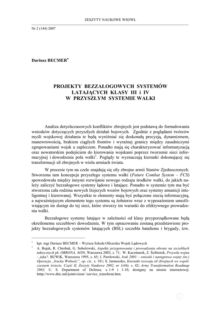 ZESZYTY NAUKOWE WSOWL Nr 2 (144) 2007 Dariusz BECMER PROJEKTY BEZZAŁOGOWYCH SYSTEMÓW LATAJĄCYCH KLASY III i IV W PRZYSZŁYM SYSTEMIE WALKI Analiza dotychczasowych konfliktów zbrojnych jest podstawą do formułowania wniosków dotyczących przyszłych działań bojowych. Zgodnie z poglądami twórców myśli wojskowej działania te będą wyróżniać się doskonałą precyzją, dynamizmem, manewrowością, brakiem ciągłych frontów i wyraźnej granicy między zasadniczymi zgrupowaniami wojsk a zapleczem. Ponadto mają się charakteryzować informatyzacją oraz nowatorskim podejściem do kierowania wojskami poprzez tworzenie sieci informacyjnej i dowodzenia pola walki1. Poglądy te wyznaczają kierunki dokonującej się transformacji sił zbrojnych w wielu armiach świata. W procesie tym na czele znajdują się siły zbrojne armii Stanów Zjednoczonych. Stworzona tam koncepcja przyszłego systemu walki (Future Combat System – FCS) spowodowała między innymi rozwijanie nowego rodzaju środków walki, do jakich należy zaliczyć bezzałogowe systemy lądowe i latające. Ponadto w systemie tym ma być stworzona cała rodzina nowych lżejszych wozów bojowych oraz systemy amunicji inteligentnej i kierowanej. Wszystkie te elementy mają być połączone siecią informacyjną, a najważniejszym elementem tego systemu są żołnierze wraz z wyposażeniem umożliwiającym im dostęp do tej sieci, które stworzy im warunki do efektywnego prowadzenia walki. Bezzałogowe systemy latające w zależności od klasy przyporządkowane będą określonemu szczeblowi dowodzenia. W tym opracowaniu zostaną przedstawione projekty bezzałogowych systemów latających (BSL) szczebla batalionu i brygady, tzw. - - - - - 1 kpt. mgr Dariusz BECMER – Wyższa Szkoła Oficerska Wojsk Lądowych A. Bujak, R. Chrobak, G. Sobolewski, Aspekty przygotowania i prowadzenia obrony na szczeblach taktycznych pk. OBRONA, AON, Warszawa 2003, s. 71; W. Kaczmarek, Z. Ścibiorek, Przyszła wojna – jaka?, BUWiK, Warszawa 1995, s. 65; J. Pawłowski, Irak 2003 – wnioski i następstwa wojny (in:) Operacja „Iracka Wolność”, op. cit., s. 181; S. Jarmoszko, Kierunki rozwoju sił zbrojnych we współczesnym świecie. Część II, Zeszyty Naukowe 2002, nr 1(46), s. 42; Army Transformation Roadmap 2003, U. S. Department of Defense, s. 1-9 i 1-10, dostępny na stronie internetowej: htttp://www.dtic.mil/jointvision/ /service_transform.htm. Dariusz BECMER BSL klasy III i IV. Elementy, z jakich ma się składać FCS oraz projekty bezzałogowych systemów latających szczebla plutonu i kompanii (kasy I i II) zostały przedstawione w opracowaniu pt.: Projekty bezzałogowych systemów latających klasy I i II w przyszłym systemie walki2. BSL klasy III (Class III UAV) ma być wielofunkcyjnym systemem ważącym 136 – 227 kg, którego zasięg i zakres możliwości pozwoli wesprzeć w zakresie rozpoznania, śledzenia oraz poszukiwania celów batalion działający w rejonie odpowiedzialności brygady lub brygadowej grupy bojowej (Brigade Combat Team - BCT). Od tego systemu wymaga się maksymalnej długotrwałości lotu i ładowności (około 98 kg) przy zminimalizowaniu kosztów związanych z ich utrzymaniem, zużyciem paliwa i wymaganiami transportowymi. Oprócz takich samych możliwości, jak BSL klasy I i II, dodatkowo ma zapewnić utrzymanie łączności, wykrywanie min, wykrywanie skażeń bronią masowego rażenia oraz wykonywanie pomiarów meteorologicznych. Możliwości te mają umożliwić przyszłemu batalionowi wykonywanie precyzyjnego ognia pośredniego (poza zasięgiem wzroku) w rejonie zainteresowania Brygadowej Grupy Bojowej. Ponadto statek powietrzny ma posiadać zdolność startowania i lądowania bez specjalnie przygotowanego pasa startowego lub lądowiska, promień działania 40 km oraz długotrwałość lotu 6 godzin. W tej grupie o możliwość wyposażenia sił zbrojnych ubiegają się trzy grupy przedsiębiorstw. Są to: Teledyne Brown Engineering Inc. (TBE) z systemem Prospector UAV bazującym na używanym przez armię niemiecką Rheinmetall KZO; AAI Corp. z bezzałogowym systemem Shadow III, zmodernizowaną wersją rodziny systemów latających Shadow, aktualnie używanych przez US Army; Piasecki Aircraft Corp. z systemem Air Guard, którego autożyro- bezzałogowy statek latający jest połączeniem samolotu i śmigłowca, zwanym „żyroplanem” (ang. gyroplane) lub „żyrokopterem” (ang. gyrokopter). - - Związany z pierwszym z wymienionych bezzałogowy system latający KZO (Kleinfluggerät Zielortung) zaprojektowany przez Rheinmetall Defence Electronics (RDE) został dostarczony siłom zbrojnym RFN w 1998 roku w celu przeprowadzenia testów, podczas których został oceniony pozytywnie. W 2005 roku został przekazany Bundeswehrze kolejny system obejmujący 2 stacje naziemne i 10 statków latających (2 plutony każdy, z jedną stacją i pięcioma statkami). Docelowo do końca 2007 roku ma zostać dostarczonych pięć systemów (razem 60 statków). - - 2 - 24 D. Becmer, Projekty bezzałogowych systemów latających klasy I i II w przyszłym systemie walki, Zeszyty Naukowe WSOWL nr 1/2007, s. 33. PROJEKTY BEZZAŁOGOWYCH SYSTEMÓW LATAJĄCYCH KLASY III i IV… Rys. 1. Po lewej: start KZO z użyciem przyspieszacza rakietowego, po prawej: Rheinmetall KZO/Prospector AI Źródło: http://www.army-technology.com. TBE na bazie KZO zamierza zbudować większą wersję Prospectora. Wśród wprowadzonych w nim zmian wymienia się zastosowanie silnika wysokoprężnego dostosowanego do paliwa JP-8, zwiększenie długotrwałości lotu oraz wprowadzenia nowych czujników. Jednak najbardziej istotnym wymogiem jest to, aby system przesyłania danych był kompatybilny z wprowadzonym jako standard w US Army systemem TCDL (Tactical Common Data Link). Opracowany dla KZO jest zabezpieczony przed zagłuszaniem poprzez jednoczesne używanie zarówno trybu DSSS (direct-sequence spread-spectrum), jak również FHSS (simultan