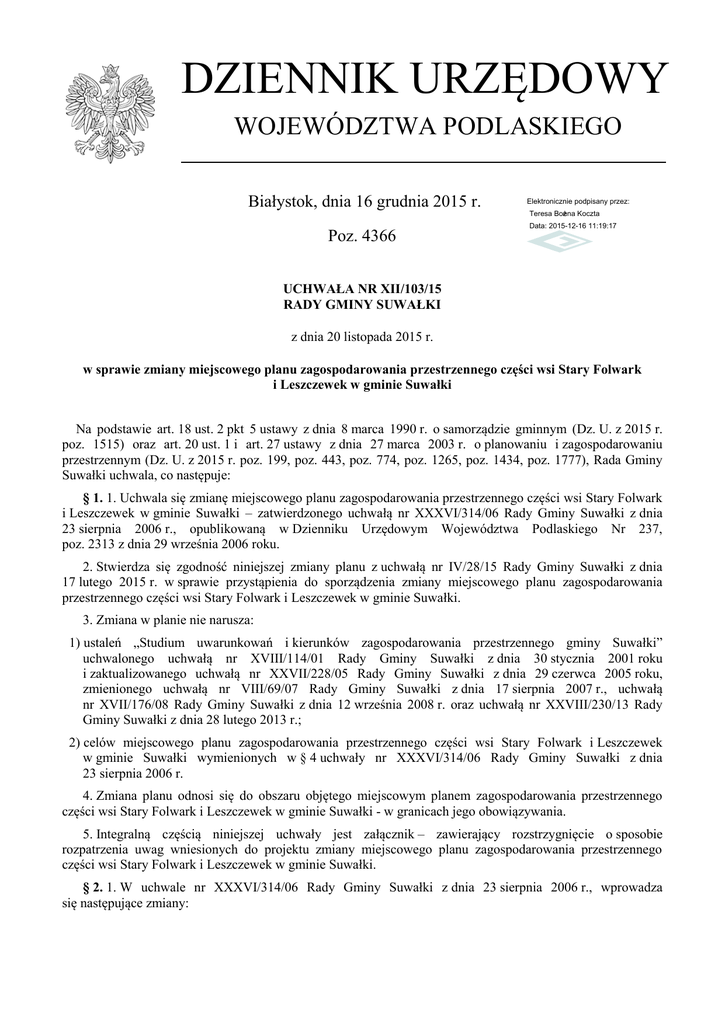 DZIENNIK URZĘDOWY WOJEWÓDZTWA PODLASKIEGO Białystok, dnia 16 grudnia 2015 r. Elektronicznie podpisany przez: Teresa Bożena Koczta Poz. 4366 Data: 2015-12-16 11:19:17 UCHWAŁA NR XII/103/15 RADY GMINY SUWAŁKI z dnia 20 listopada 2015 r. w sprawie zmiany miejscowego planu zagospodarowania przestrzennego części wsi Stary Folwark i Leszczewek w gminie Suwałki Na podstawie art. 18 ust. 2 pkt 5 ustawy z dnia 8 marca 1990 r. o samorządzie gminnym (Dz. U. z 2015 r. poz. 1515) oraz art. 20 ust. 1 i art. 27 ustawy z dnia 27 marca 2003 r. o planowaniu i zagospodarowaniu przestrzennym (Dz. U. z 2015 r. poz. 199, poz. 443, poz. 774, poz. 1265, poz. 1434, poz. 1777), Rada Gminy Suwałki uchwala, co następuje: § 1. 1. Uchwala się zmianę miejscowego planu zagospodarowania przestrzennego części wsi Stary Folwark i Leszczewek w gminie Suwałki – zatwierdzonego uchwałą nr XXXVI/314/06 Rady Gminy Suwałki z dnia 23 sierpnia 2006 r., opublikowaną w Dzienniku Urzędowym Województwa Podlaskiego Nr 237, poz. 2313 z dnia 29 września 2006 roku. 2. Stwierdza się zgodność niniejszej zmiany planu z uchwałą nr IV/28/15 Rady Gminy Suwałki z dnia 17 lutego 2015 r. w sprawie przystąpienia do sporządzenia zmiany miejscowego planu zagospodarowania przestrzennego części wsi Stary Folwark i Leszczewek w gminie Suwałki. 3. Zmiana w planie nie narusza: 1) ustaleń „Studium uwarunkowań i kierunków zagospodarowania przestrzennego gminy Suwałki” uchwalonego uchwałą nr XVIII/114/01 Rady Gminy Suwałki z dnia 30 stycznia 2001 roku i zaktualizowanego uchwałą nr XXVII/228/05 Rady Gminy Suwałki z dnia 29 czerwca 2005 roku, zmienionego uchwałą nr VIII/69/07 Rady Gminy Suwałki z dnia 17 sierpnia 2007 r., uchwałą nr XVII/176/08 Rady Gminy Suwałki z dnia 12 września 2008 r. oraz uchwałą nr XXVIII/230/13 Rady Gminy Suwałki z dnia 28 lutego 2013 r.; 2) celów miejscowego planu zagospodarowania przestrzennego części wsi Stary Folwark i Leszczewek w gminie Suwałki wymienionych w § 4 uchwały nr XXXVI/314/06 Rady Gminy Suwałki z dnia 23 sierpnia 2006 r. 4. Zmiana planu odnosi się do obszaru objętego miejscowym planem zagospodarowania przestrzennego części wsi Stary Folwark i Leszczewek w gminie Suwałki - w granicach jego obowiązywania. 5. Integralną częścią niniejszej uchwały jest załącznik – zawierający rozstrzygnięcie o sposobie rozpatrzenia uwag wniesionych do projektu zmiany miejscowego planu zagospodarowania przestrzennego części wsi Stary Folwark i Leszczewek w gminie Suwałki. § 2. 1. W uchwale nr XXXVI/314/06 Rady Gminy Suwałki z dnia 23 sierpnia 2006 r., wprowadza się następujące zmiany: Dziennik Urzędowy Województwa Podlaskiego –2– Poz. 4366 1) § 9 ust. 1 uchwały otrzymuje brzmienie: „Przy wznoszeniu nowych obiektów budowlanych należy stosować tradycyjne formy architektoniczne charakterystyczne dla tego obszaru, przy zastosowaniu tradycyjnych materiałów wykończeniowych, jak tynki gładkie malowane w jasnych barwach, szalowanie drewniane, malowane na kolory brązowe lub zielenie oraz okładziny ceramiczne (nie dotyczy obiektów infrastruktury technicznej). Na terenie oznaczonym symbolem 28UO dopuszcza się zastosowanie w nowych budynkach lub ich częściach odmiennych form architektonicznych dostosowanych do wymogów funkcjonalnych;”; 2) w § 9 po ust. 5 dodaje się ust. 6 w brzmieniu: „6. Ustalenia zawarte w § 9 ust. 2 pkt 3 i pkt 8 i ust. 3 nie dotyczą terenu oznaczonego symbolem przeznaczenie 28UO, gdzie ustala się możliwość zastosowania na nowych częściach budynków i nowych budynkach dachów o kształtach indywidualnych np. łukowych, płaskich itp.”; 3) w § 16 ust. 1 skreśla się symbol 34UH/UG w związku z tym jego treść przyjmuje brzmienie: „Na obszarze objętym planem projektuje się przestrzenie publiczne: drogi, ulice i na terenie oznaczonym symbolem 47KP w miejscu węzłowym dla szlaków pieszych i rowerowych oraz jako niewielkie wnętrza urbanistyczne w miejscu parkingów przy projektowanych i istniejących obiektach usługowych.”; 4) w § 16 po ust. 3 dodaje się ust. 4 w brzmieniu: „W ciągach dróg powiatowych na terenach oznaczonych symbolami 51KZ i 52KZ należy zrealizować trasy rowerowe, które będą elementami: niebieskiego szlaku rowerowego Dowspuda – Stary Folwark, „Podlaskiego Szlaku Bocianiego” (czerwonego), transgranicznego szlaku rowerowego R-11 oraz jako odgałęzienia ścieżki rowerowej „rowerowy Wschodni Szlak Green Velo”, prowadzącej wzdłuż drogi wojewódzkiej nr 653 Suwałki – Sejny”; 5) w § 21 ust. 7 skreśla się pkt 6; 6) w § 28 ust. 27 pkt 2 skreśla się lit. e. 2. Nie wprowadza się zmian na rysunku planu. § 3. Wykonanie uchwały powierza się Wójtowi Gminy Suwałki. § 4. Uchwała wchodzi w życie po upływie 14 dni od daty ogłoszenia w Dzienniku Urzędowym Województwa Podlaskiego. Przewodniczący Rady Marek Jeromin Dziennik Urzędowy Województwa Podlaskiego –3– Poz. 4366 Załącznik do uchwały nr XII/103/15 Rady Gminy Suwałki z dnia 20 listopada 2015 r. Sposób rozpatrzenia nieuwzględnionych uwag wniesionych do projektu zmiany miejscowego planu zagospodarowania przestrzennego części wsi Stary Folwark i Leszczewek w gminie Suwałki Na podstawie art. 20 ust. 1 ustawy z dnia 27 marca 2003 r. o planowaniu i zagospodarowaniu przestrzennym (Dz. U. z 2015 r. poz. 199, poz. 443, poz. 774, poz. 1265, poz. 1434, poz. 1777) Rada Gminy Suwałki stwierdza, że w okresie wyłożenia do publicznego wglądu w dniach od 02 października 2015 do 03 listopada 2015 roku (włącznie) oraz w terminie 14 dni po wyłożeniu tj. do dnia 18 listopada 2015 roku włącznie, nie wniesiono uwag do projektu zmiany miejscowego planu zagospodarowania przestrzennego części wsi Stary Folwark i Leszczewek w gminie Suwałki. Dziennik Urzędowy Województwa Podlaskiego –4– Poz. 4366 UZASADNIENIE do uchwały w sprawie zmiany miejscowego planu zagospodarowania przestrzenn