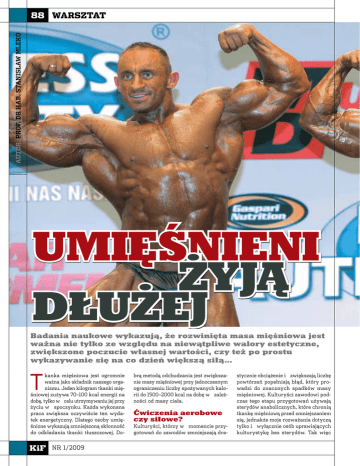 AUTOR: Prof. dr hab. Stanisław Mleko 88 warsztat Umięśnieni żyją dłużej Badania naukowe wykazują, że rozwinięta masa mięśniowa jest ważna nie tylko ze względu na niewątpliwe walory estetyczne, zwiększone poczucie własnej wartości, czy też po prostu wykazywanie się na co dzień większą siłą… T kanka mięśniowa jest ogromnie ważna jako składnik naszego organizmu. Jeden kilogram tkanki mięśniowej zużywa 70–100 kcal energii na dobę, tylko w celu utrzymywaniu jej przy życiu w spoczynku. Każda wykonana praca zwiększa oczywiście ten wydatek energetyczny. Dlatego osoby umięśnione wykazują zmniejszoną skłonność do odkładania tkanki tłuszczowej. Do- KiF nr 1 / 2009 brą metodą odchudzania jest zwiększanie masy mięśniowej przy jednoczesnym ograniczeniu liczby spożywanych kalorii do 1500–2000 kcal na dobę w zależności od masy ciała. Ćwiczenia aerobowe czy siłowe? Kulturyści, którzy w momencie przygotowań do zawodów zmniejszają dra- stycznie obciążenie i zwiększają liczbę powtórzeń popełniają błąd, który prowadzi do znacznych spadków masy mięśniowej. Kulturyści zawodowi podczas tego etapu przygotowań używają sterydów anabolicznych, które chronią tkankę mięśniową przed zmniejszaniem się, jednakże moje rozważania dotyczą tylko i wyłącznie osób uprawiających kulturystykę bez sterydów. Tak więc warsztat 89 tajemnica ładnej sylwetki tkwi w odpowiednich ćwiczeniach z dużym obciążeniem oraz w diecie. Ćwiczenia aerobowe mają większe znaczenie w wypadku „kulturystyki sterydowej”. Taki kulturysta może pozwolić sobie na 2 godziny ćwiczeń aerobowych dziennie, zachowując przy tym siły na ćwiczenia anaerobowe oraz chroniąc masę mięśniową. W wypadku „naturalnych” kulturystów sytuacja nie jest taka prosta. Ćwiczenia aerobowe w okresie przygotowań będą pozbawiały organizm energii potrzebnej do ćwiczeń anaerobowych oraz powodowały spadek masy mięśniowej. Poza Osoby muskularne rzadziej chorują na raka. Nie dotyczy to jednak osób stosujących „koks” tym należy pamiętać, że 45 minut szybkiego marszu na bieżni to równowartość spalonej energii równej dwom kromkom chleba posmarowanym cienko masłem z cienkimi plasterkami szynki. Łatwiej jest zatem stosować dietę, niż stosować ćwiczenia aerobowe. Duże mięśnie chronią przed rakiem Przede wszystkim należy pamiętać, że duża otyłość to całe miesiące spalania tłuszczu, a nie tygodnie. Należy to ro- bić powoli i systematycznie. Ostatnie badania przeprowadzone na Uniwersytecie Perdue wykazały, że nawet osoby po 60. roku życia mogą równocześnie zwiększać masę mięśniową i zmniejszać masę tłuszczową bez specjalnej diety i bez udziału ćwiczeń aerobowych, tylko przez wykonywanie odpowiednich ćwiczeń na budowę masy mięśniowej. Duża masa mięśniowa wpływa pozytywnie również na inne aspekty funkcjonowania naszego organizmu. We Francji przeprowadzono długoterminowe badania polegające na badaniu dużej grupy ludzi (7608 mężczyzn) przez 15 lat. Badano wpływ składu ciała tych osób na ich śmiertelność z powodu zawału serca oraz raka. Wykazano wysoką pozytywną zależność między zawartością tkanki tłuszczowej a śmiertelnością wywołaną przez zawał serca oraz wysoką negatywną zależność między zawartością tkanki mięśniowej a śmiertelnością wywołaną przez raka różnych postaci. Tak więc bezsprzecznie udowodniono, że osoby mogące pochwalić się większą ilością tkanki mięśniowej rzadziej umierają na raka. Badania te dotyczą populacji osób, wśród których nie było kulturystów uprawiających ten sport przy użyciu sterydów anabolicznych. W wypadku takich osób śmiertelność jest bowiem wyższa niż średnia z populacji, zarówno biorąc pod uwagę zawał serca, jak i raka, zwłaszcza raka wątroby i nerek. Inne najnowsze badania opublikowane przez międzynarodowy zespół naukowców w październiku 2008 roku wykazały, że zarówno ćwiczenia aerobowe, jak i „siłowe” powodują zmniejszenia ryzyka wystąpienia raka. Udowodniono, że większe znaczenie mają w tym względzie ćwiczenia anaerobowe, czyli „siłowe”, niż ćwiczenia aerobowe. Nie jest więc prawdą, że – jak niektórzy sądzą – ćwiczenia „siłowe” dobre są dla tych, którzy lubią takie ćwiczenia, a dla innych równie dobre są ćwiczenia aerobowe. Badania wykazują, że nie da się efektu zdrowotnego ćwiczeń „siłowych” zastąpić efektem ćwiczeń aerobowych. Badania dotyczyły tylko populacji mężczyzn. Autorzy zapowiadają, że wkrótce zaprezentują podobne wyniki w odniesieniu do kobiet. Uścisk dłoni jako wyznacznik W Wielkiej Brytanii przeprowadzono trwające 24 lata badania na dużej populacji kobiet i mężczyzn w celu wyznaczenia zależności między siłą uścisku nr 1 / 2009 KiF 90 warsztat ganizmie, a maleje wraz ze wzrostem masy mięśni. Pewne problemy nastręczają również badania nad zależnością między masą mięśniową a rakiem. Pomiary powinny dotyczyć okresów przed zachorowaniem, gdyż sam rak powoduje spadek masy mięśniowej. Powodują go również inne związane z tym doświadczenia, jak chemioterapia oraz czynnik stresowy, który powoduje wydzielanie się kortyzolu wprowadzającego organizm w stan kataboliczny przez zmniejszanie przyswajania aminokwasów przez mięśnie i spowolnienie syntezy białka. Wielkościami używanymi w badaniach nad śmiertelnością ludzi są również: siła mięśniowa (muscle strength) oraz moc mięśni (muscle power). Siła mięśniowa to siła skurczu mięśnia mierzona w niutonach. Moc mięśni to praca mięśni, czyli iloczyn wartości siły i długości drogi pomnożony przez cosinus kąta między wektorem siły a wektorem przesunięcia, podzielony przez czas tej pracy. Moc mięśni można również przedstawić jako iloczyn siły i prędkości ruchu wywołanego przez mięsień.