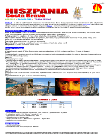 B I UR O P ODR ÓŻ Y CALELLA • BARCELONA • TOSSA DE MAR CALELLA - to jedna z najsłynniejszych miejscowości na wybrzeżu Costa Brava. Swoją popularność miasto zawdzięcza nie tylko zabytkowemu centrum, słonecznej plaży i szerokiej gamie oferowanych rozrywek, ale także atrakcyjnej lokalizacji – od stolicy Katalonii - Barcelony miejscowość dzieli odległość zaledwie 45 km. Istnieje również dogodne połączenie z Blanes – znanym kurortem ze słynnym ogrodem botanicznym. Złocista, długa i czysta plaża, wysadzana palmami, romantyczna promenada oraz liczne rozrywki są głównymi atutami miejscowości. Zakwaterowanie: Hotel OLIMPIC *** Hotel H TOP OLIMPIC*** to duży, lubiany hotel z międzynarodową atmosferą. Położony ok. 400 m od szerokiej, piaszczystej plaży, blisko centrum miasta z licznymi sklepami, restauracjami, kawiarniami i dyskotekami. Pokoje: przyjemnie urządzone 2, 3 os. pokoje z łazienką, klimatyzacją, TV sat, balkonem. Wyposażenie hotelu: Recepcja z sejfami do wynajęcia, bar, restauracja, pomieszczenie klubowe z TV sat, sklep, windy, taras słoneczny z parasolami i leżakami, bar przy basenie. Rozrywka: w sezonie codziennie programy animacyjne Sport: kompleks basenowy +dodatkowy basen w innej części hotelu. Za opłatą bilard. Wyżywienie: 2 posiłki dziennie w formie bufetu. Program turystyczny Dzień 1 Wyjazd z Poznania o godz. 07:00 ul. Zwierzyniecka, parking przed wejściem do ZOO, przejazd przez Niemcy i Francję do Hiszpanii. Dzień 2 Przyjazd do Calelii w godzinach rannych (ok. 09.00), zakwaterowanie w hotelu, odpoczynek po podróży. Po południu, dla chętnych spacer nad morze, promenada. Obiadokolacja, nocleg Dzień 3-9 Realizacja programu pobytu : - całodzienna wycieczka autokarowa do Barcelony – stolicy Katalonii, jednego z najpiękniejszych miast Europy z zachwycającymi dziełami architekta Antonio Gaudiego - kościół Sagrada Familia (z zewnątrz), Plac Hiszpański, taras widokowy (wspaniały widok na port i miasto), Pomnik Kolumba, Port Vell z Maremagnum, La Rambla – najsłynniejsza ulica Barcelony, wieczorem pokaz magicznych fontann. Powrót do hotelu, nocleg - wycieczka do Tossa De Mar – przepiękne miasteczko znane przede wszystkim z bardzo dobrze zachowanej, jednej z najpiękniejszych w Hiszpanii, średniowiecznej starówki Vila Vella i fortyfikacji obronnych z XII w oraz do Lloret de Mar (znany kurort, w którym obejrzymy m.in.: ogrody św. Klotyldy, gotycki kościół z początku XV w. z kolorowymi dachówkami, ufortyfikowany, prywatny zamek z 1929 r, pomnik żony rybaka) - spacery po kurorcie Calella (wieże obronne, zabytkowe centrum, deptaki handlowe, promenada nadmorska i in.) Dzień 10 Po śniadaniu krótki spacer nad morze lub czas wolny. Wykwaterowanie z pokoi do godz. 12.00. Wyjazd w drogę powrotną do kraju ok. godz. 14.00 Dzień 11 Przyjazd do Poznania ok. godz. 15-16.00. Zakończenie imprezy TERMINY i CENY l.p. Turnusy Cena 1. 2. 16.05 - 26.05.2013 20.09 - 30.09.2013 1581 zł. 1581 zł. Cena zawiera: - przejazd komfortowym autokarem (klimatyzacja, barek, video, WC), podróż trwa ok. 25 godzin, 8 noclegów w hotelu H-TOP Olimpic***, pokoje 2, 3 os. wyżywienie w formie śniadań i obiadokolacji - bufet realizacja programu turystycznego ubezpieczenie KL 10.000 Eur, NNW 7.000 zł., bagaż 800 zł. – Signal Iduna opiekę licencjonowanego pilota Cena nie zawiera : - napoi do obiadokolacji - obowiązkowej opłaty klimatycznej w wys. 9 Eur/os. Biuro Podróży SKIPPER 61-806 Poznań, ul. Św. Marcin 29/4 tel. 61 661 33 34 tel./fax. 61 851 95 93