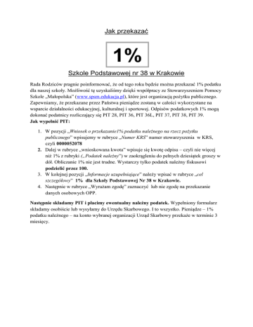 Jak przekazać 1% Szkole Podstawowej nr 38 w Krakowie Rada Rodziców pragnie poinformować, że od tego roku będzie można przekazać 1% podatku dla naszej szkoły. Możliwość tę uzyskaliśmy dzięki współpracy ze Stowarzyszeniem Pomocy Szkole „Małopolska” (www.spsm.edukacja.pl), które jest organizacją pożytku publicznego. Zapewniamy, że przekazane przez Państwa pieniądze zostaną w całości wykorzystane na wsparcie działalności edukacyjnej, kulturalnej i sportowej. Odpisów podatkowych 1% mogą dokonać podatnicy rozliczający się PIT 28, PIT 36, PIT 36L, PIT 37, PIT 38, PIT 39. Jak wypełnić PIT: 1. W pozycji „Wniosek o przekazanie1% podatku należnego na rzecz pożytku publicznego” wpisujemy w rubryce „Numer KRS” numer stowarzyszenia w KRS, czyli 0000052078 2. Dalej w rubryce „wnioskowana kwota” wpisuje się kwotę odpisu – czyli nie więcej niż 1% z rubryki („Podatek należny”) w zaokrągleniu do pełnych dziesiątek groszy w dół. Obliczanie 1% nie jest trudne. Wystarczy tylko podatek należny fiskusowi podzielić przez 100. 3. W kolejnej pozycji „Informacje uzupełniające” należy wpisać w rubryce „cel szczegółowy” 1% dla Szkoły Podstawowej Nr 38 w Krakowie. 4. Następnie w rubryce „Wyrażam zgodę” zaznaczyć lub nie zgodę na przekazanie danych osobowych OPP. Następnie składamy PIT i płacimy ewentualny należny podatek. Wypełniony formularz składamy osobiście lub wysyłamy do Urzędu Skarbowego. I to wszystko. Pieniądze – 1% podatku należnego – na konto wybranej organizacji Urząd Skarbowy przekaże w terminie 3 miesięcy.