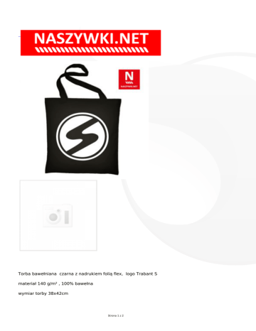 Torba bawełniana czarna z nadrukiem folią flex, logo Trabant S materiał 140 g/m² , 100% bawełna wymiar torby 38x42cm Strona 1 z 2 ucho - ok.70cm Strona 2 z 2