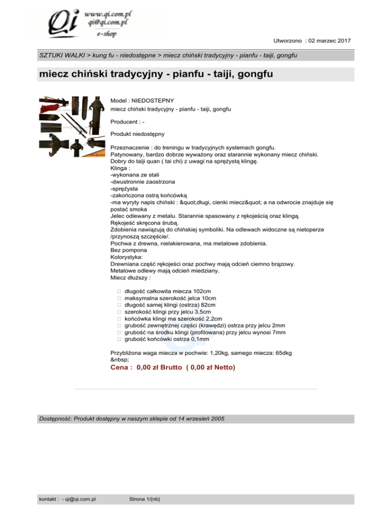 Utworzono : 02 marzec 2017 SZTUKI WALKI > kung fu - niedostępne > miecz chiński tradycyjny - pianfu - taiji, gongfu miecz chiński tradycyjny - pianfu - taiji, gongfu Model : NIEDOSTEPNY miecz chiński tradycyjny - pianfu - taiji, gongfu Producent : Produkt niedostępny Przeznaczenie : do treningu w tradycyjnych systemach gongfu. Patynowany, bardzo dobrze wyważony oraz starannie wykonany miecz chiński. Dobry do taiji quan ( tai chi) z uwagi na sprężystą klingę. Klinga : -wykonana ze stali -dwustronnie zaostrzona -sprężysta -zakończona ostrą końcówką -ma wyryty napis chiński : "długi, cienki miecz" a na odwrocie znajduje się postać smoka Jelec odlewany z metalu. Starannie spasowany z rękojeścią oraz klingą. Rękojeść skręcona śrubą. Zdobienia nawiązują do chińskiej symboliki. Na odlewach widoczne są nietoperze /przynoszą szczęście/. Pochwa z drewna, nielakierowana, ma metalowe zdobienia. Bez pompona Kolorystyka: Drewniana część rękojeści oraz pochwy mają odcień ciemno brązowy. Metalowe odlewy mają odcień miedziany. Miecz dłuższy : � długość całkowita miecza 102cm � maksymalna szerokość jelca 10cm � długość samej klingi (ostrza) 82cm � szerokość klingi przy jelcu 3,5cm � końcówka klingi ma szerokość 2,2cm � grubość zewnętrznej części (krawędzi) ostrza przy jelcu 2mm � grubość na środku klingi (profilowana) przy jelcu wynosi 7mm � grubość końcówki ostrza 0,1mm i Q Przybliżona waga miecza w pochwie: 1,20kg, samego miecza: 65dkg Cena : 0,00 zł Brutto ( 0,00 zł Netto) Dostępność: Produkt dostępny w naszym sklepie od 14 wrzesień 2005 kontakt : - [email protected] Strona 1/{nb}