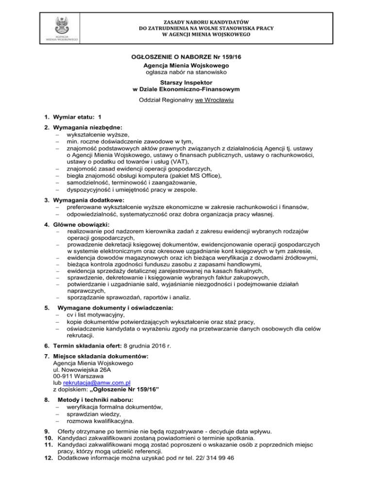 ZASADY NABORU KANDYDATÓW DO ZATRUDNIENIA NA WOLNE STANOWISKA PRACY W AGENCJI MIENIA WOJSKOWEGO OGŁOSZENIE O NABORZE Nr 159/16 Agencja Mienia Wojskowego ogłasza nabór na stanowisko Starszy Inspektor w Dziale Ekonomiczno-Finansowym Oddział Regionalny we Wrocławiu 1. Wymiar etatu: 1 2. Wymagania niezbędne: wykształcenie wyższe, min. roczne doświadczenie zawodowe w tym, znajomość podstawowych aktów prawnych związanych z działalnością Agencji tj. ustawy o Agencji Mienia Wojskowego, ustawy o finansach publicznych, ustawy o rachunkowości, ustawy o podatku od towarów i usług (VAT), znajomość zasad ewidencji operacji gospodarczych, biegła znajomość obsługi komputera (pakiet MS Office), samodzielność, terminowość i zaangażowanie, dyspozycyjność i umiejętność pracy w zespole. 3. Wymagania dodatkowe: preferowane wykształcenie wyższe ekonomiczne w zakresie rachunkowości i finansów, odpowiedzialność, systematyczność oraz dobra organizacja pracy własnej. 4. Główne obowiązki: realizowanie pod nadzorem kierownika zadań z zakresu ewidencji wybranych rodzajów operacji gospodarczych, prowadzenie dekretacji księgowej dokumentów, ewidencjonowanie operacji gospodarczych w systemie elektronicznym oraz okresowe uzgadnianie kont księgowych w tym zakresie, ewidencja dowodów magazynowych oraz ich bieżąca weryfikacja z dowodami źródłowymi, bieżąca kontrola zgodności funduszu zasobu z zapasami handlowymi, ewidencja sprzedaży detalicznej zarejestrowanej na kasach fiskalnych, sprawdzenie, dekretowanie i księgowanie wybranych faktur zakupowych, potwierdzanie i uzgadnianie sald, wyjaśnianie niezgodności i podejmowanie działań naprawczych, sporządzanie sprawozdań, raportów i analiz. 5. Wymagane dokumenty i oświadczenia: cv i list motywacyjny, kopie dokumentów potwierdzających wykształcenie oraz staż pracy, oświadczenie kandydata o wyrażeniu zgody na przetwarzanie danych osobowych dla celów rekrutacji. 6. Termin składania ofert: 8 grudnia 2016 r. 7. Miejsce składania dokumentów: Agencja Mienia Wojskowego ul. Nowowiejska 26A 00-911 Warszawa lub [email protected] z dopiskiem: „Ogłoszenie Nr 159/16” 8. Metody i techniki naboru: weryfikacja formalna dokumentów, sprawdzian wiedzy, rozmowa kwalifikacyjna. 9. Oferty otrzymane po terminie nie będą rozpatrywane - decyduje data wpływu. 10. Kandydaci zakwalifikowani zostaną powiadomieni o terminie spotkania. 11. Kandydaci zakwalifikowani mogą zostać poproszeni o wskazanie osób z poprzednich miejsc pracy, którzy mogą udzielić referencji. 12. Dodatkowe informacje można uzyskać pod nr tel. 22/ 314 99 46