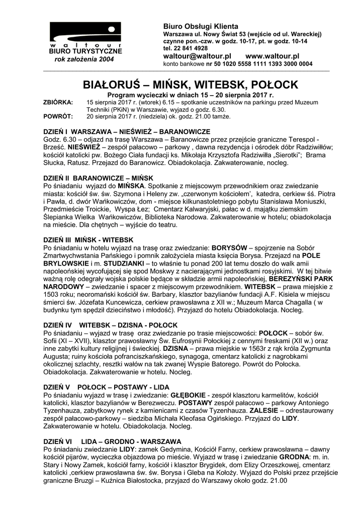 Biuro Obsługi Klienta BIURO TURYSTYCZNE rok założenia 2004 Warszawa ul. Nowy Świat 53 (wejście od ul. Wareckiej) czynne pon.-czw. w godz. 10-17, pt. w godz. 10-14 tel. 22 841 4928 [email protected] www.waltour.pl konto bankowe nr 50 1020 5558 1111 1393 3000 0004 ______________________________________________________________________________ BIAŁORUŚ – MIŃSK, WITEBSK, POŁOCK Program wycieczki w dniach 15 – 20 sierpnia 2017 r. ZBIÓRKA: POWRÓT: 15 sierpnia 2017 r. (wtorek) 6.15 – spotkanie uczestników na parkingu przed Muzeum Techniki (PKiN) w Warszawie, wyjazd o godz. 6.30. 20 sierpnia 2017 r. (niedziela) ok. godz. 21.00 tamże. DZIEŃ I WARSZAWA – NIEŚWIEŻ – BARANOWICZE Godz. 6.30 – odjazd na trasę Warszawa – Baranowicze przez przejście graniczne Terespol Brześć. NIEŚWIEŻ – zespół pałacowo – parkowy , dawna rezydencja i ośrodek dóbr Radziwiłłów; kościół katolicki pw. Bożego Ciała fundacji ks. Mikołaja Krzysztofa Radziwiłła „Sierotki”; Brama Słucka, Ratusz. Przejazd do Baranowicz. Obiadokolacja. Zakwaterowanie, nocleg. DZIEŃ II BARANOWICZE – MIŃSK Po śniadaniu wyjazd do MIŃSKA. Spotkanie z miejscowym przewodnikiem oraz zwiedzanie miasta: kościół św. św. Szymona i Heleny zw. „czerwonym kościołem’, katedra, cerkiew śś. Piotra i Pawła, d. dwór Wańkowiczów, dom - miejsce kilkunastoletniego pobytu Stanisława Moniuszki, Przedmieście Troickie, Wyspa Łez; Cmentarz Kalwaryjski, pałac w d. majątku ziemskim Ślepianka Wielka Wańkowiczów, Biblioteka Narodowa. Zakwaterowanie w hotelu; obiadokolacja na mieście. Dla chętnych – wyjście do teatru. DZIEŃ III MIŃSK - WITEBSK Po śniadaniu w hotelu wyjazd na trasę oraz zwiedzanie: BORYSÓW – spojrzenie na Sobór Zmartwychwstania Pańskiego i pomnik założyciela miasta księcia Borysa. Przejazd na POLE BRYLOWSKIE i m. STUDZIANKI – to właśnie tu ponad 200 lat temu doszło do walk amii napoleońskiej wycofującej się spod Moskwy z nacierającymi jednostkami rosyjskimi. W tej bitwie ważną rolę odegrały wojska polskie będące w składzie armii napoleońskiej, BEREZYŃSKI PARK NARODOWY – zwiedzanie i spacer z miejscowym przewodnikiem. WITEBSK – prawa miejskie z 1503 roku; neoromański kościół św. Barbary, klasztor bazylianów fundacji A.F. Kisiela w miejscu śmierci św. Józefata Kuncewicza, cerkiew prawosławna z XII w.; Muzeum Marca Chagalla ( w budynku tym spędził dzieciństwo i młodość). Przyjazd do hotelu Obiadokolacja. Nocleg. DZIEŃ IV WITEBSK – DZISNA - POŁOCK Po śniadaniu – wyjazd w trasę oraz zwiedzanie po trasie miejscowości: POŁOCK – sobór św. Sofii (XI – XVII), klasztor prawosławny Św. Eufrosynii Połockiej z cennymi freskami (XII w.) oraz inne zabytki kultury religijnej i świeckiej. DZISNA – prawa miejskie w 1563r z rąk króla Zygmunta Augusta; ruiny kościoła pofranciszkańskiego, synagoga, cmentarz katolicki z nagrobkami okolicznej szlachty, resztki wałów na tak zwanej Wyspie Batorego. Powrót do Połocka. Obiadokolacja. Zakwaterowanie w hotelu. Nocleg. DZIEŃ V POŁOCK – POSTAWY - LIDA Po śniadaniu wyjazd w trasę i zwiedzanie: GŁĘBOKIE - zespół klasztoru karmelitów, kościół katolicki, klasztor bazylianów w Berezweczu. POSTAWY zespół pałacowo – parkowy Antoniego Tyzenhauza, zabytkowy rynek z kamienicami z czasów Tyzenhauza. ZALESIE – odrestaurowany zespół pałacowo-parkowy – siedziba Michała Kleofasa Ogińskiego. Przyjazd do LIDY. Zakwaterowanie w hotelu. Obiadokolacja. Nocleg. DZIEŃ VI LIDA – GRODNO - WARSZAWA Po śniadaniu zwiedzanie LIDY: zamek Gedymina, Kościół Farny, cerkiew prawosławna – dawny kościół pijarów, wycieczka objazdowa po mieście. Wyjazd w trasę i zwiedzanie GRODNA: m. in. Stary i Nowy Zamek, kościół farny, kościół i klasztor Brygidek, dom Elizy Orzeszkowej, cmentarz katolicki ,cerkiew prawosławna św. św. Borysa i Gleba na Kołoży. Wyjazd do Polski przez przejście graniczne Bruzgi – Kuźnica Białostocka, przyjazd do Warszawy około godz. 21.00 Biuro Obsługi Klienta BIURO TURYSTYCZNE rok założenia 2004 Warszawa ul. Nowy Świat 53 (wejście od ul. Wareckiej) czynne pon.-czw. w godz. 10-17, pt. w godz. 10-14 tel. 22 841 4928 [email protected] www.waltour.pl konto bankowe nr 50 1020 5558 1111 1393 3000 0004 Uwaga: wszyscy uczestnicy muszą mieć ze sobą ważny dokument tożsamości: paszport co najmniej 90 dni od daty wyjazdu z terytorium Białorusi i zawierający czyste strony (dotyczy to również uczestników niepełnoletnich) i złożyć w BT Waltour wnioski wizowe wraz z aktualnym, kolorowym zdjęciem o wymiarach 3,5 x 4,5 cm (twarz na 70-80% powierzchni zdjęcia), nie starszym niż 6 m-cy, umożliwiającym identyfikację osoby aplikującej. Uwaga: zapisy do dnia 1.08.2017 r. Cena: podstawowa: 1.285 zł + 70 zł (koszt wizy) Cena obejmuje: * przejazd autokarem lub busem dostosowanym do wielkości grupy, usługi pilotarskie przejazd autokarem lub busem, * zakwaterowanie: hotele – pokoje 2-osobowe z łazienkami; * wyżywienie: dwa posiłki dziennie od obiadokolacji w pierwszym dniu do śniadania w dniu wyjazdu, * obsługę pilota na całej trasie, * ubezpieczenie NNW i KL; * opłaty miejscowe;. Dopłata do gwarantowanego pokoju 1.os. – 320 zł. Cena nie obejmuje kosztów wstępów do muzeów i innych obiektów, do których wstęp jest płatny a nie wymienionych powyżej. Bilety wstępu do tych obiektów uczestnicy zakupują indywidualnie. Dodatkowy koszt wstępów i lokalnych przewodników – 45 € Organizatorem jest PTTK Oddział Mazowsze - nr zezwolenia 748. Zapisy, informacje: BT WALTOUR Warszawa ul. Nowy Świat 53 czynne w pon.-czw. w godz. 10-17, pt. w godz. 10-14. Rezerwacje telefoniczne pod nr tel. 22 841 4928 przyjmowane są w godzinach pracy Biura. Rezerwacje drogą mailową są ważne po potwierdzeniu dostępności miejsca przez Biuro. Rezerwacje bez wpłaty zaliczki są ważne o ile nie ustalono innego terminu prze