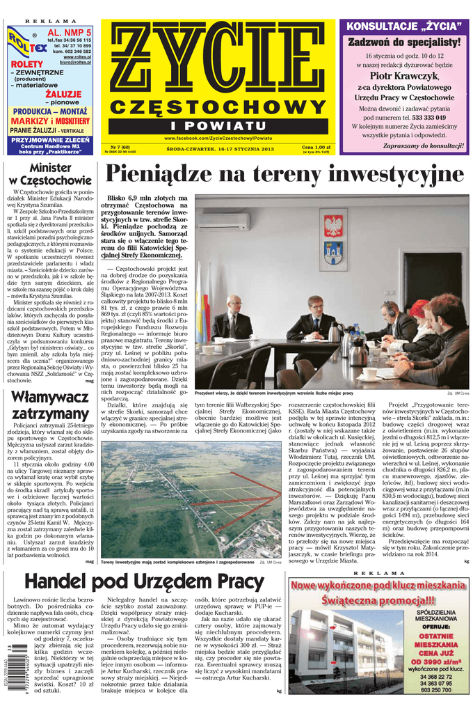 R E K L A M A KONSULTACJE „˚YCIA” Zadzwoƒ do specjalisty! 16 stycznia od godz. 10 do 12 w naszej redakcji dy˝urowaç b´dzie Piotr Krawczyk, CZ¢STOCHOWY I POWIATU www.facebook.com/ZycieCzestochowyIPowiatu Nr 7 (60) Nr ISSN 22 99 4440 Minister w Cz´stochowie W Cz´stochowie goÊci∏a w poniedzia∏ek Minister Edukacji Narodowej Krystyna Szumilas. W Zespole Szkolno-Przedszkolnym nr 1 przy al. Jana Paw∏a II minister spotka∏a si´ z dyrektorami przedszkoli, szkó∏ podstawowych oraz przedstawicielami poradni psychologicznopedagogicznych, z którymi rozmawia∏a o systemie edukacji w Polsce. W spotkaniu uczestniczyli równie˝ przedstawiciele parlamentu i w∏adz miasta. – SzeÊcioletnie dziecko zarówno w przedszkolu, jak i w szkole b´dzie tym samym dzieckiem, ale w szkole ma szans´ pójÊç o krok dalej – mówi∏a Krystyna Szumilas. Minister spotka∏a si´ równie˝ z rodzicami cz´stochowskich przedszkolaków, których zach´ca∏a do posy∏ania szeÊciolatków do pierwszych klas szkó∏ podstawowych. Potem w M∏odzie˝owym Domu Kultury uczestniczy∏a w podsumowaniu konkursu „Gdybym by∏ ministrem oÊwiaty... co bym zmieni∏, aby szko∏a by∏a miejscem dla ucznia?” organizowanego przez Regionalnà Sekcj´ OÊwiaty i Wychowania NSZZ „SolidarnoÊç” w Cz´mag stochowie. W∏amywacz zatrzymany Policjanci zatrzymali 25-letniego z∏odzieja, który w∏ama∏ si´ do sklepu sportowego w Cz´stochowie. M´˝czyzna us∏ysza∏ zarzut kradzie˝y z w∏amaniem, zosta∏ obj´ty dozorem policyjnym. 11 stycznia oko∏o godziny 4.00 na ulicy Targowej nieznany sprawca wy∏ama∏ krat´ oraz wybi∏ szyb´ w sklepie sportowym. Po wejÊciu do Êrodka skrad∏ artyku∏y sportowe i odzie˝owe ∏àcznej wartoÊci oko∏o tysiàca z∏otych. Policjanci pracujàcy nad tà sprawà ustalili, i˝ sprawcà jest znany im z podobnych czynów 25-letni Kamil W. M´˝czyzna zosta∏ zatrzymany zaledwie kilka godzin po dokonanym w∏amaniu. Us∏ysza∏ zarzut kradzie˝y z w∏amaniem za co grozi mu do 10 lat pozbawienia wolnoÊci. mag Mo˝na dzwoniç i zadawaç pytania pod numerem tel. 533 333 049 W kolejnym numerze ˚ycia zamieÊcimy wszystkie pytania i odpowiedzi. Zapraszamy do konsultacji! Cena 1,00 z∏ ÂRODA-CZWARTEK, 16-17 STYCZNIA 2013 (w tym 8% VAT) Pieniàdze na tereny inwestycyjne Blisko 6,9 mln z∏otych ma otrzymaç Cz´stochowa na przygotowanie terenów inwestycyjnych w tzw. strefie Skorki. Pieniàdze pochodzà ze Êrodków unijnych. Samorzàd stara si´ o w∏àczenie tego terenu do filii Katowickiej Specjalnej Strefy Ekonomicznej. — Cz´stochowski projekt jest na dobrej drodze do pozyskania Êrodków z Regionalnego Programu Operacyjnego Województwa Âlàskiego na lata 2007-2013. Koszt ca∏kowity projektu to blisko 8 mln 81 tys. z∏, z czego prawie 6 mln 869 tys. z∏ (czyli 85% wartoÊci projektu) stanowiç b´dà Êrodki z Europejskiego Funduszu Rozwoju Regionalnego — informuje biuro prasowe magistratu. Tereny inwestycyjne w tzw. strefie „Skorki”, przy ul. LeÊnej w pobli˝u po∏udniowo-zachodniej granicy miasta, o powierzchni blisko 25 ha majà zostaç kompleksowo uzbrojone i zagospodarowane. Dzi´ki temu inwestorzy b´dà mogli na nich rozpoczàç dzia∏alnoÊç gospodarczà. Dzia∏ki, które znajdujà si´ w strefie Skorki, samorzàd chce w∏àczyç w granice specjalnej strefy ekonomicznej. — Po próbie uzyskania zgody na stworzenie na Prezydent wierzy, ˝e dzi´ki terenom inwestycyjnym wzroÊnie liczba miejsc pracy tym terenie filii Wa∏brzyskiej Specjalnej Strefy Ekonomicznej, obecnie bardziej mo˝liwe jest w∏àczenie go do Katowickiej Specjalnej Strefy Ekonomicznej (jako Tereny inwestycyjne majà zostaç kompleksowo uzbrojone i zagospodarowane Zdj. UM Cz-wa Nielegalny handel na szcz´Êcie szybko zosta∏ zauwa˝ony. Dzi´ki wspó∏pracy stra˝y miejskiej z dyrekcjà Powiatowego Urz´du Pracy uda∏o si´ go zminimalizowaç. — Osoby trudniàce si´ tym procederem, rezerwujà sobie numerkiem kolejk´, a póêniej nielegalnie odsprzedajà miejsce w kolejce innym osobom — informuje Artur Kucharski, rzecznik prasowy stra˝y miejskiej. — Niejednokrotnie przez takie dzia∏ania brakuje miejsca w kolejce dla Zdj. UM Cz-wa rozszerzenie cz´stochowskiej filii KSSE). Rada Miasta Cz´stochowy podj´∏a w tej sprawie intencyjnà uchwa∏´ w koƒcu listopada 2012 r. (zosta∏y w niej wskazane tak˝e dzia∏ki w okolicach ul. Kusi´ckiej, stanowiàce jednak w∏asnoÊç Skarbu Paƒstwa) — wyjaÊnia W∏odzimierz Tutaj, rzecznik UM. Rozpocz´cie projektu zwiàzanego z zagospodarowaniem terenu przy ul. LeÊnej ma sprzyjaç tym zamierzeniom i zwi´kszyç jego atrakcyjnoÊç dla potencjalnych inwestorów. — Dzi´kuj´ Panu Marsza∏kowi oraz Zarzàdowi Województwa za uwzgl´dnienie naszego projektu w podziale Êrodków. Zale˝y nam na jak najlepszym przygotowaniu naszych terenów inwestycyjnych. Wierz´, ˝e to prze∏o˝y si´ na nowe miejsca pracy — mówi∏ Krzysztof Matyjaszczyk, w czasie briefingu prasowego w Urz´dzie Miasta. Projekt „Przygotowanie terenów inwestycyjnych w Cz´stochowie – strefa Skorki” zak∏ada, m.in.: budow´ cz´Êci drogowej wraz z oÊwietleniem (m.in. wykonanie jezdni o d∏ugoÊci 812,5 m i w∏àczenie jej w ul. LeÊnà poprzez skrzy˝owanie, postawienie 26 s∏upów oÊwietleniowych, odtworzenie nawierzchni w ul. LeÊnej, wykonanie chodnika o d∏ugoÊci 826,2 m, placu manewrowego, zjazdów, zieleƒców, itd), budow´ sieci wodociàgowej wraz z przy∏àczami (m.in 830,5 m wodociàgu), budow´ sieci kanalizacji sanitarnej i deszczowej wraz z przy∏àczami (o ∏àcznej d∏ugoÊci 1494 m), przebudow´ sieci energetycznych (o d∏ugoÊci 164 m) oraz budow´ przepompowni Êcieków. Przedsi´wzi´cie ma rozpoczàç si´ w tym roku. Zakoƒczenie przewidziano na rok 2014. R E K L A M A Handel pod Urz´dem Pracy Lawinowo roÊnie liczba bezrobotnych. Do poÊredniaka codziennie nap∏ywa fala osób, chc