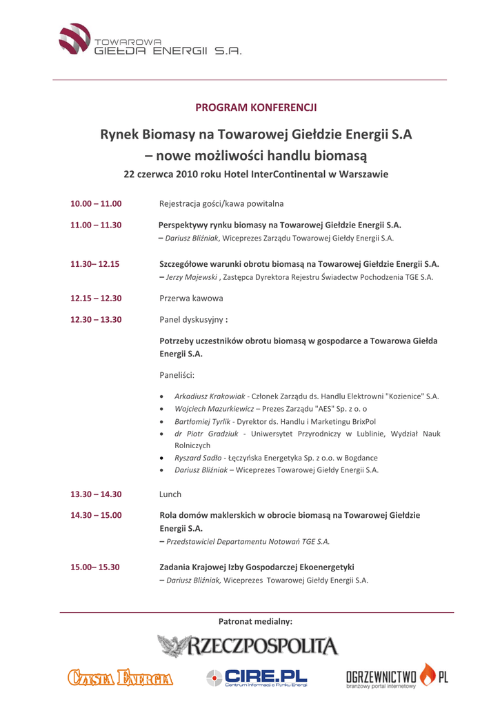 PROGRAM KONFERENCJI Rynek Biomasy na Towarowej Giełdzie Energii S.A – nowe możliwości handlu biomasą 22 czerwca 2010 roku Hotel InterContinental w Warszawie 10.00 – 11.00 Rejestracja gości/kawa powitalna 11.00 – 11.30 Perspektywy rynku biomasy na Towarowej Giełdzie Energii S.A. – Dariusz Bliźniak, Wiceprezes Zarządu Towarowej Giełdy Energii S.A. 11.30– 12.15 Szczegółowe warunki obrotu biomasą na Towarowej Giełdzie Energii S.A. – Jerzy Majewski , Zastępca Dyrektora Rejestru Świadectw Pochodzenia TGE S.A. 12.15 – 12.30 Przerwa kawowa 12.30 – 13.30 Panel dyskusyjny : Potrzeby uczestników obrotu biomasą w gospodarce a Towarowa Giełda Energii S.A. Paneliści: Arkadiusz Krakowiak - Członek Zarządu ds. Handlu Elektrowni "Kozienice" S.A. Wojciech Mazurkiewicz – Prezes Zarządu "AES" Sp. z o. o Bartłomiej Tyrlik - Dyrektor ds. Handlu i Marketingu BrixPol dr Piotr Gradziuk - Uniwersytet Przyrodniczy w Lublinie, Wydział Nauk Rolniczych Ryszard Sadło - Łęczyńska Energetyka Sp. z o.o. w Bogdance Dariusz Bliźniak – Wiceprezes Towarowej Giełdy Energii S.A. 13.30 – 14.30 Lunch 14.30 – 15.00 Rola domów maklerskich w obrocie biomasą na Towarowej Giełdzie Energii S.A. – Przedstawiciel Departamentu Notowao TGE S.A. 15.00– 15.30 Zadania Krajowej Izby Gospodarczej Ekoenergetyki – Dariusz Bliźniak, Wiceprezes Towarowej Giełdy Energii S.A. Patronat medialny: