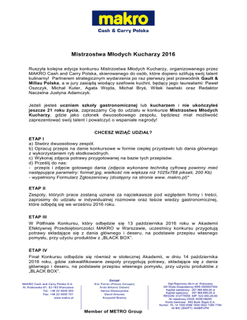 Mistrzostwa Młodych Kucharzy 2016 Ruszyła kolejna edycja konkursu Mistrzostwa Młodych Kucharzy, organizowanego przez MAKRO Cash and Carry Polska, skierowanego do osób, które dopiero szlifują swój talent kulinarny! Partnerem strategicznym wydarzenia po raz pierwszy jest przewodnik Gault & Millau Polska, a w jury zasiądą wiodący szefowie kuchni, będący jego laureatami: Paweł Oszczyk, Michał Kuter, Agata Wojda, Michał Bryś, Witek Iwański oraz Redaktor Naczelna Justyna Adamczyk. Jeżeli jesteś uczniem szkoły gastronomicznej lub kucharzem i nie ukończyłeś jeszcze 21 roku życia, zapraszamy Cię do udziału w konkursie Mistrzostwa Młodych Kucharzy, gdzie jako członek dwuosobowego zespołu, będziesz miał możliwość zaprezentować swój talent i powalczyć o wspaniałe nagrody! CHCESZ WZIĄĆ UDZIAŁ? ETAP I a) Stwórz dwuosobowy zespół. b) Opracuj przepis na danie konkursowe w formie ciepłej przystawki lub dania głównego z wykorzystaniem ryb słodkowodnych. c) Wykonaj zdjęcia potrawy przygotowanej na bazie tych przepisów. d) Prześlij do nas: - przepis i zdjęcie gotowego dania (zdjęcia wykonane techniką cyfrową powinny mieć następujące parametry: format jpg, wielkość nie większa niż 1025x768 pikseli, 200 Kb) - wypełniony Formularz Zgłoszeniowy (dostępny na stronie www. makro.pl)* ETAP II Zespoły, których prace zostaną uznane za najciekawsze pod względem formy i treści, zaprosimy do udziału w indywidualnej rozmowie oraz teście wiedzy gastronomicznej, które odbędą się we wrześniu 2016 roku. ETAP III W Półfinale Konkursu, który odbędzie się 13 października 2016 roku w Akademii Efektywnej Przedsiębiorczości MAKRO w Warszawie, uczestnicy konkursu przygotują potrawy składające się z dania głównego i deseru, na podstawie przepisu własnego pomysłu, przy użyciu produktów z „BLACK BOX”. ETAP IV Finał Konkursu odbędzie się również w stołecznej Akademii, w dniu 14 października 2016 roku, gdzie zakwalifikowane zespoły przygotują potrawy, składające się z dania głównego i deseru, na podstawie przepisu własnego pomysłu, przy użyciu produktów z „BLACK BOX”. MAKRO Cash and Carry Polska S.A. Al. Krakowska 61, 02-183 Warszawa Tel.: +48 22 5000 000 Fax: +48 22 5000 701 www.makro.pl Zarząd Eric Poirier (Prezes Zarządu) Anita Brkanić Debelić Hanna Dereszyńska David Antunes Krzysztof Branny Member of METRO Group Sąd Rejonowy dla m.st. Warszawy XIII Wydz.Gospodarczy KRS 0000047354 Kapitał zakładowy: 257 068 680,00 zł Kapitał wpłacony: 257 068 680,00 zł REGON: 012775559 NIP: 522-000-28-60 Nr rejestrowy GIOŚ: E0001892W Konto bankowe: ING Bank Śląski S.A. Numer: PL 14 1050 0086 1000 0022 7360 7784 Nr BIC (SWIFT): INGBPLPW Makro Cash and Carry Polska S.A. Al. Krakowska 61, 02-183 Warszawa * Prawidłowo wypełniony Formularz Zgłoszeniowy i Formularze Przygotowania Przepisu z załączonymi zdjęciami należy wysłać do dnia 30 czerwca 2016 r. na adres pocztowy: MAKRO Cash and Carry Polska S.A. Dział PR i Komunikacji wewnętrznej, Aleja Krakowska 61, 02-183 Warszawa z dopiskiem „Mistrzostwa Młodych Kucharzy 2015” lub pocztą elektroniczną na adres [email protected] - z tytułem „Mistrzostwa Młodych Kucharzy 2016” NA ZWYCIĘZCÓW CZEKAJĄ: #1 Dwutygodniowy staż w zagranicznej restauracji + bon na zakupy w MAKRO o wartości 4000 zł brutto. #2 Dwutygodniowy staż w restauracji + sprzęt kulinarny o wartości do 3000 zł brutto. #3 Tygodniowy staż w restauracji + sprzęt kulinarny o wartości do 2000 zł brutto. Koszt noclegów i diet zostanie pokryty przez MAKRO. Dodatkowo, nauczyciel lub kucharz, pełniący rolę opiekuna zespołu, który zajmie 1 miejsce, otrzyma bony towarowe o wartości 1500 zł brutto na zakupy w MAKRO, zaś za drugie - 1000 zł, a za trzecie - 500 zł. Page 2 of 2 Member of METRO Group