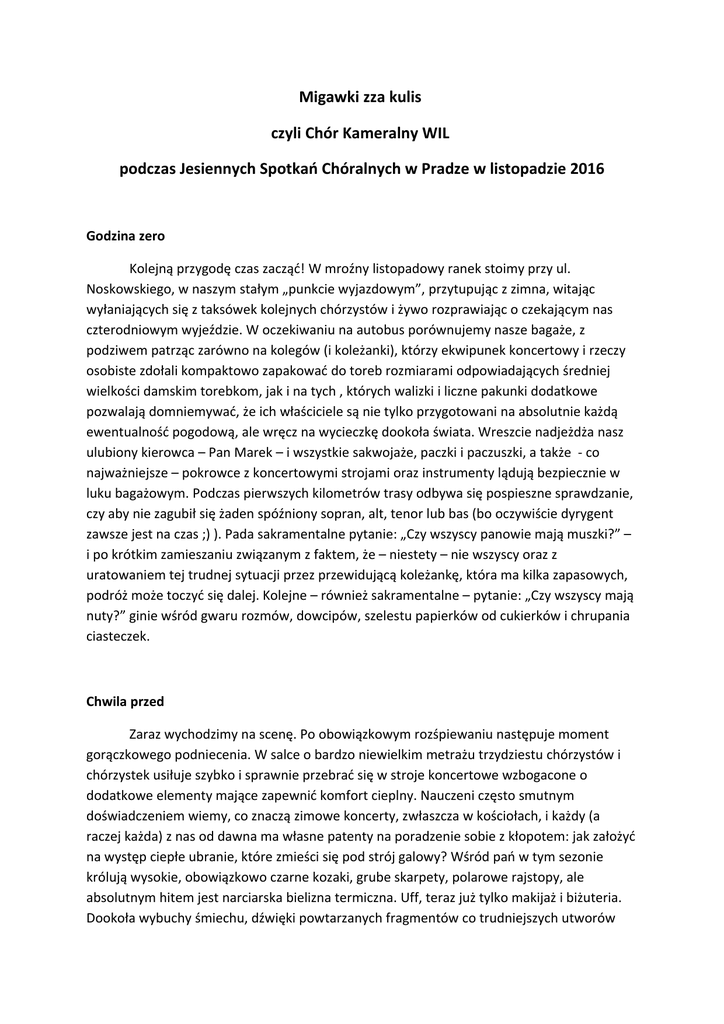 Migawki zza kulis czyli Chór Kameralny WIL podczas Jesiennych Spotkań Chóralnych w Pradze w listopadzie 2016 Godzina zero Kolejną przygodę czas zacząć! W mroźny listopadowy ranek stoimy przy ul. Noskowskiego, w naszym stałym „punkcie wyjazdowym”, przytupując z zimna, witając wyłaniających się z taksówek kolejnych chórzystów i żywo rozprawiając o czekającym nas czterodniowym wyjeździe. W oczekiwaniu na autobus porównujemy nasze bagaże, z podziwem patrząc zarówno na kolegów (i koleżanki), którzy ekwipunek koncertowy i rzeczy osobiste zdołali kompaktowo zapakować do toreb rozmiarami odpowiadających średniej wielkości damskim torebkom, jak i na tych , których walizki i liczne pakunki dodatkowe pozwalają domniemywać, że ich właściciele są nie tylko przygotowani na absolutnie każdą ewentualność pogodową, ale wręcz na wycieczkę dookoła świata. Wreszcie nadjeżdża nasz ulubiony kierowca – Pan Marek – i wszystkie sakwojaże, paczki i paczuszki, a także - co najważniejsze – pokrowce z koncertowymi strojami oraz instrumenty lądują bezpiecznie w luku bagażowym. Podczas pierwszych kilometrów trasy odbywa się pospieszne sprawdzanie, czy aby nie zagubił się żaden spóźniony sopran, alt, tenor lub bas (bo oczywiście dyrygent zawsze jest na czas ;) ). Pada sakramentalne pytanie: „Czy wszyscy panowie mają muszki?” – i po krótkim zamieszaniu związanym z faktem, że – niestety – nie wszyscy oraz z uratowaniem tej trudnej sytuacji przez przewidującą koleżankę, która ma kilka zapasowych, podróż może toczyć się dalej. Kolejne – również sakramentalne – pytanie: „Czy wszyscy mają nuty?” ginie wśród gwaru rozmów, dowcipów, szelestu papierków od cukierków i chrupania ciasteczek. Chwila przed Zaraz wychodzimy na scenę. Po obowiązkowym rozśpiewaniu następuje moment gorączkowego podniecenia. W salce o bardzo niewielkim metrażu trzydziestu chórzystów i chórzystek usiłuje szybko i sprawnie przebrać się w stroje koncertowe wzbogacone o dodatkowe elementy mające zapewnić komfort cieplny. Nauczeni często smutnym doświadczeniem wiemy, co znaczą zimowe koncerty, zwłaszcza w kościołach, i każdy (a raczej każda) z nas od dawna ma własne patenty na poradzenie sobie z kłopotem: jak założyć na występ ciepłe ubranie, które zmieści się pod strój galowy? Wśród pań w tym sezonie królują wysokie, obowiązkowo czarne kozaki, grube skarpety, polarowe rajstopy, ale absolutnym hitem jest narciarska bielizna termiczna. Uff, teraz już tylko makijaż i biżuteria. Dookoła wybuchy śmiechu, dźwięki powtarzanych fragmentów co trudniejszych utworów przetykane uwagami: „Ćśś! Przecież nas słychać na sali!”, „Teczki w lewej ręce!” lub czasem nieco rozpaczliwymi pytaniami: „Kolejność, jaka kolejność?”, „Wchodzimy od sopranów czy od altów?” Koncert To już. Stoimy w praskich kościele pw. Św. Mikołaja, wodząc oczami po publiczności i słuchając konferansjera zapowiadającego nasz występ. Jesteśmy mile zaskoczeni, bo okazuje się, że na festiwalu w Pradze dba się o zdrowie uczestników – w świątyni jest względnie ciepło, a obecność dużych olejowych nagrzewnic powoduje nawet wśród panów pewnego rodzaju niezadowolenie – że ZA gorąco. (Tu krótka dygresja. Podczas naszego ostatniego koncertu w niedzielę po południu w Zgorzelcu, po kilkunastu minutach śpiewu moje sine, zgrabiałe palce ledwo dają radę przewracać nuty, z trudem usiłuję opanować dreszcze, zastanawiam się, kiedy odmówią mi posłuszeństwa moje kompletnie zdrętwiałe stopy i z utęsknieniem czekam na nasze ostatnie utwory takie, jak „The Lion Sleeps Tonight” czy „Siyahamba, podczas których mam na sobie dodatkową warstwę ubrania – strój afrykański – i mogę się rozgrzać, tańcząc i grając na patykach, jajeczkach czy innych pomysłach rodem z instrumentarium Orffa ). Teraz wszyscy w skupieniu patrzymy na naszą dyrygentkę i przyjaciółkę Justynę Chełmińską, śledzimy każdy ruch jej rąk, słuchając siebie nawzajem i starając się zaprezentować słuchaczom piękno przygotowanych przez nas utworów, takich jak: „Wierzę”, „Sanctus” czy „Muzyka poranna”. W przerwach między śpiewaniem z nadzieją spoglądamy na twarze publiczności, szukając uśmiechów na twarzach a czasem łez wzruszenia. Trudno opisać uczucie, gdy czujemy, że nasze ulubione „Totus Tuus” wykonaliśmy dobrze, gdy zamknięciu ostatniego akordu przez Justynę następuje chwila, gdy wybrzmiewa on w powietrzu, przechodząc w moment magicznej ciszy, pełnej zachwytu. Potem ręce dyrygenta opadają – jest aplauz, tak, podobało się. Et caetera… Często później, po powrocie do domu, wspominamy również te momenty „pomiędzy” – pomiędzy próbami i koncertami. Pamięta się wspólne rozmowy, partyjki kości, posiłki – zarówno te dość spartańskie w różnej klasy hotelach, jak i te wykwintne, w restauracjach, gdzie z chęcią dzielimy się otrzymanymi pysznościami. Na myśl przychodzą ciągle żywe wspomnienia o ekspresowym zwiedzaniu Pragi z przemiłym przewodnikiem Martinem, o gorączkowym przetrząsaniu autobusu w poszukiwaniu koncertowego obuwia jednego z kolegów (które niestety przepadło w akcji bezpowrotnie) czy o niezapomnianym wieczorze w głównym holu hotelowym, gdzie wzbudziliśmy konsternację a nawet szok wśród obsługi i innych gości, tańcząc w ciepłych paputkach przy dźwiękach „Macareny”, wydobywających się z subtelnego kilkunastocentymetrowego głośniczka. Niech żyją wyjazdy chóralne! Lidia Ossowska