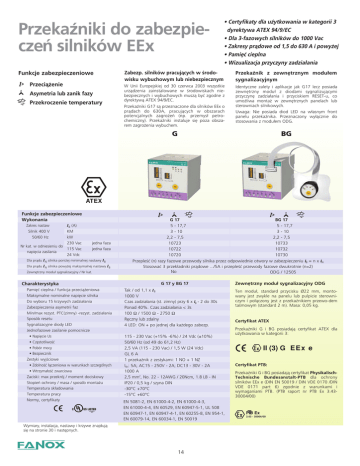 Przekaÿniki do zabezpieczeË silników EEx Funkcje zabezpieczeniowe Przeciäèenie Asymetria lub zanik fazy Przekroczenie temperatury • Certyfikaty dla uÿytkowania w kategorii 3 dyrektywa ATEX 94/9/EC • Dla 3-fazowych silników do 1000 Vac • Zakresy prädowe od 1,5 do 630 A i powyèej • PamiëÏ cieplna • Wizualizacja przyczyny zadziaïania Zabezp. silników pracujäcych w Ärodowisku wybuchowym lub niebezpiecznym Przekaÿnik z zewnëtrznym moduïem sygnalizacyjnym W Unii Europejskiej od 30 czerwca 2003 wszystkie urzädzenia zainstalowane w Ärodowiskach niebezpiecznych i wybuchowych muszä byÏ zgodne z dyrektywä ATEX 94/9/EC. Identyczne zalety i aplikacje jak G17 lecz posiada zewnëtrzny moduï z diodami sygnalizujäcymi przyczynë zadziaïania i przyciskiem RESET-u, co umoèliwa montaè w zewnëtrznych panelach lub sterowniach silnikowych. Przekaÿniki G17 sä przeznaczone dla silników EEx o prädach do 630A, pracujäcych w obszarach potencjalnych zagroèeË (np. przemysï petrochemiczny). Przekaÿniki instaluje sië poza obszarem zagroèenia wybuchem. Uwaga: Nie posiada diod LED na wïasnym front panelu przekaÿnika. Przeznaczony wyïäcznie do stosowania z moduïem ODG. G BG ATEX Funkcje zabezpieczeniowe Wykonania Zakres nastaw Silnik 400 V 50/60 Hz G 17 BG 17 5 - 17,7 5 - 17,7 3 - 10 3 - 10 2,2 - 7,5 2,2 - 7,5 10723 10733 10722 10732 10720 10730 PrzepleÄÏ (n) razy fazowe przewody silnika przez odpowiednie otwory w zabezpieczeniu IB = n x IN StosowaÏ 3 przekïadniki prädowe .../5A i przepleÄÏ przewody fazowe dwukrotnie (n=2) No ODG / 12505 IB (A) KM kW 230 Vac jedna faza Nr kat. w odniesieniu do 115 Vac napiëcia zasilania 24 Vdc jedna faza Dla prädu IN silnika ponièej minimalnej nastawy IB Dla prädu IN silnika powyèej maksymalnej nastawy IB Zewnëtrzny moduï sygnalizacyjny / Nr kat. G 17 y BG 17 Charakterystyka PamiëÏ cieplna / funkcja przeciäèeniowa Maksymalne nominalne napiëcie silnika Do wyboru 15 krzywych zadziaïania Zabezpieczenia asymetrii faz Min/max rezyst. PTC(zimny) -rezyst. zadziaïania Sposób resetu Sygnalizacyjne diody LED Tak / od 1,1 x IB 1000 V Czas zadziaïania (st. zimny) przy 6 x IB - 2 do 30s Ponad 40%. Czas zadziaïania < 3s 100 Ω / 1500 Ω - 2750 Ω Rëczny lub zdalny 4 LED: ON + po jednej dla kaèdego zabezp. Jednofazowe zasilanie pomocnicze • Napiëcie Us • CzëstotliwoÄÏ • Pobór mocy • Bezpiecznik Zestyki wyjÄciowe • ZdolnoÄÏ ïäczeniowa w warunkach szczególnych • WtrzymaïoÄÏ zwarciowa Zaciski: max przekrój / moment dociskowy StopieË ochrony / masa / sposób montaèu Temperatura skïadowania Temperatura pracy Normy, certyfikaty C US LISTED IND. CONT. EQ. 6 R 73 115 - 230 Vac (+15% -6%) / 24 Vdc (±10%) 50/60 Hz (od 49 do 61,2 Hz) 2,5 VA (115 - 230 Vac) / 1,5 W (24 Vdc) GL 6 A 1 przekaÿnik z zestykami: 1 NO + 1 NZ Ith: 5A; AC15 - 250V - 2A; DC13 - 30V - 2A 1000 A 2,5 mm2, No. 22 - 12AWG / 20Ncm, 1.8 LB - IN IP20 / 0,5 kg / szyna DIN -30°C +70°C -15°C +60°C EN EN EN EN 5081-2, EN 61000-4-2, EN 61000-4-3, 61000-4-4, EN 60529, EN 60947-5-1, UL 508 60947-1, EN 60947-4-1, EN 60255-8, EN 954-1, 60079-14, EN 60034-1, EN 50019 Wymiary, instalacja, nastawy i krzywe znajdujä sië na stronie 30 i nastëpnych. 14 Zewnëtrzny moduï sygnalizacyjny ODG Ten moduï, standard przycisku Ø22 mm, montowany jest zwykle na panelu lub pulpicie sterowniczym i poïäczony jest z przekaÿnikiem przewo-dem taÄmowym (standard 2 m). Masa: 0,05 kg. Certyfikat ATEX Przekaÿniki G i BG posiadajä certyfikat ATEX dla uÿytkowania w kategorii 3: II (3) G EEx e Certyfikat PTB: Przekaÿniki G i BG posiadajä certyfikat PhysikalischTechnische Bundesanstalt-PTB dla ochrony silników EEx e (DIN EN 50019 / DIN VDE 0170 /DIN VDE 0171 part 6) zgodnie z warunkami i wymaganiami PTB. (PTB raport nr PTB Ex 3.4330004/00) Ex 3.43 - 30004/00 ...../00