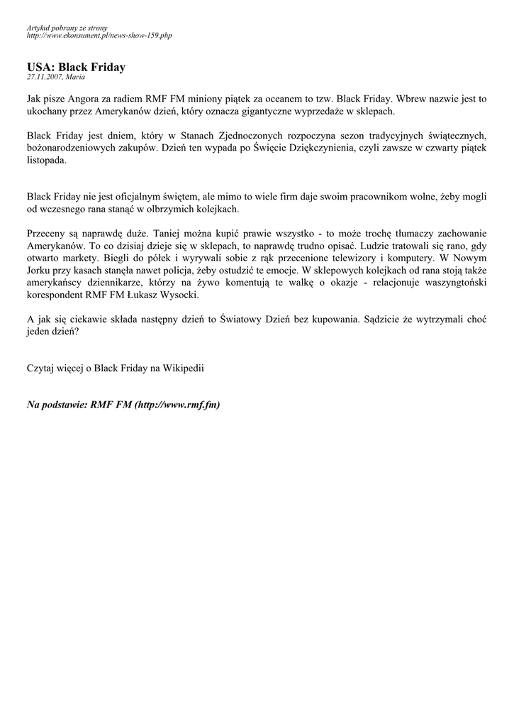 Artykuł pobrany ze strony http://www.ekonsument.pl/news-show-159.php USA: Black Friday 27.11.2007, Maria Jak pisze Angora za radiem RMF FM miniony piątek za oceanem to tzw. Black Friday. Wbrew nazwie jest to ukochany przez Amerykanów dzień, który oznacza gigantyczne wyprzedaże w sklepach. Black Friday jest dniem, który w Stanach Zjednoczonych rozpoczyna sezon tradycyjnych świątecznych, bożonarodzeniowych zakupów. Dzień ten wypada po Święcie Dziękczynienia, czyli zawsze w czwarty piątek listopada. Black Friday nie jest oficjalnym świętem, ale mimo to wiele firm daje swoim pracownikom wolne, żeby mogli od wczesnego rana stanąć w olbrzymich kolejkach. Przeceny są naprawdę duże. Taniej można kupić prawie wszystko - to może trochę tłumaczy zachowanie Amerykanów. To co dzisiaj dzieje się w sklepach, to naprawdę trudno opisać. Ludzie tratowali się rano, gdy otwarto markety. Biegli do półek i wyrywali sobie z rąk przecenione telewizory i komputery. W Nowym Jorku przy kasach stanęła nawet policja, żeby ostudzić te emocje. W sklepowych kolejkach od rana stoją także amerykańscy dziennikarze, którzy na żywo komentują te walkę o okazje - relacjonuje waszyngtoński korespondent RMF FM Łukasz Wysocki. A jak się ciekawie składa następny dzień to Światowy Dzień bez kupowania. Sądzicie że wytrzymali choć jeden dzień? Czytaj więcej o Black Friday na Wikipedii Na podstawie: RMF FM (http://www.rmf.fm)