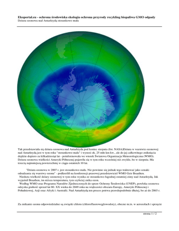 Ekoportal.eu - ochrona środowiska ekologia ochrona przyrody recykling biopaliwa GMO odpady Dziura ozonowa nad Antarktydą stosunkowo mała Tak przedstawiała się dziura ozonowa nad Antarktyda pod koniec sierpnia (fot. NASA)Dziura w warstwie ozonowej nad Antarktydą jest w tym roku "stosunkowo mała" i wynosi ok. 25 mln km kw., ale do jej całkowitego zniknięcia dojdzie dopiero za kilkadziesiąt lat - poinformowała we wtorek Światowa Organizacja Meteorologiczna (WMO). Dziura ozonowa wielkości Ameryki Północnej pojawiła się w tym roku wcześniej niż zwykle, bo w sierpniu. Ma trzecią najmniejszą powierzchnię w ciągu ostatnich 10 lat. "Dziura ozonowa w 2007 r. jest stosunkowo mała. Nie powinno się jednak tego traktować jako oznaki odradzania się warstwy ozonu" - podkreślił na konferencji prasowej przedstawiciel WMO Geir Braathen. Nieduża wielkość dziury ozonowej w tym roku wynika ze stosunkowo łagodnej ostatniej zimy nad Antarktydą. Jak wyjaśnił Braathen, im niższa temperatura, tym szybciej znika ozon. Według WMO oraz Programu Narodów Zjednoczonych do spraw Ochrony Środowiska (UNEP), powłoka ozonowa odzyska grubość sprzed lat 80. XX wieku do 2049 roku na większości obszaru Europy, Ameryki Północnej i Południowej, Azji oraz Afryki i Australii. Nad Antarktydą ten proces potrwa prawdopodobnie dłużej, bo aż do 2065 r. Za znikanie ozonu odpowiedzialne są związki chloru (chlorofluorowęglowodory), obecne m.in. w aerozolach i sprzęcie strona 1 / 2 Ekoportal.eu - ochrona środowiska ekologia ochrona przyrody recykling biopaliwa GMO odpady Dziura ozonowa nad Antarktydą stosunkowo mała chłodzącym. Wykorzystanie tych związków w procesach produkcji zostało zakazane w 1987 roku przez Protokół Montrealski. Dotychczas ratyfikowało go 180 państw. We wrześniu bieżącego roku na konferencji pod egidą ONZ z okazji 20. rocznicy podpisania Protokołu Montrealskiego uzgodniono przyspieszenie o dziesięć lat rezygnacji ze szkodliwych dla ozonosfery chloro- i fluorowęglowodorów zarówno w przypadku krajów wysoko rozwiniętych, jak i w przypadku krajów rozwijających się. Wzrost emisji gazów cieplarnianych do atmosfery spowoduje jednak pojawienie się w ciągu najbliższych kilkudziesięciu lat nowych dziur ozonowych. Źródło: PAP strona 2 / 2