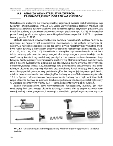 Maria Kleinrok • Zaburzenia czynnościowe układu ruchowego narządu żucia 9.1 ANALIZA WEWNĄTRZUSTNA ZWARCIA ZA POMOCĄ FUNKCJOGRAFU WG KLEINROK Urządzeniem służącym do wewnątrzustnej rejestracji zwarcia jest „Funkcjograf wg Kleinrok” (oficjalna nazwa) (ryc. 72, 73). Dzięki uniwersalnemu pisakowi możliwa jest rejestracja zarówno ruchów żuchwy bez kontaktu zębów sztywnym pisakiem, jak i ruchów żuchwy z kontaktem zębów ruchomym pisakiem (ryc. 72-75). Uniwersalny pisak Funkcjografu został zgłoszony w Urzędzie Patentowym 09.11.1977 r. i opatentowany pod nr 112790. Metoda rejestracji wewnątrzustnej za pomocą Funkcjografu polega na tym, że rejestruje się najpierw kąt prowadzenia stawowego, tj. łuk gotycki sztywnym pisakiem, a następnie zapisuje się na tej samej płytce rejestracyjnej wszystkie możliwe ruchy żuchwy z kontaktem zębów z użyciem ruchomego pisaka (rozdz. 5, 6) (22, 112, 113, 124, 129, 210). Umożliwia to nie tylko uzyskanie danych ze ssż, lecz także dotyczących zwarcia centrycznego i ekscentrycznego, a ponadto daje możliwość oceny korelacji czynnościowej pomiędzy tzw. prowadzeniem stawowym i zębowym. Funkcjogramy wewnątrzustne żuchwy wg Kleinrok zarówno podstawowe, jak i z polem zwarciowym, pozwalają na obiektywną ocenę zwarcia centrycznego i ekscentrycznego (rozdz. 5, 6). Rejestracja kąta prowadzenia stawowego z linią centralnego ułożenia żuchwy wg Kleinrok oraz środkowy kanał wiodący Funkcjografu umożliwiają obiektywną ocenę położenia głów żuchwy w jej dotylnym położeniu, a także przeprowadzenie centralizacji głów żuchwy w sposób kontrolowany (rozdz. 12.1.1). Sposób odtwarzania ruchu przywodzenia żuchwy do szczęki w linii centralnego ułożenia żuchwy za pomocą środkowego kanału wiodącego został zgłoszony w Urzędzie Patentowym w dniu 17.11.1980 r. i opatentowany pod nr 128154. Zapisy Funkcjografem, czyli wewnątrzustne funkcjogramy żuchwy, jak również zapisy linii centralnego ułożenia żuchwy, stanowią dalszy etap w rozwoju konwencjonalnej metody rejestracji wewnątrzustnej łuku gotyckiego za pomocą szty- RYC. 63. Uniwersalny pisak Funkcjografu wg Kleinrok (u góry) i jego części składowe (u dołu). 114 Instrumentalna analiza zwarcia i czynności żuchwy RYC. 64. Funkcjograf zamontowany na modelach. wnego pisaka, tj. tzw. ćwieka centralnego (rozdz. 12.1.1). Kąt zawarty pomiędzy bocznymi ruchami żuchwy został opisany i zilustrowany przez Balkwilla w 1866 r., a pierwsze urządzenie do rejestracji łuku gotyckiego oparte na zastosowaniu sztywnego pisaka, tj. tzw. neddle point tracing device, zostało najprawdopodobniej opracowane w 1897 r. przez Hessego i następnie rozpowszechnione szeroko przez Gysiego (1910 r.) i Gerbera (59, 95). W piśmiennictwie opisano również próby wyłącznego stosowania ruchomego pisaka. Ograniczały się one jednak wyłącznie do rejestracji centralnego położenia żuchwy i do umiejscowienia przedwczesnych kontaktów zębów w tym położeniu żuchwy oraz do zapisu maksymalnego zaguzkowania zębów (141, 154, 244). Dopiero opracowanie wewnątrzustnej metody rejestracji ruchów żuchwy za pomocą uniwersalnego przestawialnego pisaka „Funkcjografu wg Kleinrok” w 1977 r. pozwoliło na pełną wewnątrzustną graficzną analizę zwarcia zarówno centrycznego, jak i ekscentrycznego oraz centralnego położenia żuchwy (rozdz. 5, 6, 115