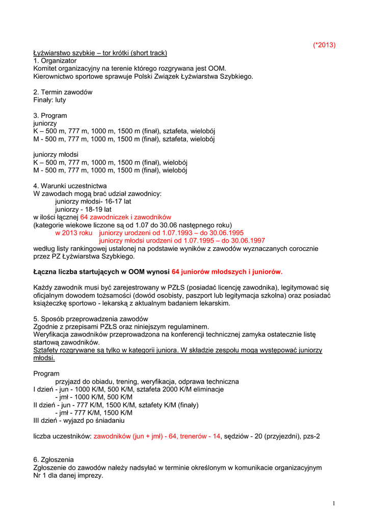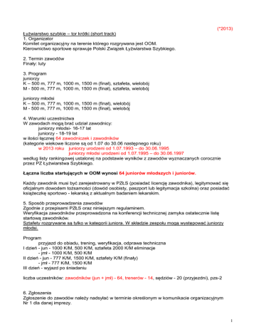 (*2013) Łyżwiarstwo szybkie – tor krótki (short track) 1. Organizator Komitet organizacyjny na terenie którego rozgrywana jest OOM. Kierownictwo sportowe sprawuje Polski Związek Łyżwiarstwa Szybkiego. 2. Termin zawodów Finały: luty 3. Program juniorzy K – 500 m, 777 m, 1000 m, 1500 m (finał), sztafeta, wielobój M - 500 m, 777 m, 1000 m, 1500 m (finał), sztafeta, wielobój juniorzy młodsi K – 500 m, 777 m, 1000 m, 1500 m (finał), wielobój M - 500 m, 777 m, 1000 m, 1500 m (finał), wielobój 4. Warunki uczestnictwa W zawodach mogą brać udział zawodnicy: juniorzy młodsi- 16-17 lat juniorzy - 18-19 lat w ilości łącznej 64 zawodniczek i zawodników (kategorie wiekowe liczone są od 1.07 do 30.06 następnego roku) w 2013 roku juniorzy urodzeni od 1.07.1993 – do 30.06.1995 juniorzy młodsi urodzeni od 1.07.1995 – do 30.06.1997 według listy rankingowej ustalonej na podstawie wyników z zawodów wyznaczanych corocznie przez PZ Łyżwiarstwa Szybkiego. Łączna liczba startujących w OOM wynosi 64 juniorów młodszych i juniorów. Każdy zawodnik musi być zarejestrowany w PZŁS (posiadać licencję zawodnika), legitymować się oficjalnym dowodem tożsamości (dowód osobisty, paszport lub legitymacja szkolna) oraz posiadać książeczkę sportowo - lekarską z aktualnym badaniem lekarskim. 5. Sposób przeprowadzenia zawodów Zgodnie z przepisami PZŁS oraz niniejszym regulaminem. Weryfikacja zawodników przeprowadzona na konferencji technicznej zamyka ostatecznie listę startową zawodników. Sztafety rozgrywane są tylko w kategorii juniora. W składzie zespołu mogą występować juniorzy młodsi. Program przyjazd do obiadu, trening, weryfikacja, odprawa techniczna I dzień - jun - 1000 K/M, 500 K/M, sztafeta 2000 K/M eliminacje - jmł - 1000 K/M, 500 K/M II dzień - jun - 777 K/M, 1500 K/M, sztafety K/M (finały) - jmł - 777 K/M, 1500 K/M III dzień - wyjazd po śniadaniu liczba uczestników: zawodników (jun + jmł) - 64, trenerów - 14, sędziów - 20 (przyjezdni), pzs-2 6. Zgłoszenia Zgłoszenie do zawodów należy nadsyłać w terminie określonym w komunikacie organizacyjnym Nr 1 dla danej imprezy. 1 7. Punktacja juniorzy wielobój Lok. 1 2 3 PKT 15 12 10 dystanse, sztafety Lok. 1 2 3 PKT 15 12 10 4 9 4 8 5 8 6 7 7 6 8 5 9 10 11 12 4 3 2 1 82 5 6 6 4 7 3 8 2 60 juniorzy młodsi K/M - dystanse 500, 777, 1000, 1500, wielobój Lok. 1 2 3 4 5 6-7 8-9 10-12 PKT 9 7 6 5 4 3 2 1 44 D. System ocen Łyżwiarstwo szybkie – tor krótki (short track) I. Młodzieżowe Mistrzostwa Polski K/M – 20-23 lata 1.Program zawodów K/M – dystanse – 500, 1000, 1500, sztafeta 2. Punktacja dystanse, sztafeta Lok. 1 2 3 4 5 6 7 8 PKT 25 21 18 16 14 12 10 8 124 (w ramach MP Seniorów) II. Mistrzostwa Polski Juniorów K/M - 18-19 lat 1.Program zawodów I dzień zawodów – K/M - 1000 m, 500 m, oraz eliminacje sztafet K, M II dzień zawodów – K/M - 777 m, 1500 m (finał), finały sztafet K, M 2. Punktacja K/M - wielobój Lok. 1 2 3 4 5 6 7 8 9 10 11 12 PKT 15 12 10 9 8 7 6 5 4 3 2 1 82 dystanse, sztafety Lok. 1 2 3 4 5 6 7 8 PKT 15 12 10 8 6 4 3 2 60 III. Olimpiada Młodzieży - Mistrzostwa Polski Juniorów Młodszych 1.Program zawodów I dzień zawodów – K/M – 500 m, 1000 m II dzień zawodów – K/M - 777 m, 1500 m (finał) 2. Punktacja K/M – 500, 777, 1000, 1500, wielobój Lok. 1 2 3 4 5 6-7 8-9 10-12 PKT 9 7 6 5 4 3 2 1 44 K/M - 16-17 lat 2 IV. Mistrzostwa Polski Młodzików K/M – 14-15 lat 1.Program zawodów K/M – 500, 1000, 777, 1500, wielobój, sztafeta 2 km 2.Punktacja K/M - 500, 777, 1000, 1500, wielobój, sztafeta 2 km Lok. 1 2-4 5-8 9-12 13-16 PKT 5 4 3 2 1 41 E. Roczniki młodzieżowcy juniorzy juniorzy młodsi młodzicy 20-23 lat (w 2013 roku urodzeni od 1.07.1989 – do 30.06.1993) 18-19 lat (w 2013 roku urodzeni od 1.07.1993 – do 30.06.1995) 16-17 lat (w 2013 roku urodzeni od 1.07.1995 – do 30.06.1997) 14-15 lat (w 2013 roku urodzeni od 1.07.1997 – do 30.06.1999) Przypominamy: - w zawodach uczestniczą kluby posiadające licencję wydaną przez właściwy polski związek, - zawodnicy muszą posiadać licencję wydaną przez właściwy związek, - w przypadku braku licencji klubowej – punkty naliczane będą dla gminy, - komunikat z zawodów winien zawierać rok urodzenia zawodnika, numer licencji zawodnika oraz pełną nazwę klubu, wykaz członków komisji sędziowskiej wraz z ich nr licencji i być podpisany przez sędziego głównego z podaniem jego nr licencji - komunikat z zawodów należy przesłać na adres Polskiej Federacji Sportu Młodzieżowego w ciągu 14 dni po zawodach, - wnioski o przyznanie premii punktowej, wnioski o podział punktów powinny wpłynąć od pzs do Komisji Sportu PFSM najpóźniej w terminie do dnia 31 października danego roku (decyduje data stempla pocztowego), - uwagi dotyczące wprowadzonych danych, w szczególności nazw klubów i przyznanych punktów powinny wpływać na bieżąco do PFSM a najpóźniej w terminie do dnia 10 listopada danego roku, - prosimy o zapoznanie się z częścią ogólną regulaminu współzawodnictwa, gdzie podane są zasady uczestnictwa i oceny wyników we wszystkich dyscyplinach systemu, - na stronie internetowej PFSM (www.sportmlodziezowy.pl) umieszczane są średnio co dwa tygodnie wyniki współzawodnictwa, - od 2010 roku w Młodzieżowych Mistrzostwach Polski w konkurencjach indywidualnych, gdzie liczba ostatecznie sklasyfikowanych zawodników jest mniejsza niż 8, zawodnicy będą otrzymywać połowę punktów. 3