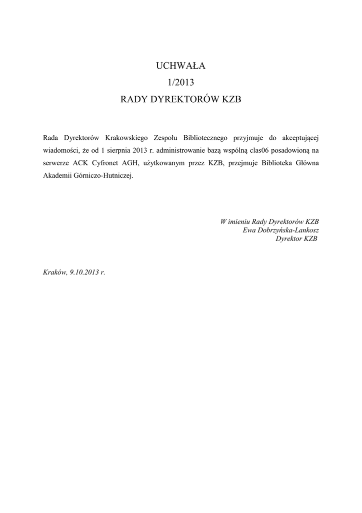 UCHWAŁA 1/2013 RADY DYREKTORÓW KZB Rada Dyrektorów Krakowskiego Zespołu Bibliotecznego przyjmuje do akceptującej wiadomości, że od 1 sierpnia 2013 r. administrowanie bazą wspólną clas06 posadowioną na serwerze ACK Cyfronet AGH, użytkowanym przez KZB, przejmuje Biblioteka Główna Akademii Górniczo-Hutniczej. W imieniu Rady Dyrektorów KZB Ewa Dobrzyńska-Lankosz Dyrektor KZB Kraków, 9.10.2013 r.