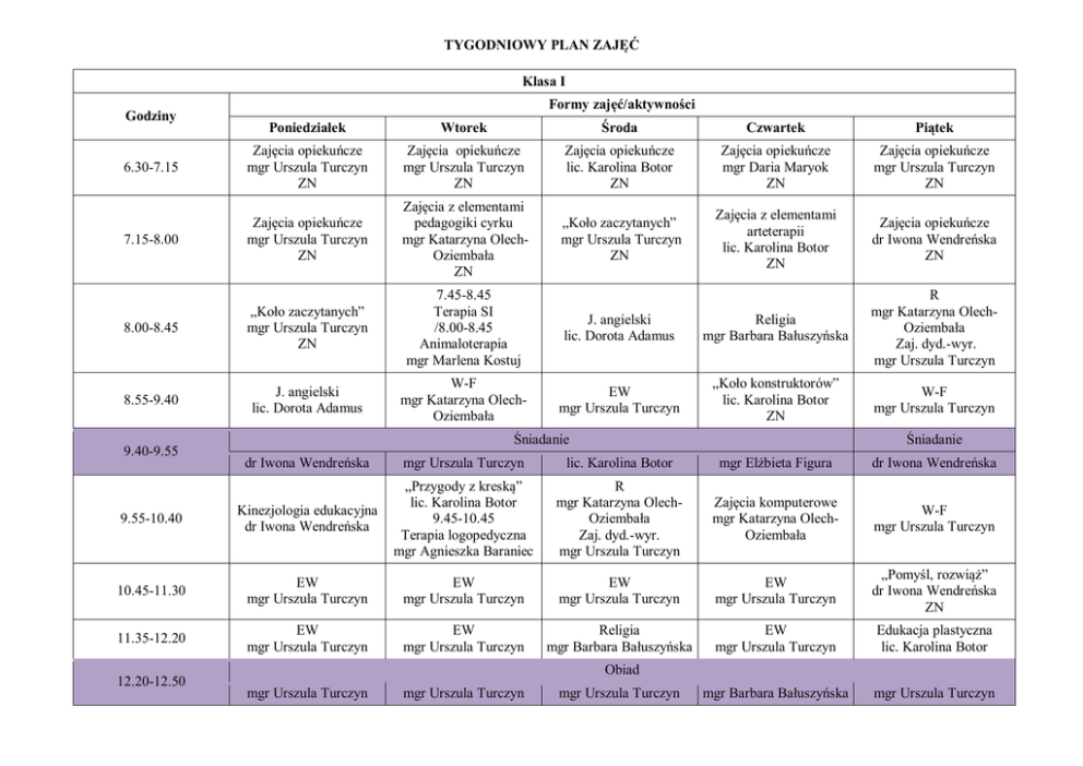 TYGODNIOWY PLAN ZAJĘĆ Klasa I Godziny Formy zajęć/aktywności Poniedziałek Wtorek Środa Czwartek Piątek 6.30-7.15 Zajęcia opiekuńcze mgr Urszula Turczyn ZN Zajęcia opiekuńcze mgr Urszula Turczyn ZN Zajęcia opiekuńcze lic. Karolina Botor ZN Zajęcia opiekuńcze mgr Daria Maryok ZN Zajęcia opiekuńcze mgr Urszula Turczyn ZN 7.15-8.00 Zajęcia opiekuńcze mgr Urszula Turczyn ZN Zajęcia z elementami pedagogiki cyrku mgr Katarzyna OlechOziembała ZN „Koło zaczytanych” mgr Urszula Turczyn ZN Zajęcia z elementami arteterapii lic. Karolina Botor ZN Zajęcia opiekuńcze dr Iwona Wendreńska ZN 8.00-8.45 „Koło zaczytanych” mgr Urszula Turczyn ZN 7.45-8.45 Terapia SI /8.00-8.45 Animaloterapia mgr Marlena Kostuj J. angielski lic. Dorota Adamus Religia mgr Barbara Bałuszyńska R mgr Katarzyna OlechOziembała Zaj. dyd.-wyr. mgr Urszula Turczyn 8.55-9.40 J. angielski lic. Dorota Adamus W-F mgr Katarzyna OlechOziembała EW mgr Urszula Turczyn „Koło konstruktorów” lic. Karolina Botor ZN W-F mgr Urszula Turczyn 9.40-9.55 Śniadanie Śniadanie dr Iwona Wendreńska mgr Urszula Turczyn lic. Karolina Botor mgr Elżbieta Figura dr Iwona Wendreńska 9.55-10.40 Kinezjologia edukacyjna dr Iwona Wendreńska „Przygody z kreską” lic. Karolina Botor 9.45-10.45 Terapia logopedyczna mgr Agnieszka Baraniec R mgr Katarzyna OlechOziembała Zaj. dyd.-wyr. mgr Urszula Turczyn Zajęcia komputerowe mgr Katarzyna OlechOziembała W-F mgr Urszula Turczyn 10.45-11.30 EW mgr Urszula Turczyn EW mgr Urszula Turczyn EW mgr Urszula Turczyn EW mgr Urszula Turczyn „Pomyśl, rozwiąż” dr Iwona Wendreńska ZN 11.35-12.20 EW mgr Urszula Turczyn EW mgr Urszula Turczyn Religia mgr Barbara Bałuszyńska EW mgr Urszula Turczyn Edukacja plastyczna lic. Karolina Botor mgr Barbara Bałuszyńska mgr Urszula Turczyn 12.20-12.50 Obiad mgr Urszula Turczyn mgr Urszula Turczyn mgr Urszula Turczyn 12.50-13.35 EW mgr Urszula Turczyn EW mgr Urszula Turczyn „Koło konstruktorów” lic. Karolina Botor ZN EW mgr Urszula Turczyn Kinezjologia edukacyjna dr Iwona Wendreńska 13.40-14.25 Snoezelen mgr Urszula Turczyn EW mgr Urszula Turczyn „Koło Plastusiów” lic. Karolina Botor ZN Zajęcia opiekuńcze dr I. Wendreńska ZN „Koło zaczytanych” mgr Katarzyna OlechOziembała ZN 14.30-15.15 „Koło Marzycielskich Przyjaciół” dr Iwona Wendreńska ZN Edukacja muzyczna mgr Urszula Turczyn Zajęcia opiekuńcze Koło taneczne dr I. Wendreńska ZN „Papierowe fantazje” lic. Karolina Botor ZN Podwieczorek 15.15-15.25 dr Iwona Wendreńska lic. Karolina Botor mgr Katarzyna OlechOziembała dr Iwona Wendreńska mgr Daria Maryok 15.25-16.10 Ludoterapia mgr Katarzyna OlechOziembała ZN Zajęcia opiekuńcze lic. Karolina Botor ZN Ludoterapia mgr Katarzyna OlechOziembała ZN Zaj. z el. pedagogiki cyrku mgr Katarzyna OlechOziembała ZN Zajęcia opiekuńcze mgr Daria Maryok ZN 16.15-17.00 Zajęcia opiekuńcze lic. Karolina Botor ZN Zajęcia opiekuńcze lic. Karolina Botor ZN Zajęcia opiekuńcze mgr Katarzyna OlechOziembała ZN Zajęcia opiekuńcze mgr Katarzyna OlechOziembała ZN Zajęcia opiekuńcze mgr Daria Maryok ZN