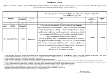 Wójt Gminy Świlcza zgodnie z art. 38 ust. 2 ustawy o gospodarce nieruchomościami informuje, że na tablicy ogłoszeń Urzędu Gminy w Świlczy, 36-72 Świlcza 168 zostało wywieszone ogłoszenie o przetargu ustnym nieograniczonym, który odbędzie się: Przetarg na poniższe nieruchomości odbędzie się w Sali posiedzeń Urzędu Gminy Świlcza, dnia 17-08-2012r. o godz. 1030 Oznaczenie nieruchomości 1 Nr działki Księga Wieczysta 1396 RZ1Z/00074536/1 Powierzchnia nieruchomości Termin I przetargu 2 3 Powierzchnia nieruchomości /ha/ 0,0700 04-06-2012r. Opis nieruchomości Cena wywoławcza w złotych Wadium w złotych 4 5 6 Nieruchomość położona jest w centralnej części wsi Dąbrowa. Sąsiedztwo nieruchomości stanowią działki zabudowane budynkami o funkcji mieszkaniowej. Działka o kształcie nieregularnym, w części ogrodzona i utwardzona o niepełnym uzbrojeniu technicznym. Działka nie posiada dojazdu. Miejscowy Plan ogólny zagospodarowania przestrzennego gm. Świlcza, stracił ważność z dniem 31 grudnia 2003r. W Studium Uwarunkowań i Kierunków Zagospodarowania Przestrzennego Gminy Świlcza wyceniana działka leży w terenie oznaczonym symbolem „M/U” – obszary zabudowane i wskazane do zainwestowania na zasadzie kontynuacji o dominującym przeznaczeniu mieszkaniowym. Nieruchomość jest wolna od obciążeń. 11 550,00 1 100,00. 0,4738 ha 1. Wadium w gotówce w wysokości określonej w powyższym wykazie uczestnicy przetargu winni wpłacić najpóźniej do dnia 13-08-2012r. w kasie Urzędu Gminy w Świlczy lub na rachunek Gminy Świlcza Nr 69915910232005500000260003 w Banku Spółdzielczym w Głogowie Młp. Oddział w Świlczy. Datą dokonania wpłaty jest data uznania rachunku bankowego Gminy Świlcza. 2. Dowodem wniesienia wadium jest potwierdzenie z banku lub kasy Urzędu Gminy. 3. Wadium wpłacone przez uczestnika, który przetarg wygrał zalicza się na poczet ceny nabycia nieruchomości. 4. Osobom, które nie wygrały przetargu, wadium zostanie zwrócone w terminie nie później niż przed upływem 3 dni od dnia odwołania, zamknięcia, unieważnienia lub zakończenia wynikiem negatywnym przetargu. 5. Gmina zawiadomi osobę ustaloną0,4669 jako Nabywca nieruchomości o miejscu i terminie zawarcia umowy sprzedaży najpóźniej w ciągu 21 dni od dnia rozstrzygnięcia przetargu. W przypadku nie stawienia się Nabywcy ha w miejscu i terminie podanym w zawiadomieniu, Wójt Gminy Świlcza może odstąpić od podpisania umowy a wpłacone wadium nie podlega zwrotowi. 6. Sprzedaż następuje za cenę osiągniętą w przetargu. Cena ta płatna jest przed podpisaniem umowy notarialnej, najpóźniej do dnia zawarcia tej umowy. 7. Datą dokonania wpłaty całej kwoty pomniejszonej o wpłacone wadium, jest data uznania rachunku bankowego Gminy Świlcza. 8. Szczegółowe informacje dotyczące przedmiotu sprzedaży można uzyskać w Urzędzie Gminy w Świlczy pokój nr 5, tel. 86-70-148. 9. Wójt Gminy Świlcza zastrzega sobie prawo odstąpienia od przetargu z uzasadnionej przyczyny. 0,2936 ha Wójt Gminy Świlcza ( - ) dr inż. Wojciech Wdowik
