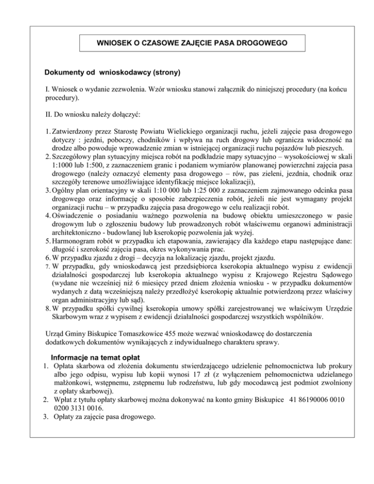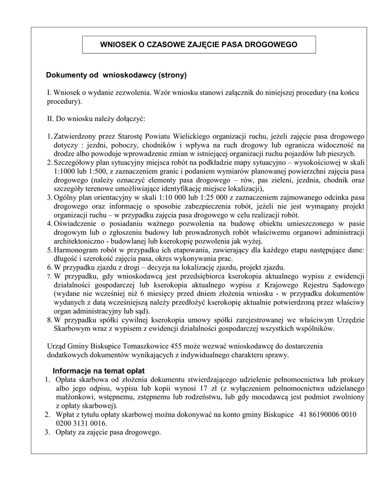 WNIOSEK O CZASOWE ZAJĘCIE PASA DROGOWEGO Dokumenty od wnioskodawcy (strony) I. Wniosek o wydanie zezwolenia. Wzór wniosku stanowi załącznik do niniejszej procedury (na końcu procedury). II. Do wniosku należy dołączyć: 1. Zatwierdzony przez Starostę Powiatu Wielickiego organizacji ruchu, jeżeli zajęcie pasa drogowego dotyczy : jezdni, poboczy, chodników i wpływa na ruch drogowy lub ogranicza widoczność na drodze albo powoduje wprowadzenie zmian w istniejącej organizacji ruchu pojazdów lub pieszych. 2. Szczegółowy plan sytuacyjny miejsca robót na podkładzie mapy sytuacyjno – wysokościowej w skali 1:1000 lub 1:500, z zaznaczeniem granic i podaniem wymiarów planowanej powierzchni zajęcia pasa drogowego (należy oznaczyć elementy pasa drogowego – rów, pas zieleni, jezdnia, chodnik oraz szczegóły terenowe umożliwiające identyfikację miejsce lokalizacji), 3. Ogólny plan orientacyjny w skali 1:10 000 lub 1:25 000 z zaznaczeniem zajmowanego odcinka pasa drogowego oraz informację o sposobie zabezpieczenia robót, jeżeli nie jest wymagany projekt organizacji ruchu – w przypadku zajęcia pasa drogowego w celu realizacji robót. 4. Oświadczenie o posiadaniu ważnego pozwolenia na budowę obiektu umieszczonego w pasie drogowym lub o zgłoszeniu budowy lub prowadzonych robót właściwemu organowi administracji architektoniczno - budowlanej lub kserokopię pozwolenia jak wyżej. 5. Harmonogram robót w przypadku ich etapowania, zawierający dla każdego etapu następujące dane: długość i szerokość zajęcia pasa, okres wykonywania prac. 6. W przypadku zjazdu z drogi – decyzja na lokalizację zjazdu, projekt zjazdu. 7. W przypadku, gdy wnioskodawcą jest przedsiębiorca kserokopia aktualnego wypisu z ewidencji działalności gospodarczej lub kserokopia aktualnego wypisu z Krajowego Rejestru Sądowego (wydane nie wcześniej niż 6 miesięcy przed dniem złożenia wniosku - w przypadku dokumentów wydanych z datą wcześniejszą należy przedłożyć kserokopię aktualnie potwierdzoną przez właściwy organ administracyjny lub sąd). 8. W przypadku spółki cywilnej kserokopia umowy spółki zarejestrowanej we właściwym Urzędzie Skarbowym wraz z wypisem z ewidencji działalności gospodarczej wszystkich wspólników. Urząd Gminy Biskupice Tomaszkowice 455 może wezwać wnioskodawcę do dostarczenia dodatkowych dokumentów wynikających z indywidualnego charakteru sprawy. Informacje na temat opłat 1. Opłata skarbowa od złożenia dokumentu stwierdzającego udzielenie pełnomocnictwa lub prokury albo jego odpisu, wypisu lub kopii wynosi 17 zł (z wyłączeniem pełnomocnictwa udzielanego małżonkowi, wstępnemu, zstępnemu lub rodzeństwu, lub gdy mocodawcą jest podmiot zwolniony z opłaty skarbowej). 2. Wpłat z tytułu opłaty skarbowej można dokonywać na konto gminy Biskupice 41 86190006 0010 0200 3131 0016. 3. Opłaty za zajęcie pasa drogowego. Stawki opłat za zajęcie pasa drogowego dróg powiatowych powiatu wielickiego w celu: 3.1. prowadzenia robót w pasie drogowym w celach niezwiązanych z budową, przebudową, remontem, utrzymaniem i ochroną dróg, 3.2. umieszczania w pasie drogowym urządzeń infrastruktury technicznej niezwiązanych z potrzebami zarządzania drogami lub potrzebami ruchu drogowego, 3.3. umieszczania w pasie drogowym obiektów niezwiązanych z potrzebami zarządzania drogami lub potrzebami ruchu drogowego oraz reklam, 3.4. zajęcia pasa drogowego na prawach wyłączności w celach innych niż wymienione w pkt. 3.1-3.3 Za zajęcie 1m2 powierzchni jezdni pasa drogowego drogi gminnej na terenie gminy Biskupice w celu o którym mowa w pkt 3.1 i 3.4 ustala się następujące stawki opłat za każdy dzień zajęcia: 3.1.1 przy zajęciu jezdni do 50% szerokości – 4.00 zł 3.1.2 przy zajęciu jezdni powyżej 50% do całkowitego zajęcia jezdni – 6.00 zł Stawki określone w 3.1.1 stosuje się także do poboczy, chodników, placów, zatok postojowych i autobusowych i dla pozostałych elementów pasa drogowego za każdy dzień zajęcia 1m 2 pasa drogowego. Przez dzień zajęcia rozumie się także zajęcie pasa drogowego trwające krócej niż 24 godziny. Ustala się następujące stawki opłat rocznych za 1 m2 powierzchni pasa drogowego drogi gminnej na terenie gminy Biskupice zajętego przez rzut poziomy urządzeń, o których mowa w 3.2: 3.2.1 na drogach gminnych z wyjątkiem dróg na obiektach drogowych - 50.00 zł 3.2.2 na obiekcie mostowym – 100.00 zł. Stawki opłaty rocznej za zajęcie pasa drogowego przez umieszczenie w pasie drogowym urządzeń wodociągowych i przyłączy oraz urządzeń i przyłączy kanalizacyjnych za 1 m2 powierzchni rzutu poziomego tych urządzeń i przyłączy wynosi 10,00 zł Za zajęcie 1 m2 pasa drogowego drogi gminnej na terenie gminy Biskupice w celu, o którym mowa w 3.3 ustala się następujące stawki opłat za każdy dzień zajęcia: 3.3.1 za 1 m2 pasa drogowego zajętego przez rzut poziomy obiektu handlowego lub usługowego 2.00 zł 3.3.2 za 1 m2 powierzchni reklamy - 3.00 zł Za zajęcie pasa drogowego o powierzchni mniejszej niż 1 m2 lub powierzchni pasa drogowego zajętej przez rzut poziomy obiektu budowlanego lub urządzenia mniejszej niż 1 m2 stosuje się stawki takie jak za zajęcie 1 m2 pasa drogowego. Forma załatwienia Decyzja administracyjna wydana przez Wójta Gminy Biskupice Przewidywany termin załatwienia Do 30 dni od dnia złożenia kompletu wymaganych dokumentów. Informacje na temat trybu odwoławczego Od decyzji służy odwołanie do Samorządowego Kolegium Odwoławczego za pośrednictwem Wójta Gminy Biskupice w terminie 14 dni od dnia otrzymania decyzji. Podstawa prawna 1. Art. 40 ustawy z dnia 21 marca 1985 r. o drogach publicznych (tekst jednolity Dz.U. 2016 poz. 1440 z późniejszymi zmianami). 2. §1 i § 2 Rozporządzenia Rady Ministrów z dnia 1 czerwca 2004 r. w sprawie określenia warunków udzielania zezwoleń na zajęcie pasa drogowego (tekst jedno