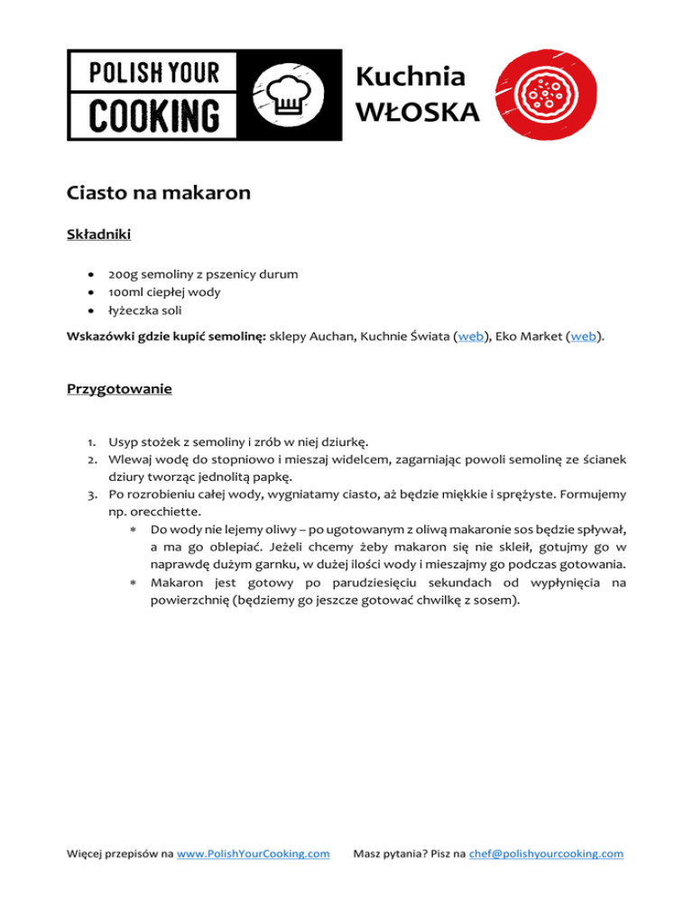 Kuchnia WŁOSKA Ciasto na makaron Składniki 200g semoliny z pszenicy durum 100ml ciepłej wody łyżeczka soli Wskazówki gdzie kupić semolinę: sklepy Auchan, Kuchnie Świata (web), Eko Market (web). Przygotowanie 1. Usyp stożek z semoliny i zrób w niej dziurkę. 2. Wlewaj wodę do stopniowo i mieszaj widelcem, zagarniając powoli semolinę ze ścianek dziury tworząc jednolitą papkę. 3. Po rozrobieniu całej wody, wygniatamy ciasto, aż będzie miękkie i sprężyste. Formujemy np. orecchiette. Do wody nie lejemy oliwy – po ugotowanym z oliwą makaronie sos będzie spływał, a ma go oblepiać. Jeżeli chcemy żeby makaron się nie skleił, gotujmy go w naprawdę dużym garnku, w dużej ilości wody i mieszajmy go podczas gotowania. Makaron jest gotowy po parudziesięciu sekundach od wypłynięcia na powierzchnię (będziemy go jeszcze gotować chwilkę z sosem). Więcej przepisów na www.PolishYourCooking.com Masz pytania? Pisz na [email protected] Pasta Carbonarra Składniki 50 gr pancetty (lub wędzony surowy boczek) 20 g pecorino, 20 g parmezanu, 2 jajka, 2 ząbki czosnku, 25 ml oliwy, łyżeczka soli, łyżeczka pieprzu, pół łyżczki soli opcjonalnie natka pietruszki Przygotowanie 1. Pokrój boczek w kostkę. 2. Zetrzyj na tarce sery Pecorino i Parmezan (użyj połowy do sosu, drugiej zaś do posypania gotowej potrawy). 3. Podgrzej w dużym garnku oliwę na średnim ogniu i podsmaż na niej zgnieciony czosnek (razem z jego skórką). Wyjmij czosnek gdy będzie miękki, usuń skórkę i zgnieć czosnek. Odłóż na później. 4. Dodaj boczek do oliwy. Smaż ok 3 minuty, aż boczek będzie kruchy. 5. Wymieszaj dokładnie jajka w misce. Dodaj do nich pieprz i starty ser wolno mieszając. 6. Wrzuć odsączony makaron na patelnie z boczkiem nieustannie mieszając. 7. Dodaj trochę wody z gotowania makaronu na patelnię. 8. Zdejmij patelnię z ognia i odczekaj chwilę by makaron nieco ostygł. 9. Dodaj miksturę jajeczno-serowa, wymieszaj delikatnie uważając żeby jajka się nie ścięły. 10. Podawaj natychmiast z serem i ewentualnie z posiekaną natką pietruszki. Buon appetito! Więcej przepisów na www.PolishYourCooking.com Masz pytania? Pisz na [email protected]