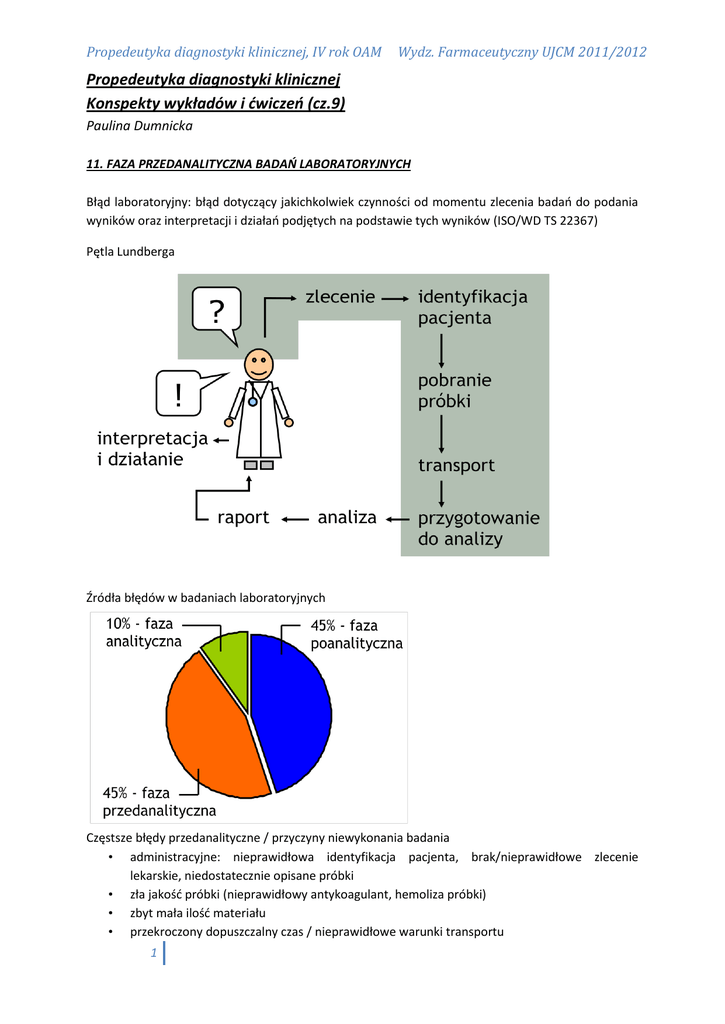 Propedeutyka diagnostyki klinicznej, IV rok OAM Wydz. Farmaceutyczny UJCM 2011/2012 Propedeutyka diagnostyki klinicznej Konspekty wykładów i ćwiczeń (cz.9) Paulina Dumnicka 11. FAZA PRZEDANALITYCZNA BADAŃ LABORATORYJNYCH Błąd laboratoryjny: błąd dotyczący jakichkolwiek czynności od momentu zlecenia badań do podania wyników oraz interpretacji i działań podjętych na podstawie tych wyników (ISO/WD TS 22367) Pętla Lundberga Źródła błędów w badaniach laboratoryjnych Częstsze błędy przedanalityczne / przyczyny niewykonania badania • administracyjne: nieprawidłowa identyfikacja pacjenta, brak/nieprawidłowe zlecenie lekarskie, niedostatecznie opisane próbki • zła jakość próbki (nieprawidłowy antykoagulant, hemoliza próbki) • zbyt mała ilość materiału • przekroczony dopuszczalny czas / nieprawidłowe warunki transportu 1 Propedeutyka diagnostyki klinicznej, IV rok OAM Wydz. Farmaceutyczny UJCM 2011/2012 Wielkość błędu przedanalitycznego Niestabilność – miara niezgodności między wynikiem uzyskanym po określonym czasie przechowywania próbki w określonych warunkach a wynikiem uzyskanym w czasie 0 Największa dopuszczalna niestabilność jest równa dopuszczalnej nieprecyzyjności pomiaru. Źródła zmienności przedanalitycznej • czynniki biologiczne (wiek, płeć, rasa/grupa etniczna, ciąża, stan metaboliczny i choroby pacjenta, stosowane leczenie) • czynniki środowiskowe (pora roku, pora dnia) • nawyki, nałogi pacjenta (dieta, palenie tytoniu, kofeina, alkohol; wysiłek fizyczny) • czynniki związane z pobraniem materiału (probówki i igły użyte do pobrania, rodzaj antykoagulantu, czas utrzymywania stazy, pozycja ciała przed i w czasie pobrania próbki) • czynniki związane z transportem i przechowywaniem materiału (czas, temperatura transportu; przechowywanie pełnej krwi, surowicy/osocza, warunki przechowywania) • czynniki związane z przygotowaniem materiału do badania (sposób wirowania) Standaryzacja fazy przedanalitycznej – trudna, wymaga wypracowania SOP-ów i edukacji personelu (pielęgniarek, lekarzy, osób odpowiedzialnych za transport próbek) Procedury powinny obejmować: • sposób przygotowania pacjenta do badań (badania w godzinach rannych, na czczo, bez używek, ograniczenie wysiłku fizycznego, ograniczenie wpływu leków…) • sposób identyfikacji pacjenta (co najmniej dwa „identyfikatory”, np. nazwisko + PESEL), oznakowanie pobranych próbek itp. • sposób pobrania materiału (wybór i właściwa dezynfekcja miejsca pobrania, postępowanie w przypadku pacjentów z trudnym dostępem do żył – sposób pobrania krwi z założonych wkłuć; jak najkrótsze utrzymywanie stazy, użycie właściwych probówek i igieł – systemy zamknięte, prawidłowa kolejność napełniania probówek, określenie ilości materiału potrzebnej do wykonania poszczególnych badań, właściwe wymieszanie próbek po pobraniu…) • sposób transportu (m.in. określenie nieprzekraczalnego czasu i warunków transportu) • sposób przygotowania materiału do badań (m.in. warunki wirowania próbek) Kolejność napełniania probówek (wg CSLI, dawniej NCCLS): 1. posiewy 2. probówka z cytrynianem 3. probówka „na skrzep” (może zawierać aktywator krzepnięcia) 4. probówka z heparyną 5. probówka z EDTA 6. probówka z fluorkiem sodu Wpływ substancji interferujących na wyniki badań laboratoryjnych Różnica (obciążenie) wynikająca z interferencji: procentowa różnica między wynikiem uzyskanym w próbce z substancją interferującą a wynikiem uzyskanym w próbce bez tej substancji Największa dopuszczalna różnica wynikająca z interferencji jest równe dopuszczalnemu obciążeniu. 2 Propedeutyka diagnostyki klinicznej, IV rok OAM Wydz. Farmaceutyczny UJCM 2011/2012 Hemoliza Lizie mogą ulec erytrocyty, leukocyty (np. u pacjentów z białaczką), płytki (np. w związku z aktywacją płytek); do hemolizy dochodzi łatwiej w czasie krzepnięcia krwi (wpływ na wyniki większy przy badaniach wykonywanych w surowicy niż w osoczu). Czerwone zabarwienie osocza lub surowicy może nie być widoczne (stężenie Hb <(100) 300mg/l, „hemoliza bez hemolizy” – zbyt długie przechowywanie pełnej krwi, liza krwinek innych niż erytrocyty). Hemoliza in vitro: Hb, K+, LDH i AspAT przy prawidłowej haptoglobinie i liczbie retikulocytów Hemoliza in vivo: Hb i LDH, niewielki K+, brak Hb przy haptoglobiny, bezpośredniej bilirubiny i retikulocytów Zbyt długie przechowywanie pełnej krwi: brak Hb i LDH, K+ Mechanizmy interferncji w przypadku hemolizy: LDH stężenie w erytrocytach 160 x wyższe niż w osoczu / surowicy AspAT stężenie w erytrocytach 40 x wyższe niż w osoczu / surowicy potas stężenie w erytrocytach 25 x wyższe niż w osoczu / surowicy AlAT żelazo stężenie w erytrocytach 7 x wyższe niż w osoczu / surowicy hem zawiera żelazo, ale jest ono na tyle silnie związane, że nie będzie zmierzone rutynową metodą interferencja optyczna (max. absorbancji Hb = 417 nm – tzw. pasmo Soreta) różne oznaczenia spektrofotometryczne bilirubina aktywność peroksydazowa Hb (>800 mg/l) hamuje tworzenie barwnika azowego w met. Jendrassika-Grófa CK i CKMB kinaza adenylowa uwolniona z erytrocytów zawyża aktywność mierzoną enzymatycznie lipaza Hb hamuje jej aktywność oznaczenia różnorodne interferencje substancji wewnątrzkomórkowych immunochemiczne Lipemia • zmętnienie surowicy / osocza spowodowane zwiększonym stężeniem lipoprotein, głównie chylomikronów i VLDL, które zawierają stosunkowo dużo triglicerydów 3 Propedeutyka diagnostyki klinicznej, IV rok OAM Wydz. Farmaceutyczny UJCM 2011/2012 • o ile próbka nie została pobrana wkrótce po posiłku (1-4 godz.), lipemia jest zjawiskiem patologicznym – laboratorium powinno o niej poinformować lekarza • zmętnienie jest widoczne w pełnej krwi przy stężeniu TG > 1000 mg/dl (11,3 mmol/l) • zmętnienie surowicy / os